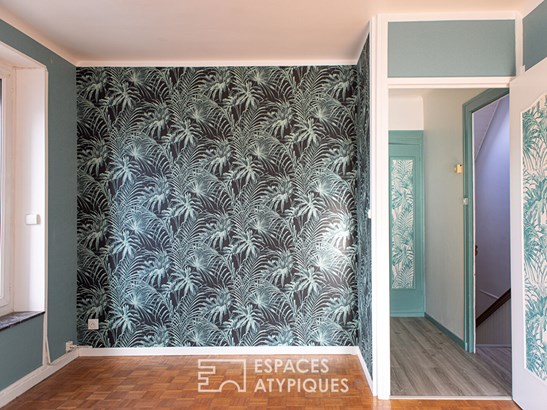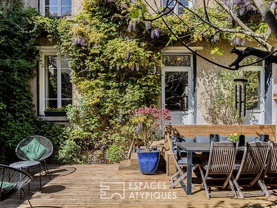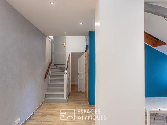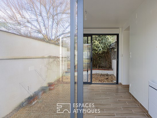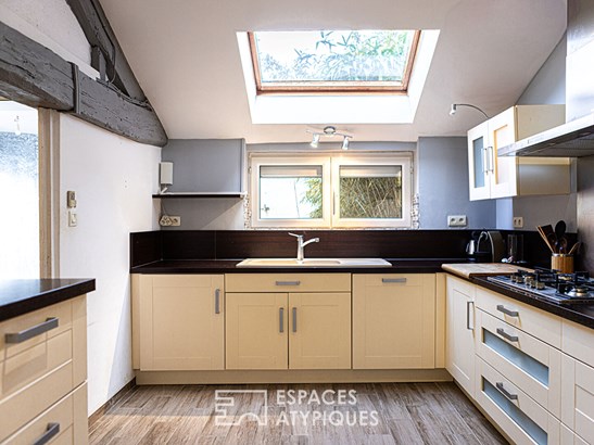 Below, separated by a few steps, a dining area ideal for family moments is added to a fitted and equipped kitchen. This side of the house offers access to the garden and a terrace via a glass room ideal for relaxation.