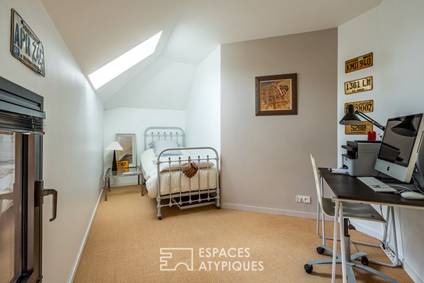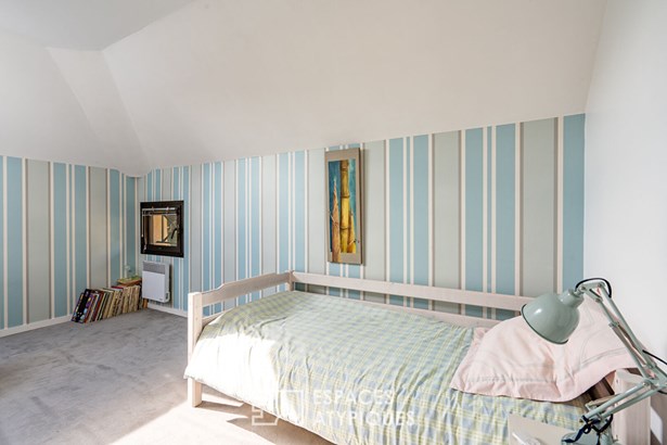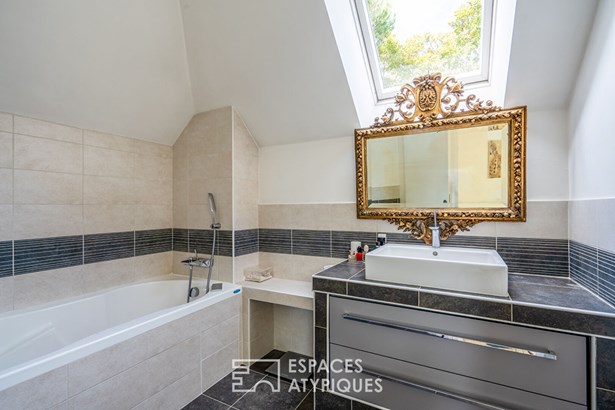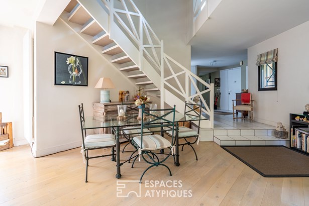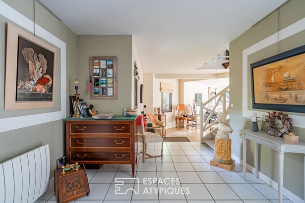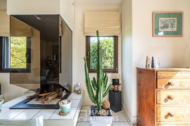 The entrance leads to the bright kitchen overlooking its beautiful green spaces, or, after a flight of stairs, to the dining room and its superb 57 m2 living room with its beautiful Boley fireplace, surrounded by greenery and opening onto the pleasant south-facing terrace.
