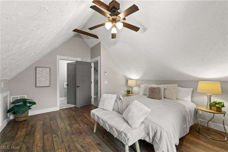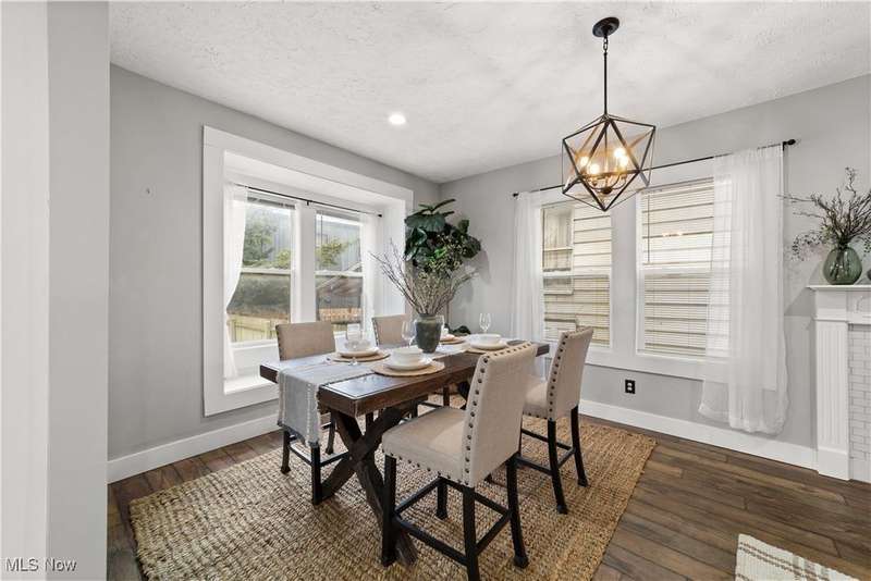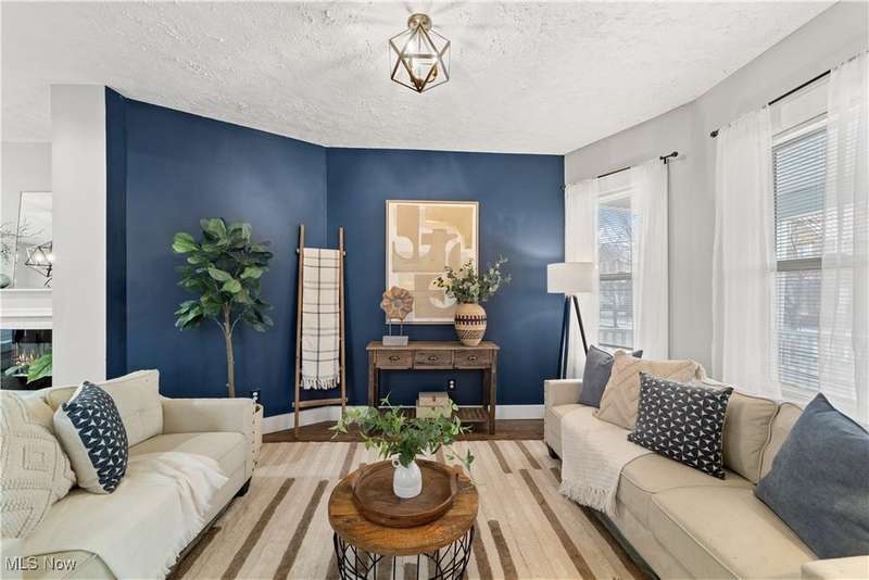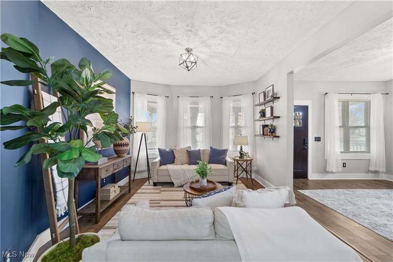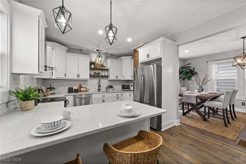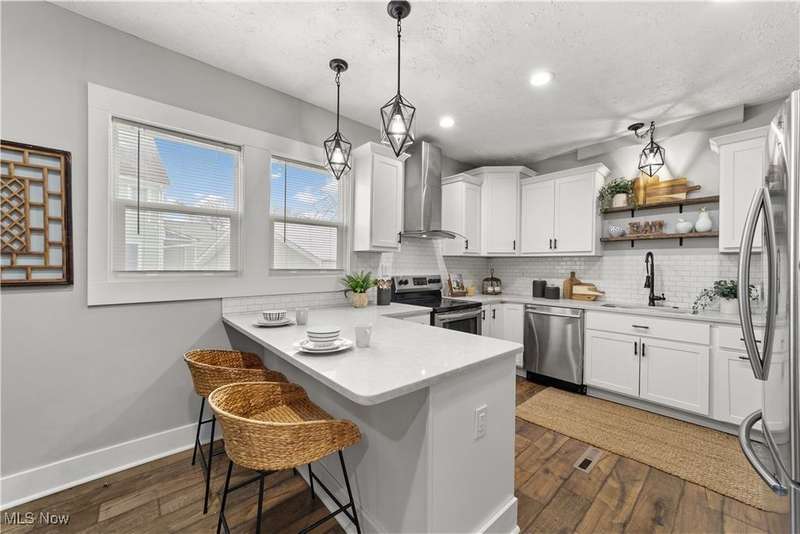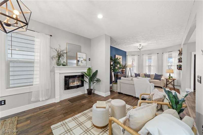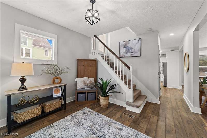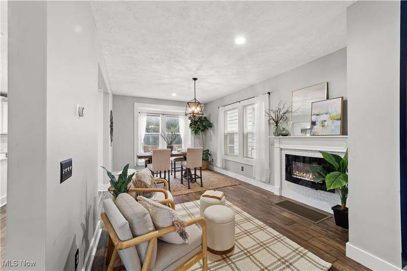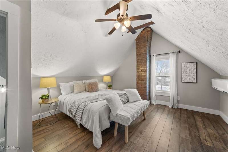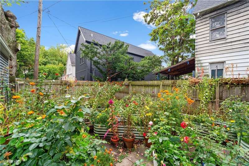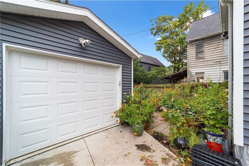 Discover this beautifully renovated colonial in the heart of Gordon Square! Fully gutted and renovated in 2018, the home has additional recent upgrades, including a new top-of-the-line 1-car garage (2022), mini-split AC in the third-floor primary suite (2022), a new water heater (2024), and a fully-fenced in backyard ready for an aspiring DIY gardener with abundant raised beds. The large front porch invites you into a bright sitting room that flows into the cozy living and dining rooms, boasting North and South-facing windows, handcrafted wood shelving, and a mantle with an electric fireplace. The custom eat-in kitchen impresses with exposed brick, white shaker cabinets, Quartz countertops, a subway tile backsplash, stainless steel appliances, and Antique Hickory flooring. A charming half bath with honeycomb tile completes the main level. The second floor includes three bedrooms, a laundry room, and a full bath with oversized subway tile and marble counters. The third-floor primary suite stuns with vaulted ceilings, wood beams, exposed brick, and a luxurious bath featuring porcelain tile, a tub surround, and a spacious walk-in closet. Every mechanical system has been updated, including plumbing, electrical, insulation, furnace, and central AC. Enjoy coffee on the front porch or enjoy the fenced backyard garden oasis. With a new concrete driveway and garage, maintenance is worry-free. Just minutes from Gordon Square Arts District and Edgewater Park, this home offers prime access to shopping, dining, and entertainment. Fall in love today!