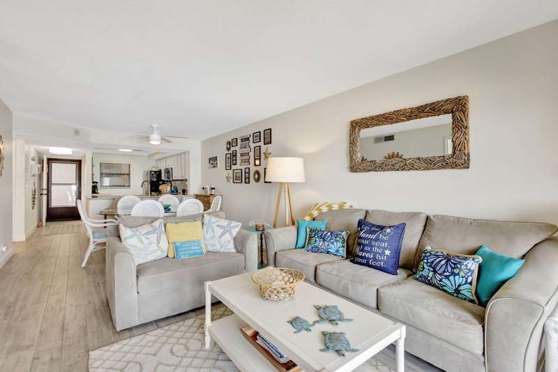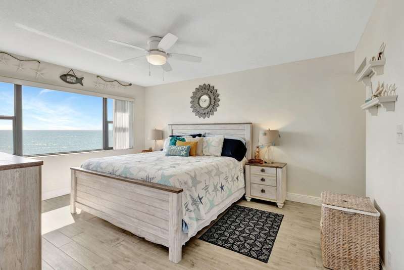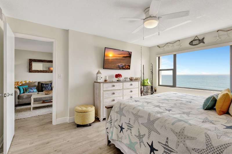 Stunning 4th-floor property features breathtaking views of the ocean. Fully furnished with stylish decor, ceiling fans in every room for comfort, coffee bar with Nespresso n frother machine, master offers a new king mattress, large window with picturesque views of the ocean, spacious walk-in closet and shower, cozy balcony perfect for enjoying your morning coffee with the sunrise. Amenities include: Gated entry for security, clubhouse for social gatherings, pickleball, heated pool, private access to the beach. Electrical included up to $100.