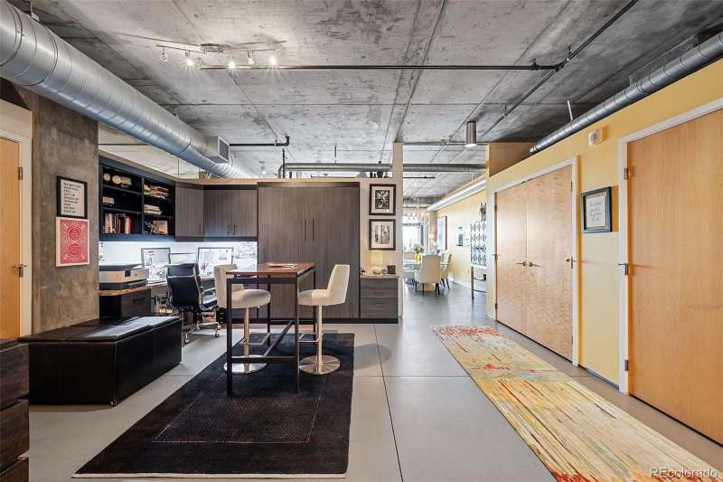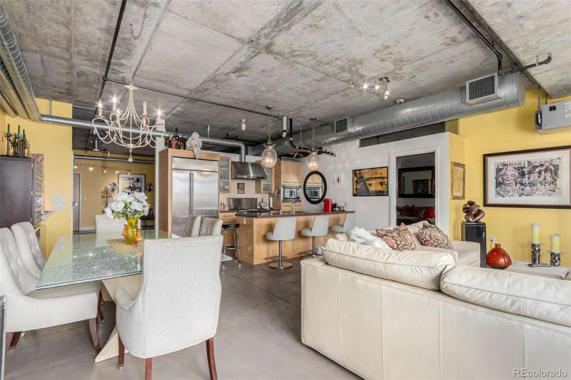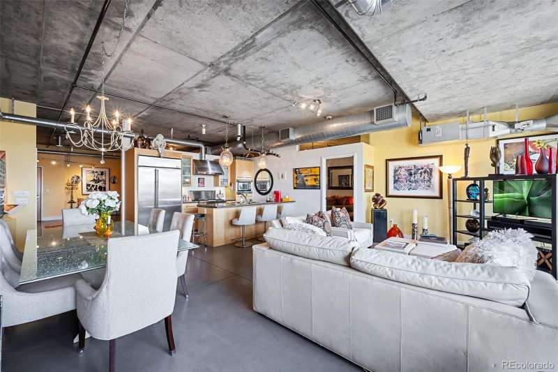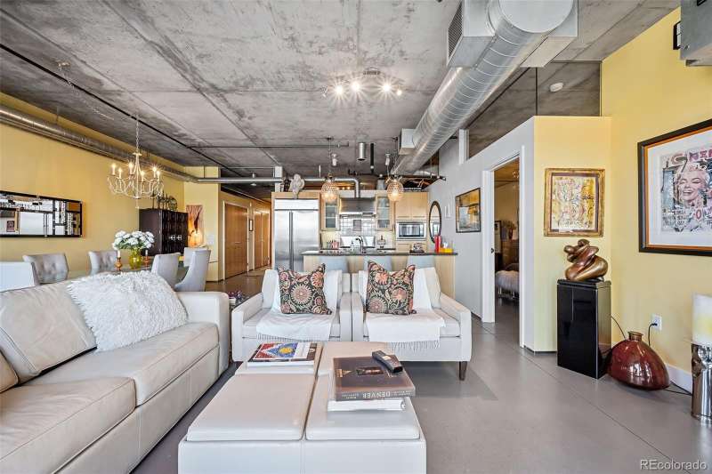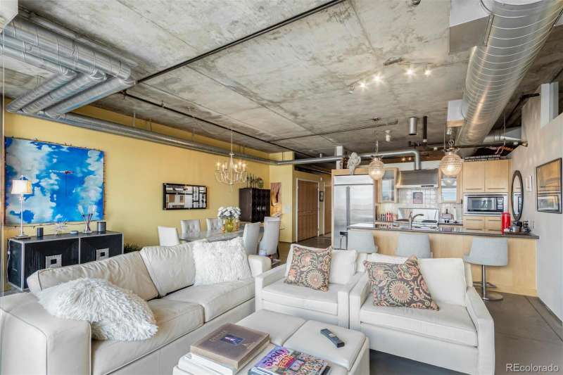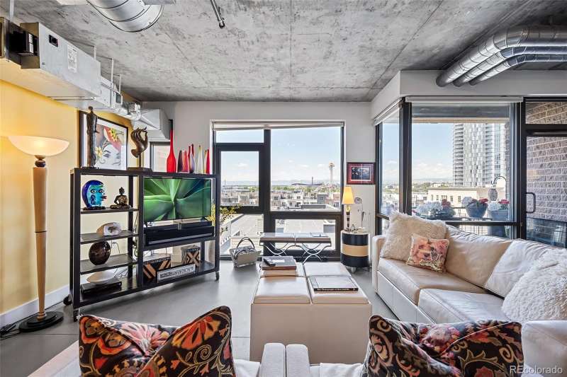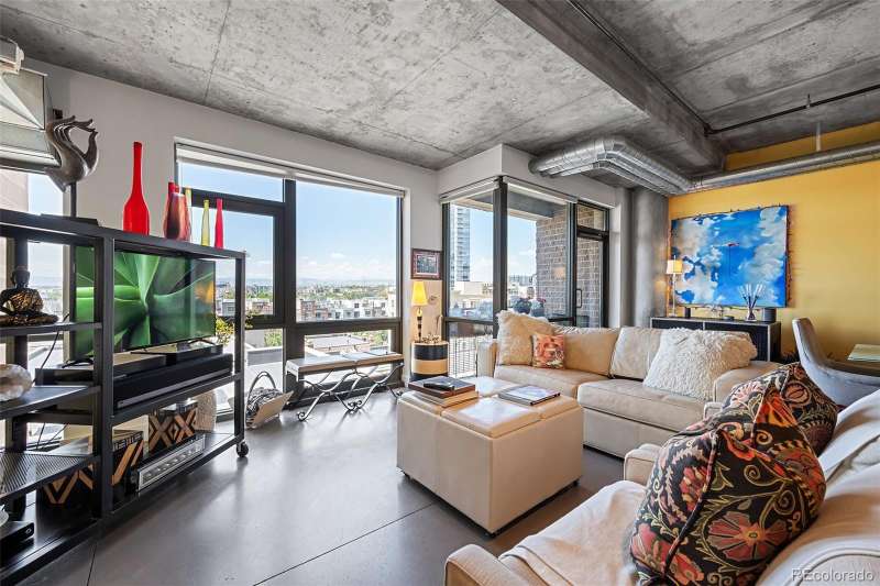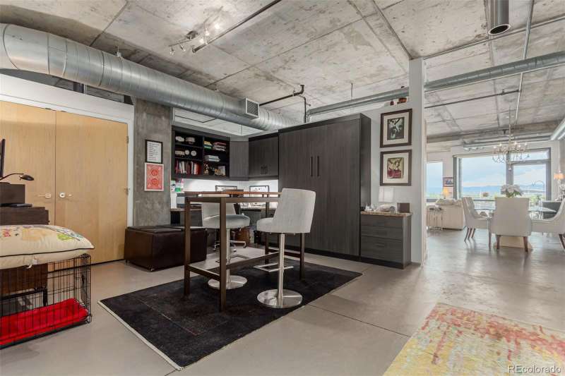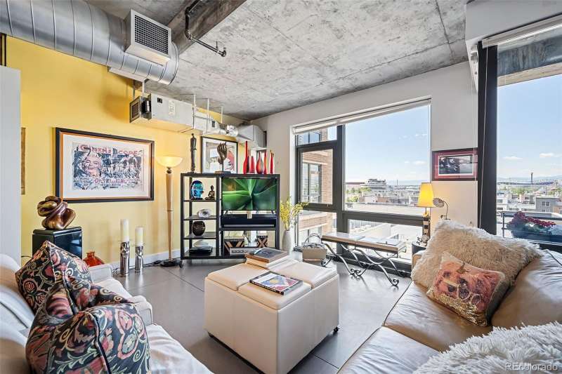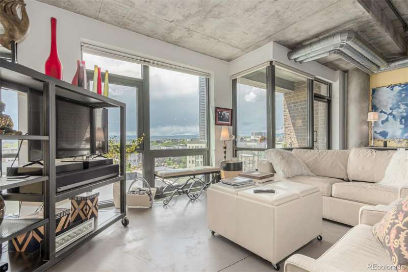 Luxury and convenience converge seamlessly in this exceptional loft residence - a true sanctuary in the heart of Denver's premier downtown neighborhood Riverfront Park. Discover coveted southwestern mountain views from the comfort of your expansive living areas, which are ideal for both relaxing and entertaining guests. The eat-in kitchen is a chef's delight featuring a center island and upgraded penthouse quality stainless steel appliances. Ten-foot ceilings frame expansive walls, providing the perfect backdrop for showcasing your personal art collection. The spacious primary bedroom suite offers a luxurious 5-piece bath with jetted soaking tub, while the second bedroom, with a convenient built-in murphy bed, easily adapts to an office/study area. Custom closet built-ins throughout provide great, organized storage. Includes 1 parking space in secure underground garage. The building has recently installed a new ButterflyMX secure, remote, entry system and Riverfront Park has a 24/7 security team. This exquisite loft offers a prime location in Riverfront Park adjacent to Commons Park and miles of walking and biking trails.