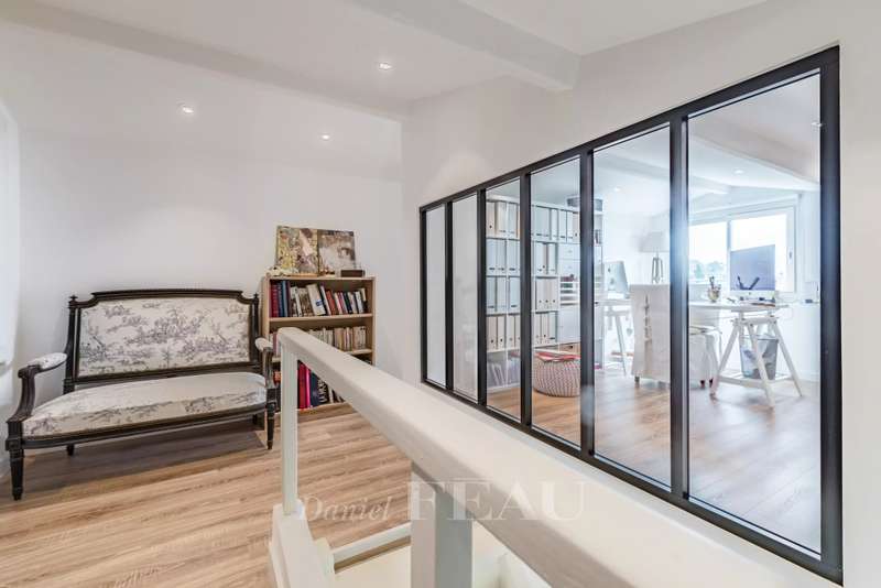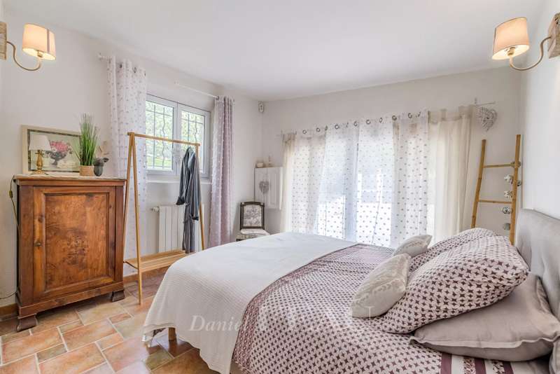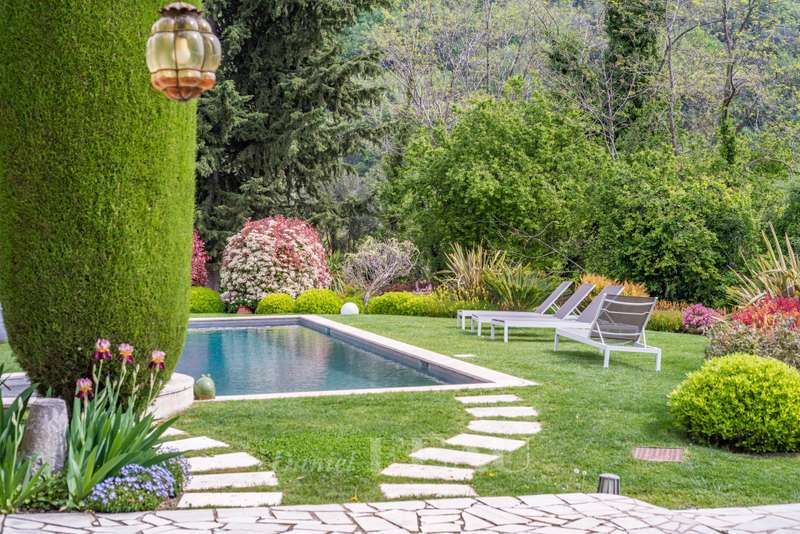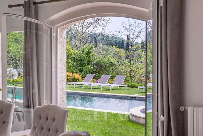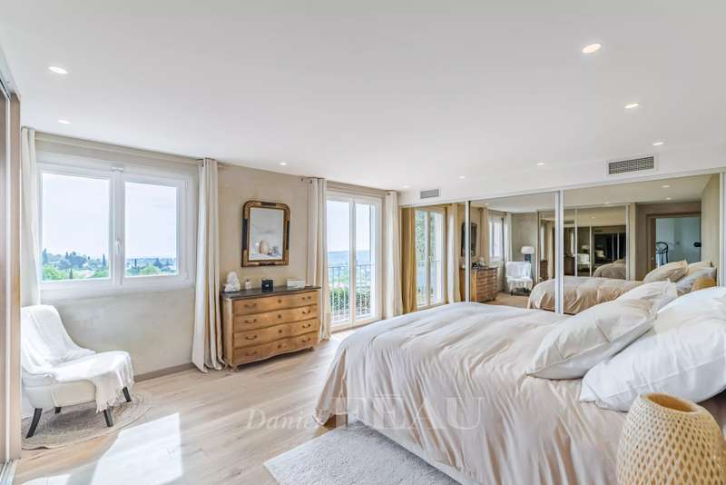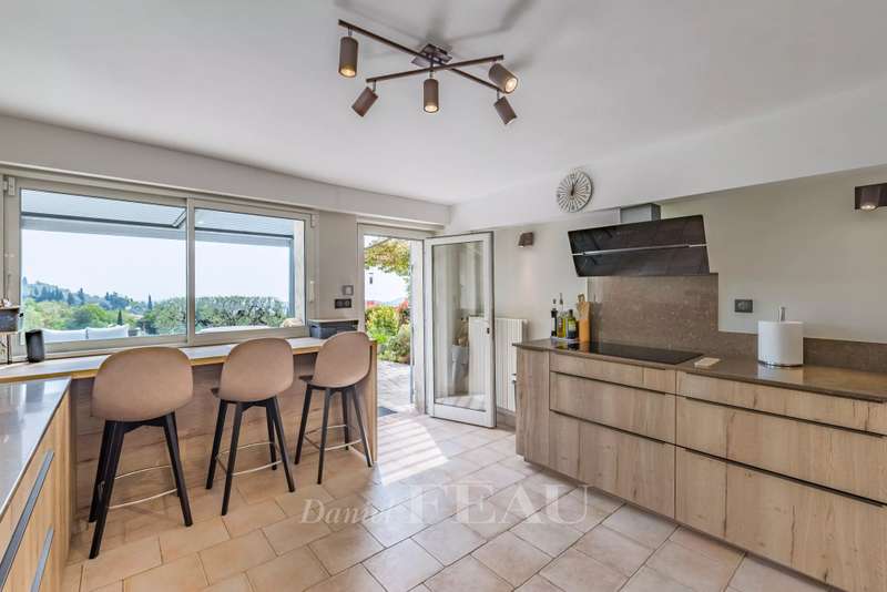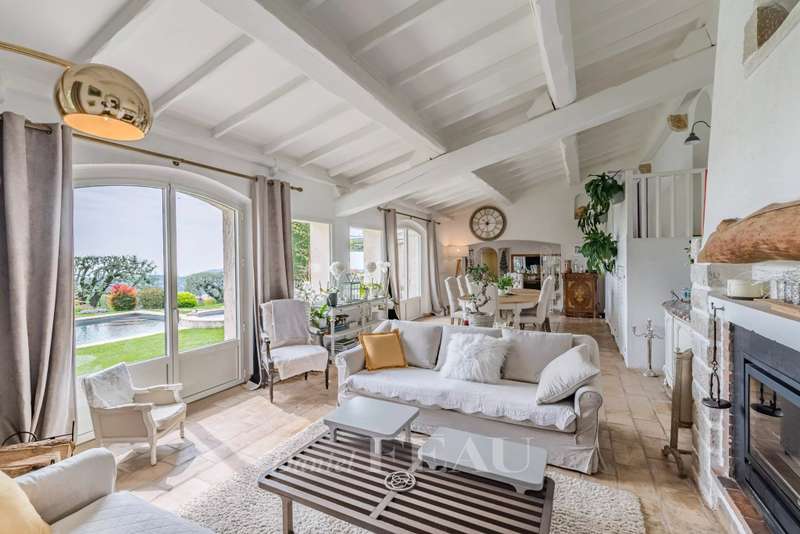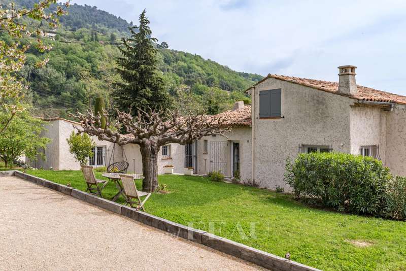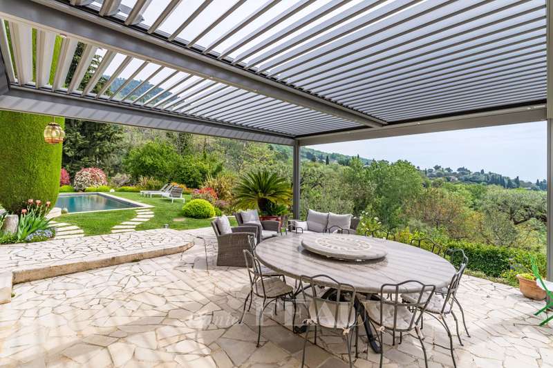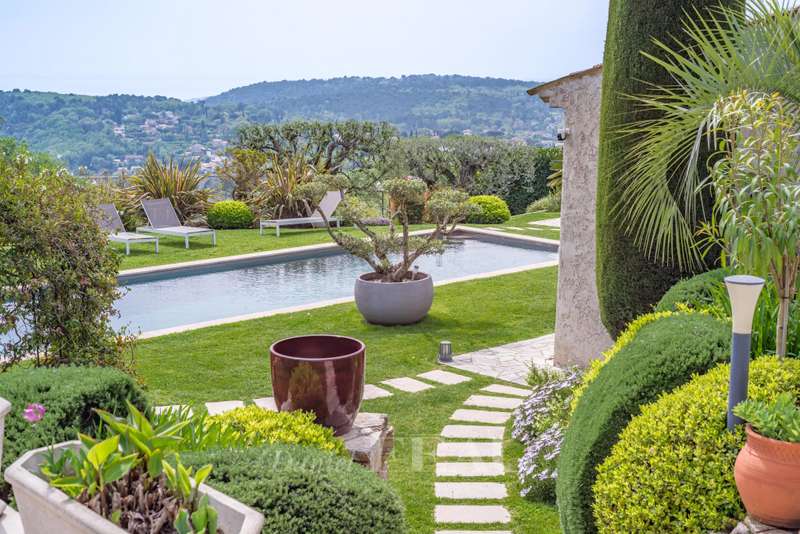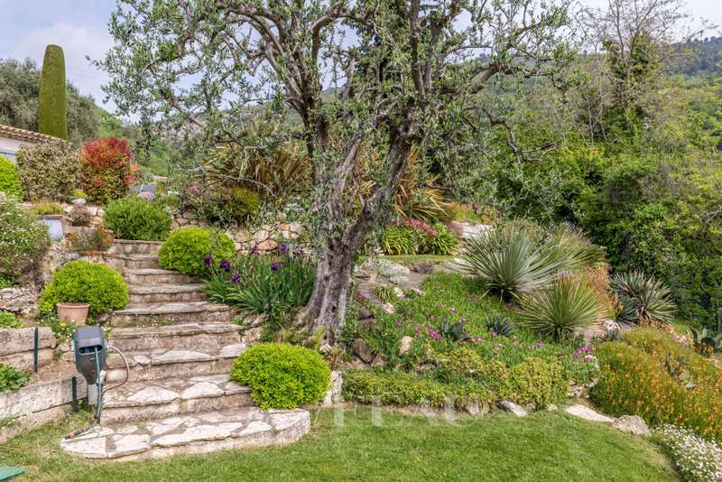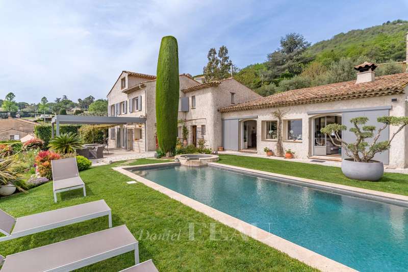 This peaceful and elegant mid 1970’s property set in 7439 sqm of landscaped grounds is in a residential neighbourhood in an elevated setting just 8 minutes from Vence and 25 minutes from Nice Airport. South-facing and commanding a panoramic view of the sea and the countryside, it offers 230 sqm of renovated living space including a spacious living/reception room and dining room with a fireplace and wide patio windows, a kitchen with a pantry, a bedroom with a bathroom. The kitchen opens onto a heated pergola. Upstairs are a bedroom with a shower room, a library area, a fitness room, a shower room, a bright and spacious master suite commanding a sea view, and with a staircase accessing a study or possible further bedroom. The property is very well-maintained and in excellent condition. With a heated swimming pool, a jacuzzi and a large garage. A building permit has been applied for to create a 130 sqm guest house. The grounds are planted with fruit and olive trees, and benefits from a boules pitch.