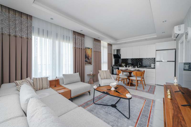 Apartments for sale in Alanya are situated 550 m from the sea and beach, 600 m from the market, pharmacy, school, restaurant, and cafe, 7.9 km from Alanyum shopping center, 10 km from the center of Alanya, and 28 km from Gazipasa Airport.