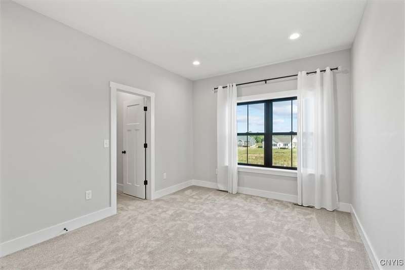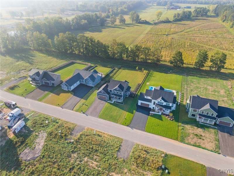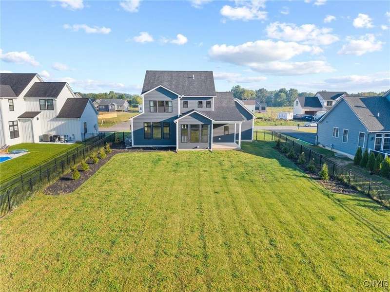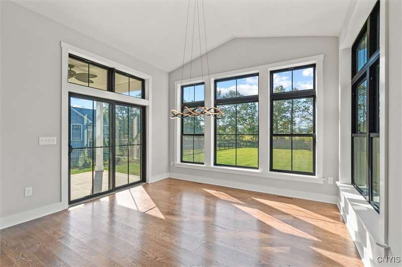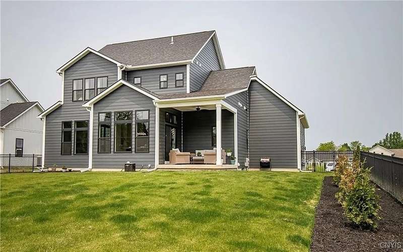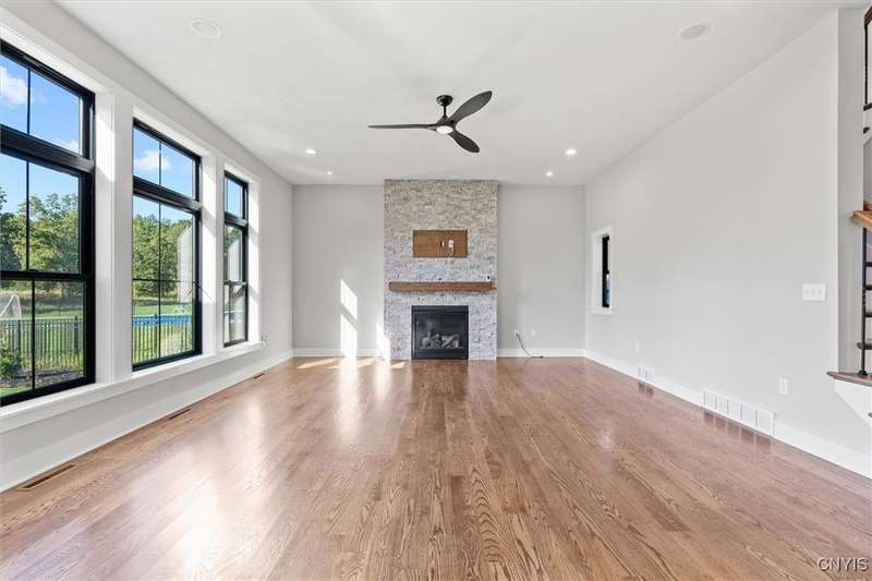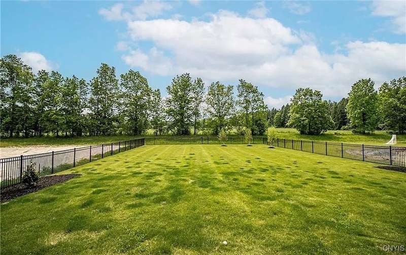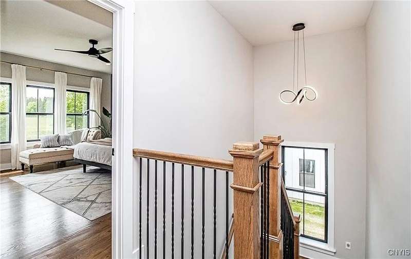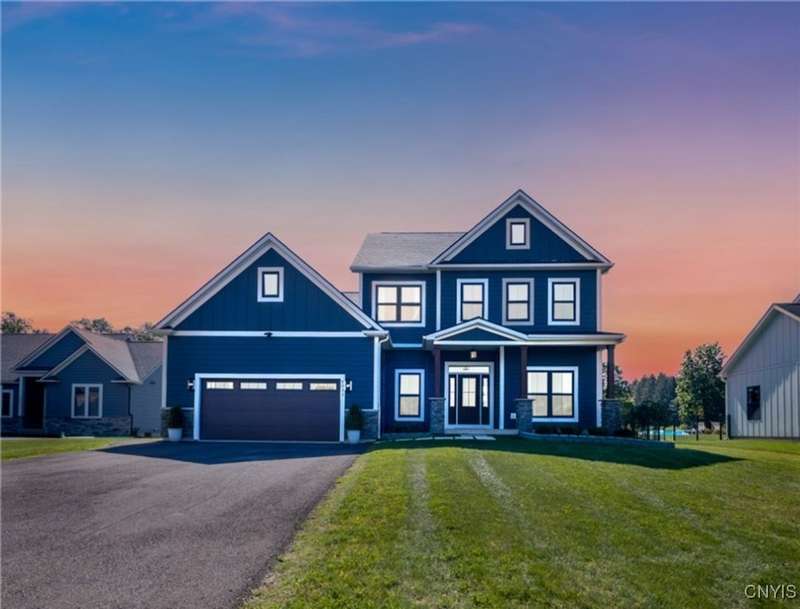 Experience refined living in this Timber Banks residence, where every detail reflects quality and sophistication. This beautiful and nearly new 3-bedroom, 3-bath home stands apart with its soaring 10-foot ceilings, expansive 7-foot windows that flood the first floor with natural light, and striking black exterior and interior window trim that creates a bold, modern aesthetic.At the heart of the home, the chef's kitchen makes a statement with cabinetry extending to the full 10-foot ceiling, a dramatic 10-foot granite island, hidden walk-in pantry, and spacious morning room area designed for both daily living and elegant entertaining. The open concept flows into a great room anchored by a breathtaking floor-to-ceiling stone fireplace, the perfect setting for gatherings both large and intimate. Throughout the first floor, rich hardwood floors add warmth and continuity, elevating the overall sense of luxury.Upstairs, the primary suite offers a private retreat with a spa-inspired bath and generous walk-in closet. Two additional bedrooms and a second full bath with quartz finishes provide comfort for family or guests. The lower level, featuring an egress window and plumbing for an additional bath, presents the opportunity to expand with a future rec room, gym, or guest suite.Outdoor spaces were designed with both curb appeal and relaxation in mind ? a welcoming covered front porch, and a second covered porch overlooking a fully fenced, landscaped yard that is over a half an acre.The oversized garage provides additional convenience with a workshop area and EV charging capabilities (charger required).Situated in the sought-after Timber Banks community, you'll enjoy a lifestyle unlike any other with access to Central New York's only Nicklaus Design golf course, a marina along the Seneca River, scenic walking trails, and a vibrant clubhouse restaurant.8033 Forest Ridge Lane is more than a home ? it's a statement of style, comfort, and luxury. Move right in and start enjoying the lifestyle you've been waiting for.