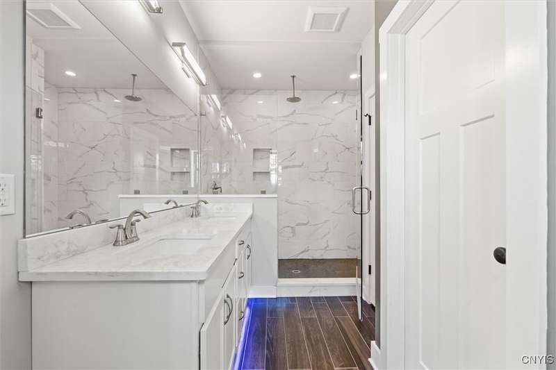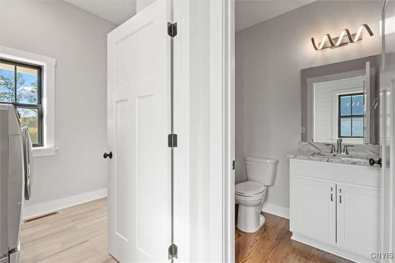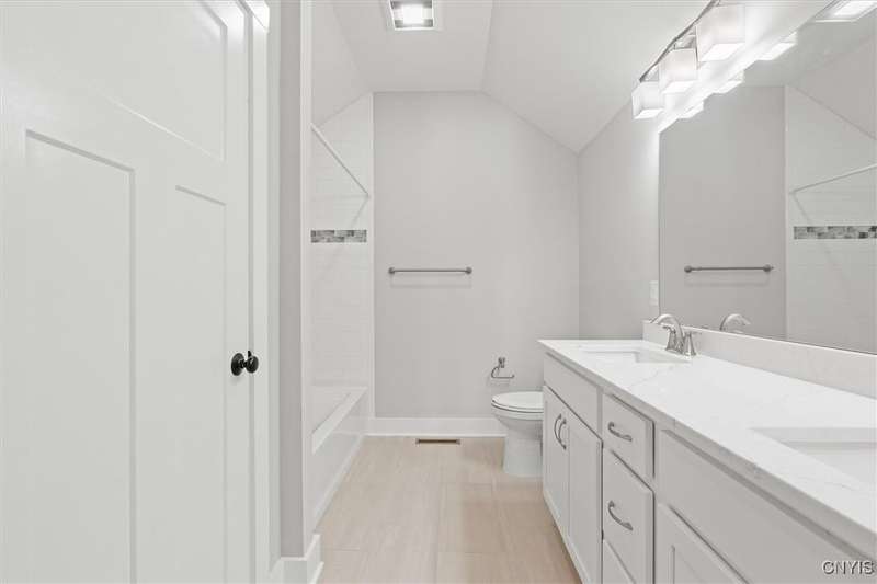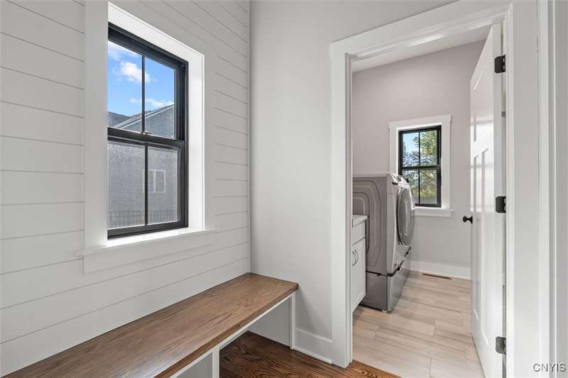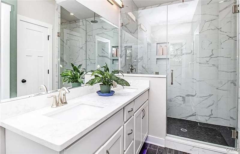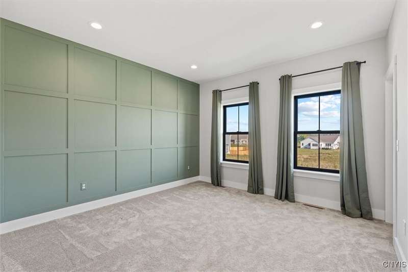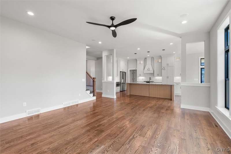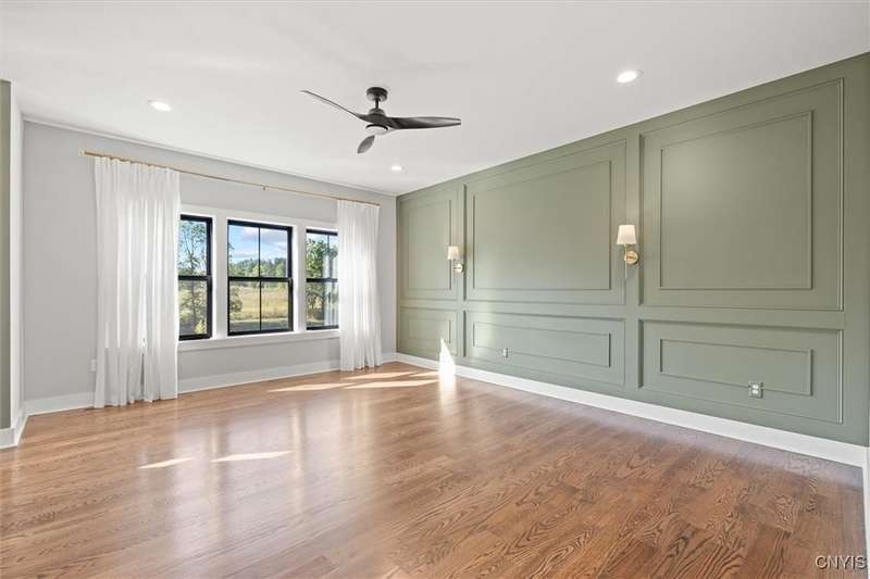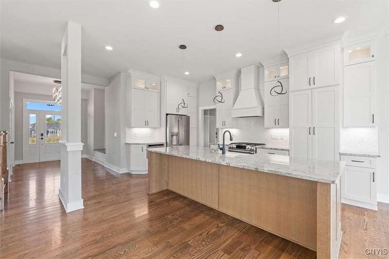 Experience refined living in this Timber Banks residence, where every detail reflects quality and sophistication. This beautiful and nearly new 3-bedroom, 3-bath home stands apart with its soaring 10-foot ceilings, expansive 7-foot windows that flood the first floor with natural light, and striking black exterior and interior window trim that creates a bold, modern aesthetic.At the heart of the home, the chef's kitchen makes a statement with cabinetry extending to the full 10-foot ceiling, a dramatic 10-foot granite island, hidden walk-in pantry, and spacious morning room area designed for both daily living and elegant entertaining. The open concept flows into a great room anchored by a breathtaking floor-to-ceiling stone fireplace, the perfect setting for gatherings both large and intimate. Throughout the first floor, rich hardwood floors add warmth and continuity, elevating the overall sense of luxury.Upstairs, the primary suite offers a private retreat with a spa-inspired bath and generous walk-in closet. Two additional bedrooms and a second full bath with quartz finishes provide comfort for family or guests. The lower level, featuring an egress window and plumbing for an additional bath, presents the opportunity to expand with a future rec room, gym, or guest suite.Outdoor spaces were designed with both curb appeal and relaxation in mind ? a welcoming covered front porch, and a second covered porch overlooking a fully fenced, landscaped yard that is over a half an acre.The oversized garage provides additional convenience with a workshop area and EV charging capabilities (charger required).Situated in the sought-after Timber Banks community, you'll enjoy a lifestyle unlike any other with access to Central New York's only Nicklaus Design golf course, a marina along the Seneca River, scenic walking trails, and a vibrant clubhouse restaurant.8033 Forest Ridge Lane is more than a home ? it's a statement of style, comfort, and luxury. Move right in and start enjoying the lifestyle you've been waiting for.