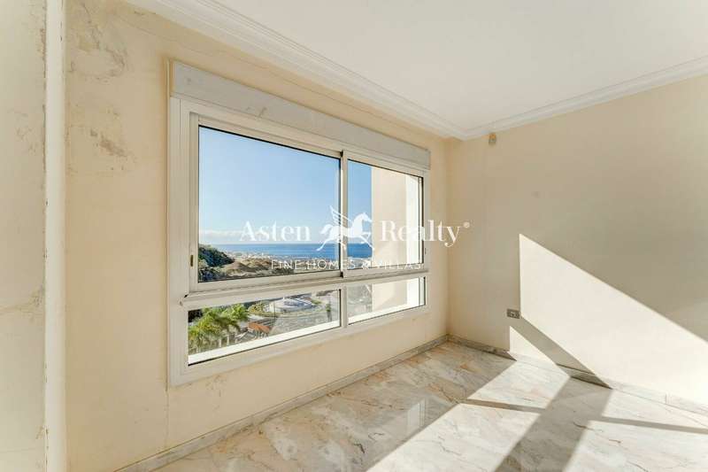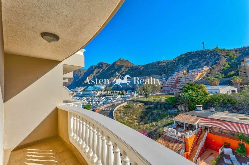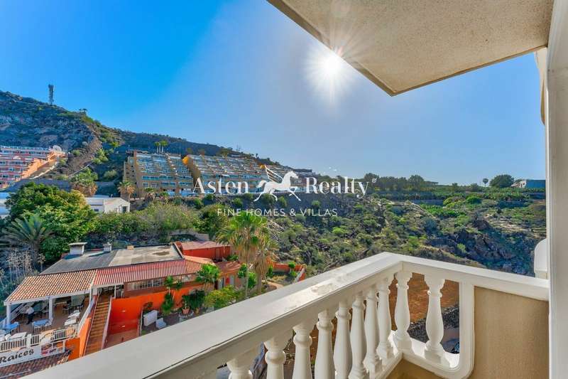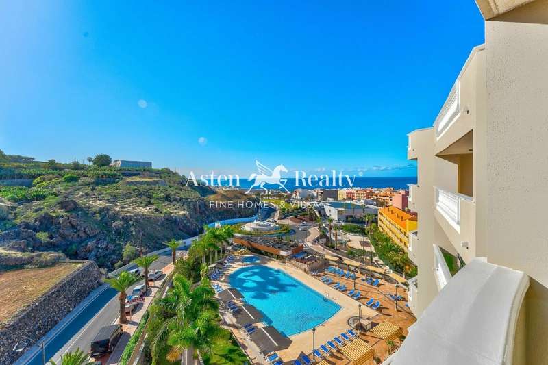 The resort has 4 entrances with the main one being on the 8th floor. There are 5 elevators in the resort one of which has panoramic views over the large, heated communal swimming pool and a separate children’s pool, surrounded by a large solarium area and gardens. The central area of the building has a waterfall feature which adds to the relaxing atmosphere within the resort. Security cameras in corridors and garage ensure the safety of owners. The resort is close to all amenities with large supermarkets close by as well as one on site. A dentist is also available on site and the town centres of Playa de La Arena and Los Gigantes are within easy walking distance.