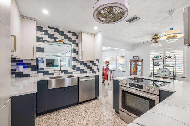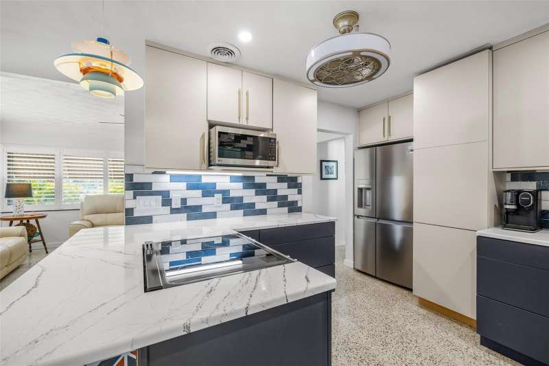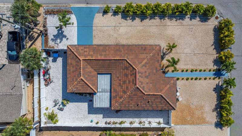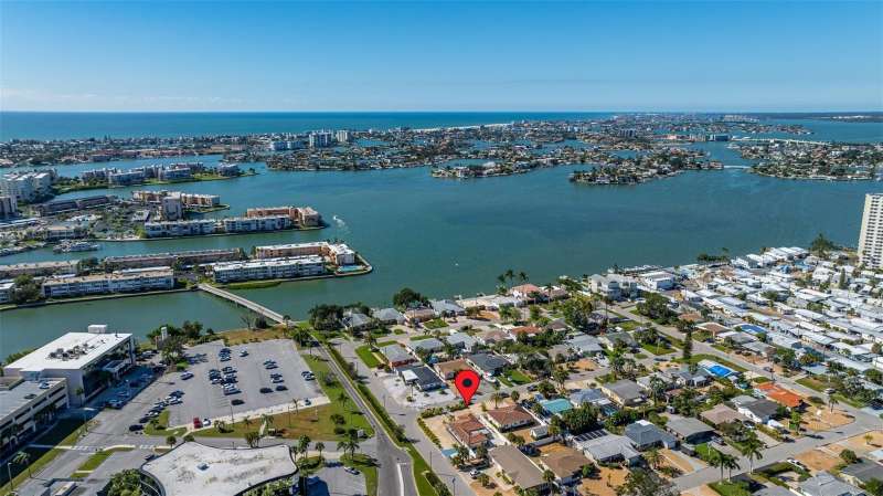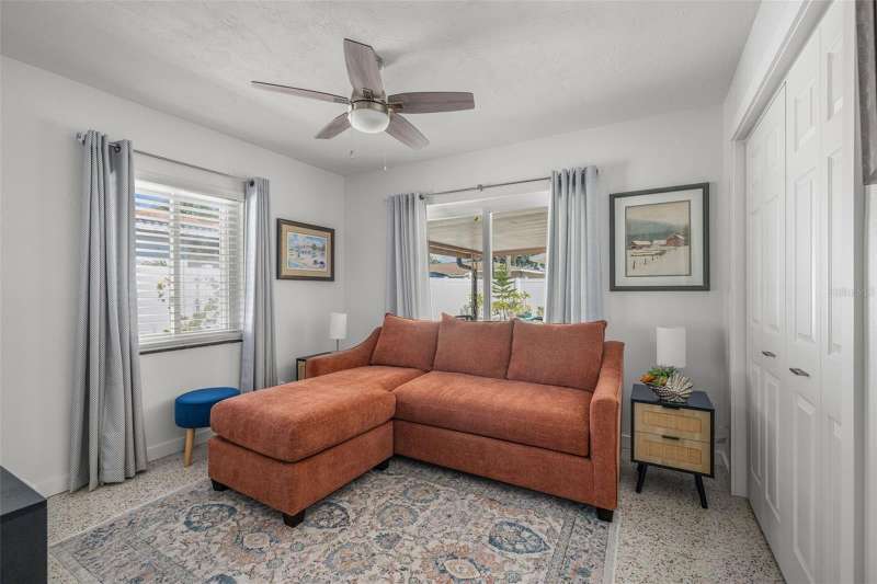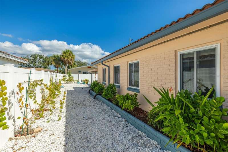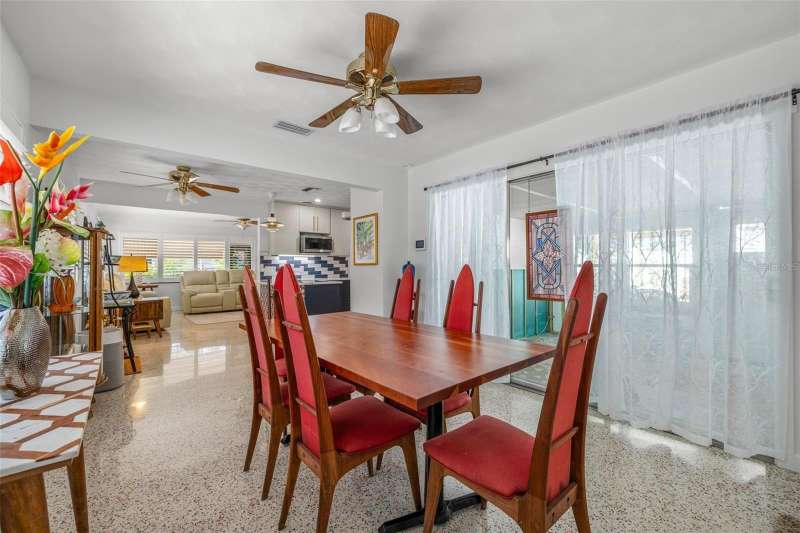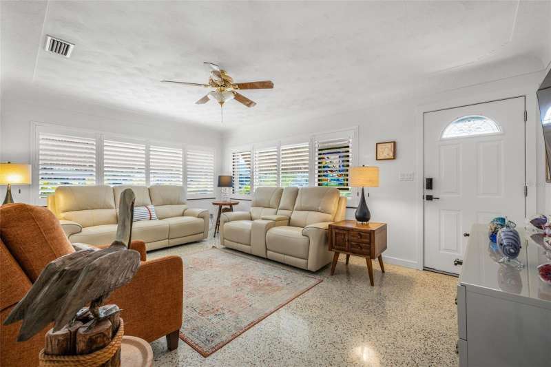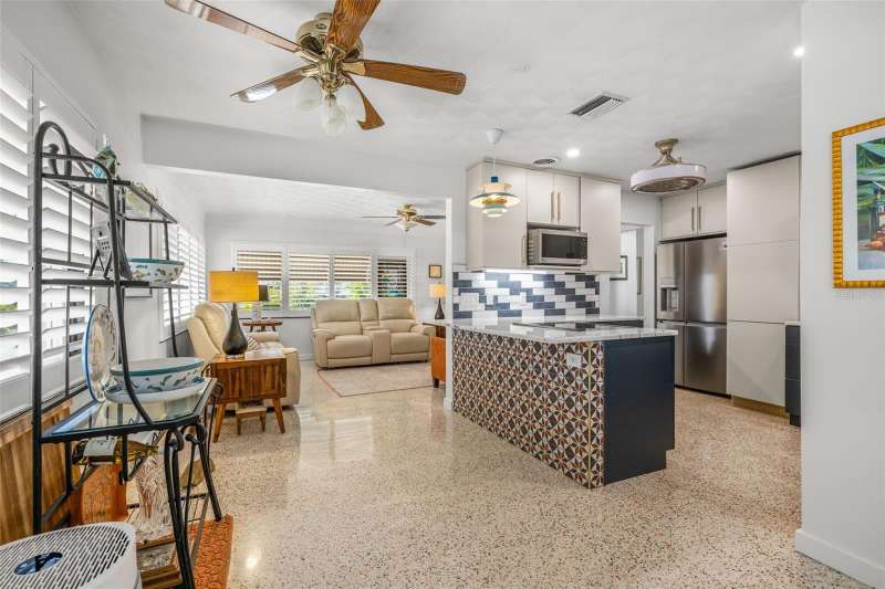 Welcome to your very own slice of the South Pasadena lifestyle! This renovated 2-bed, 2-bath Mid-Century Modern is the absolute definition of the effortless Florida living. Step inside the open-concept living and dining area, which is immediately bathed in glorious light, thanks to striking plantation shutters framing the surrounding windows. Gorgeous terrazzo floors flow throughout the block home, highlighting the classic charm while offering incredible durability. The chef's kitchen, set conveniently off the main living space, is a dream with endless countertop space, all new appliances, and a full suite of soft-close cabinetry. The adjacent sunroom has been fitted with central A/C to add valuable, usable square footage to the home! While this room is currently undergoing renovation, feel at ease knowing that the seller has been making great efforts to work with the city to have this completed before you move in. With a split floor plan offering privacy, both sun-filled bedrooms feature generous reach-in closets for easy storage. The primary bathroom has been completely remodeled and features a sleek, modern frameless shower-your daily retreat! The second bathroom retains its delightful, classic 1950s charm. The brand-new washer and dryer are conveniently located in the attached garage. Outside, the backyard spans into a breathtaking and tranquil space, perfectly landscaped for sun and shade. It features a covered patio with a new shell yard, making your weekend yard work a breeze. In addition, new French drains have been added to the backyard as well, and the wide side yard offers coveted space to park a small boat. Situated on a large corner lot with an attached side-entry garage, this location offers you a short drive to the beautiful Gulf Beaches and is just a 15-minute drive to the excitement of Downtown St. Pete. On top of that, the community has a small resting spot for you to overlook the beautiful water views. This home is more than a beautiful beach house; it's your little retreat for soaking up the sunshine and making lifelong memories.