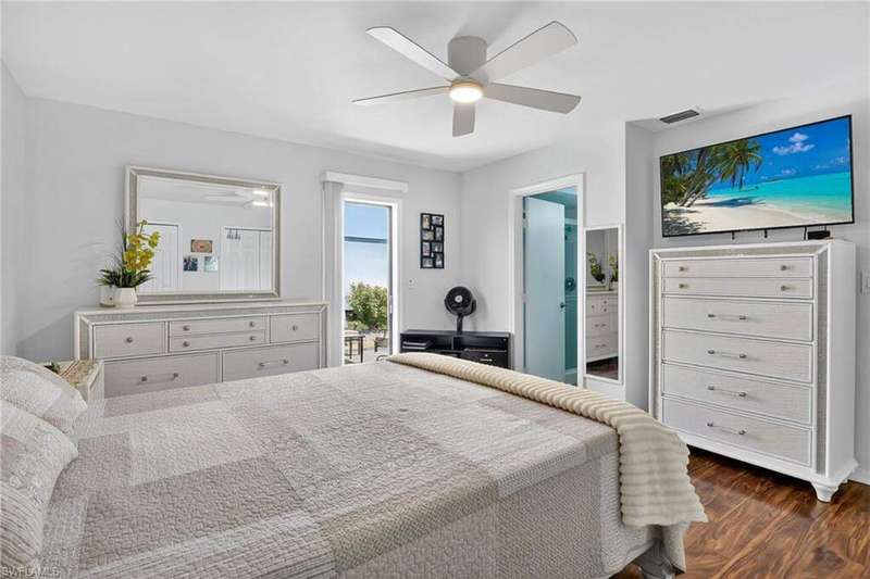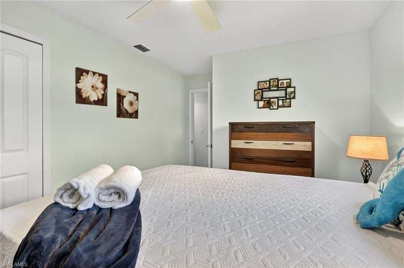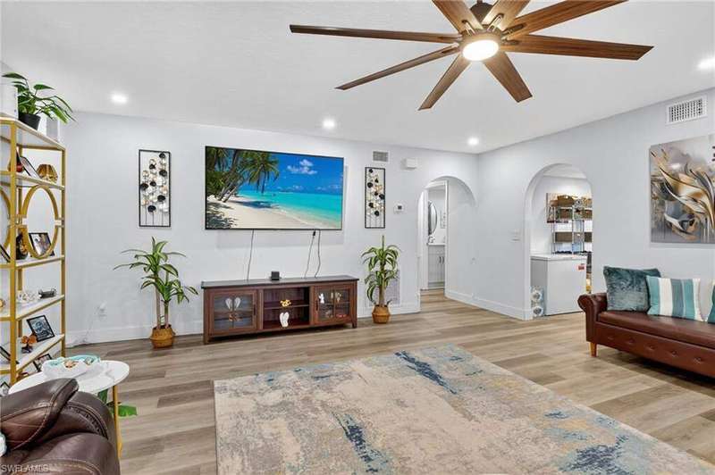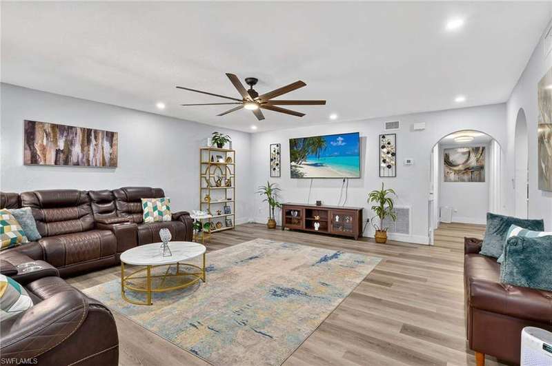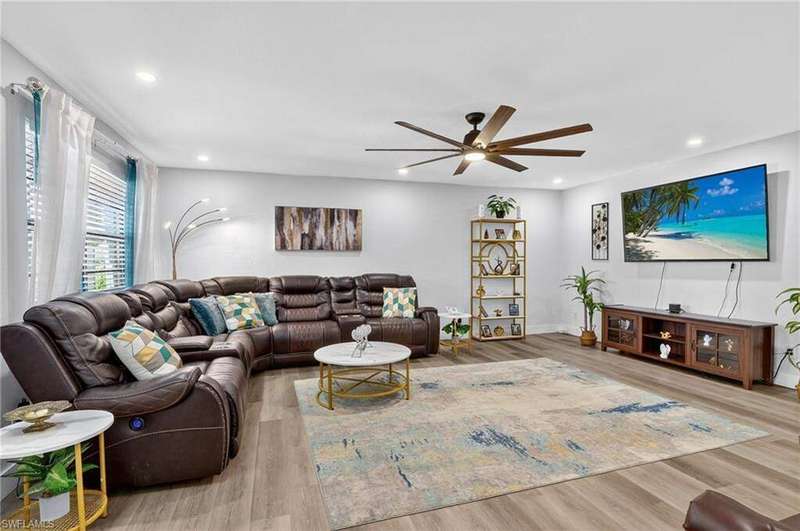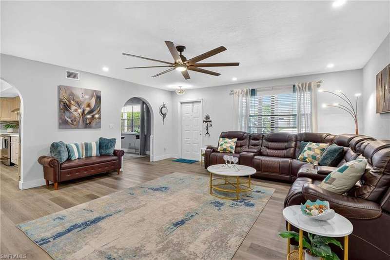 Chic & Stylish First Floor Condo in the Heart of Cape Coral. Welcome to this beautifully updated 2-bedroom, 2-bath home, ideally located near restaurants, shopping, schools, hospitals, Cape Harbour and Beaches. No Flooding--Flood Zone X--High & Dry. This first floor residence offers comfort and convenience, featuring spacious, freshly painted bedrooms and designer touches throughout. Recent upgrades include: New luxury waterproof flooring, new stove, new dishwasher, new washer/dryer, new water heater and newer A/C and plumbing (2022). The kitchen is equipped with stainless steel appliances, oscillating ceiling fan, quarts countertops and a pass through space that opens to a flexible dining area--perfect for entertaining or easily converted into a cozy den or office space. The bathrooms are unique with their elegant chandeliers, solid wood cabinets, soft close technology and quarts countertops. Modern ceiling fans or distinctive lighting elevate each room, adding a touch of sophistication. Imagine movie nights with family or friends in the large living room. The back patio is an ideal spot for your morning coffee or evening gatherings. Just steps away, the community POOL invites you to relax and unwind in a serene setting. Golf to your hearts content at the nearby, public Palmetto Pines Country Club. Boating enthusiasts can rent a space for your boat at one of the harbors or consider joining the Freedom Boat Club. Don't miss the opportunity to make this refined condo your own.--schedule a private showing today before it is gone! Veteran friendly.