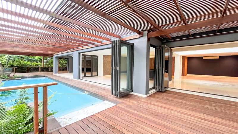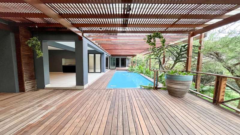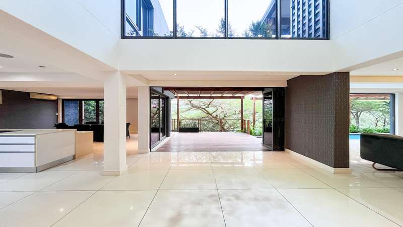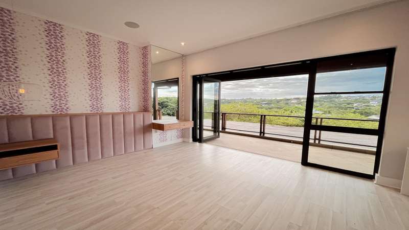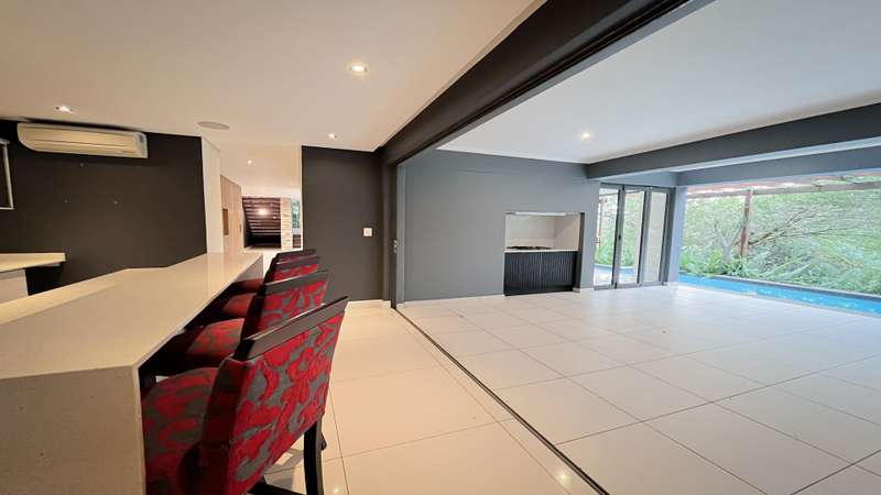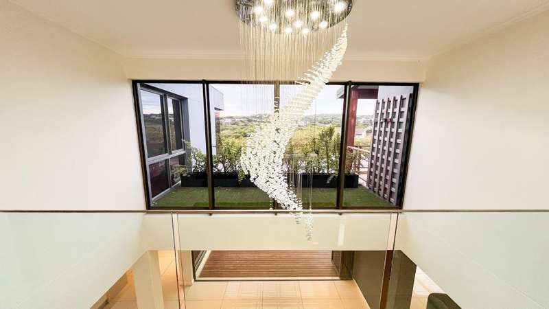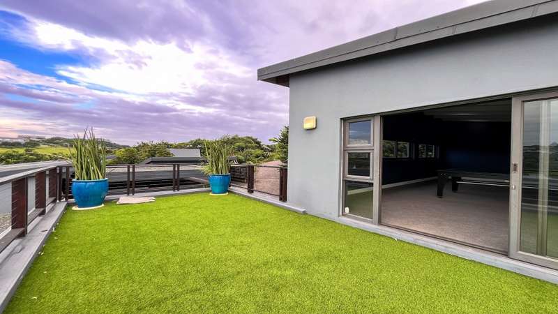 Contemporary Elegance in Simbithi Eco Estate Tucked away in a quiet cul-de-sac, this modern masterpiece in Simbithi Eco Estate blends contemporary design with timeless sophistication. Designed with family living and entertaining in mind, the home offers an effortless flow and a sense of calm from the moment you step inside. The open-plan living areas are light-filled and spacious, with seamless integration between the lounge, dining, and kitchen. The sleek all-white kitchen, featuring a custom centre island, sets the scene for stylish everyday living and memorable gatherings. Stacking doors open out to an expansive wooden deck with a covered pool and seating area, all framed by serene coastal forest views. Upstairs, five generously sized bedrooms each enjoy en-suite bathrooms and private balconies. The master suite is a true retreat, complete with a walk-in wardrobe and panoramic estate views. Entertainment options abound with a cinema room, built-in bar, and sunroom, while the versatile space above the triple garage offers flexibility as a games room or a work-from-home setup. A separate guest suite/teen pad with its own entrance adds further appeal. This fully automated home is equipped with air-conditioning throughout, a backup power inverter, and staff accommodation for convenience. Simbithi Eco Estate is renowned for its secure lifestyle offering, including golf, nature trails, and an array of communal facilities. Here, every detail of this home reflects refined taste and elevated living. Contact us today to arrange a private viewing of this exceptional property.