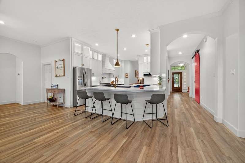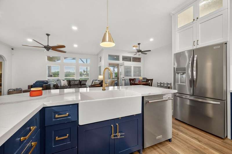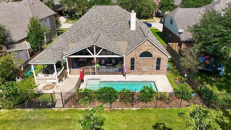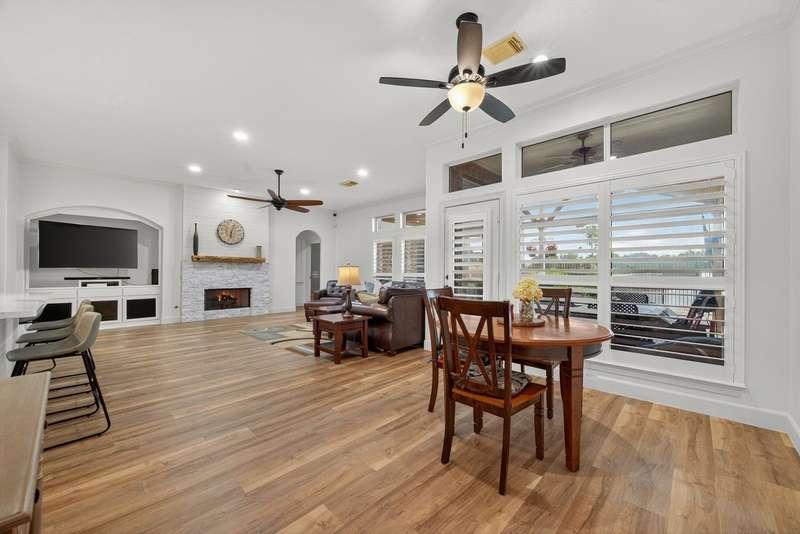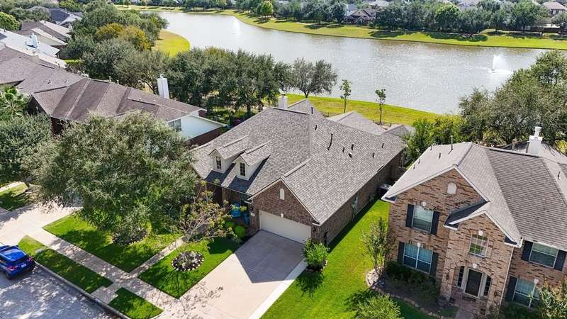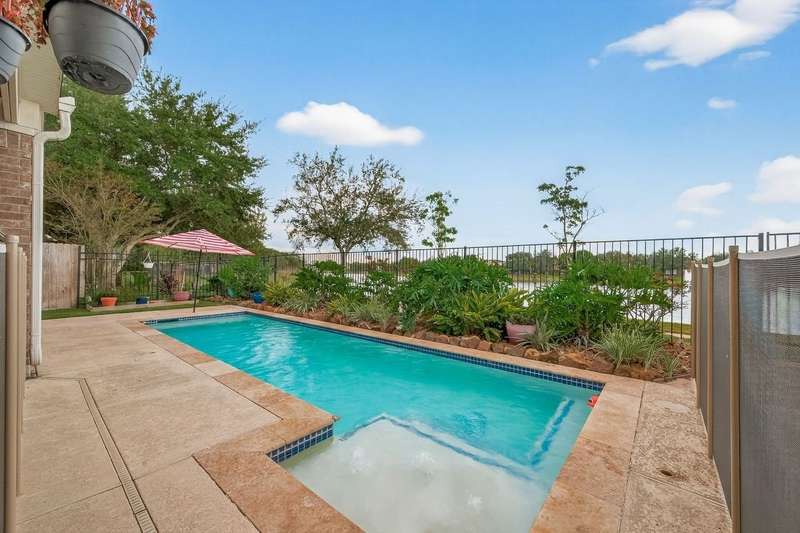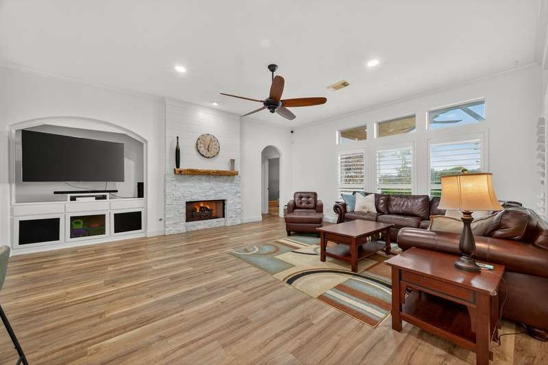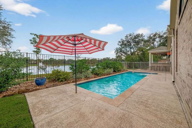 WOW! STUNNING LAKEFRONT 1-story with POOL & 3-CAR GARAGE! 4 bedrooms, 3 full baths in a highly desirable GATED COMMUNITY with STUDY, FORMAL DINING, and the open floor plan you’ve been searching for. Designer updates throughout including a SHOW-STOPPER KITCHEN with quartz counters, lighted ceiling-height cabinets, ZLINE chef’s gas range, central island, stylish backsplash, and shiplap accents. Private study with custom built-in library and double doors. Elegant dining with easy kitchen access. Spacious living room with shiplap & stone fireplace and a wall of windows showcasing breathtaking triple-fountain lake views. Plantation shutters, raised-ceiling primary suite, and spa-inspired bath with seated vanity. Backyard oasis features a covered patio with wood ceiling, outdoor cabana kitchen/bar, sparkling pool, and serene fountain-view lakefront! Recent roof.