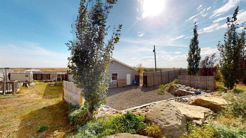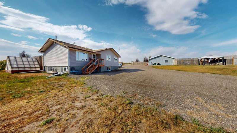 **This Acreage has Plenty to offer.** Highway 564 W - direct route to Calgary Airport**. Privacy Fence and the home was moved from Calgary onto new foundation built by Heritage Concrete in 2019. Home has all new windows and original hard wood flooring, new siding. Newer Gas Stove in Kitchen. Secondary building with Heated Garage is a separate building with a illegal suited living quarters built on Slab in 2019 and a fenced private yard. HEATED GARAGE: (17 '1" x 30'11") 553 sq ft. ILLEGAL SUITE: 683 sq ft. There is a Privacy fencing with many gates on the North East and West side of property. The whole acreage can't be seen from main road as it gently sloped to give natural shelter from the wind. Nicely Treed and has a sound Berm on West/North end of property. Room for animals to be pastured. Services for Sewer, water and Electric beside main dwelling potential for large Garage or even a Shouse or Shop. Yard is gravelled and nicely designed for circle driveway ample parking and accessibility. Water Well produces 12 GPM. New Basement Foundation on Main House has 12 ft ceilings and roughed in plumbing for a kitchen and bathrooms. Basement is a blank slate for you to develop another private Living quarters. Raised Bungalow and high ceiling with lots of windows doesn't feel like a basement - feels warm and cozy. Services for another building beside main house all in place. Two = Septic tanks perfect for multiple families. MAIN HOUSE with basement: 2145 sq ft of living space. Back of home private access to main floor and basement. Located just off pavement RR 253 and 30+ mins to Airport and Calgary. Nearest town Strathmore. 10x12 Greenhouse, 10 x 10 Gazebo, black shed 7.5x6, Shed 10.5 x 8. Virtual Tours x two on this listing, check out the 360 views and there is a button to de-furnish the rooms, garage and basement. What would you do with this property?