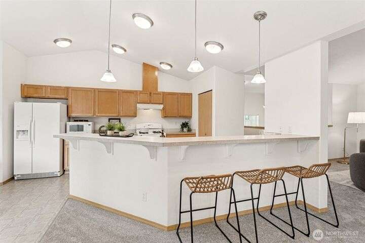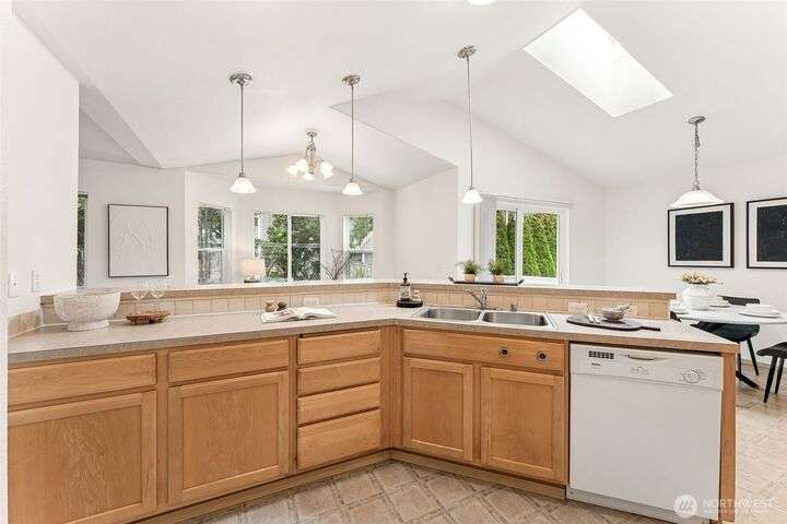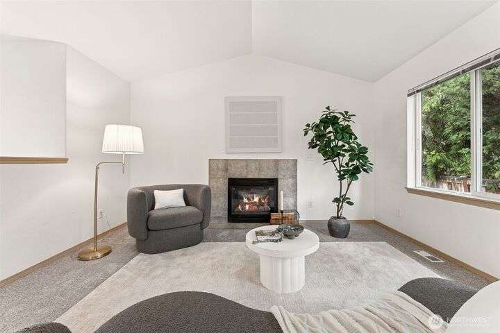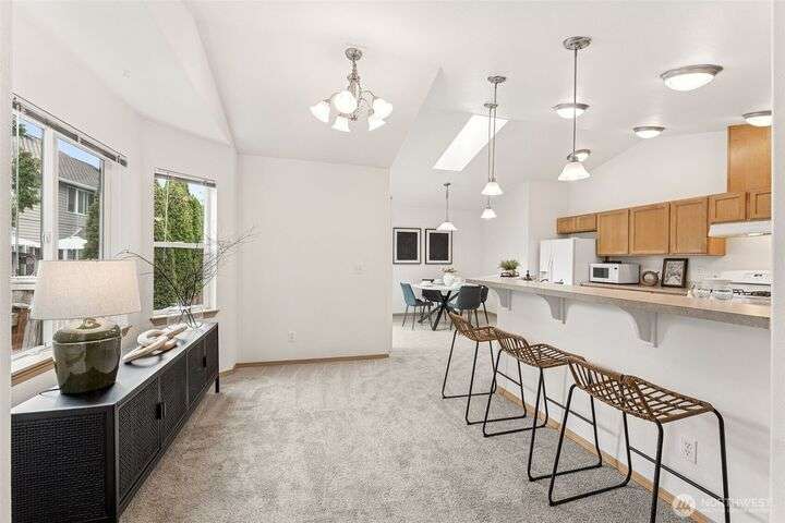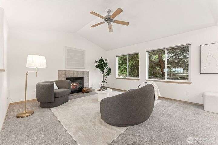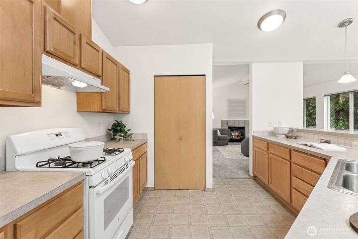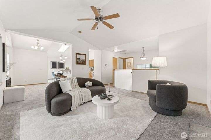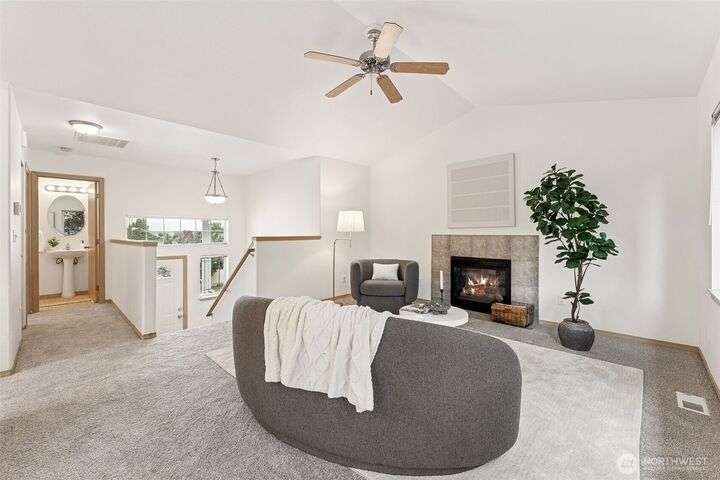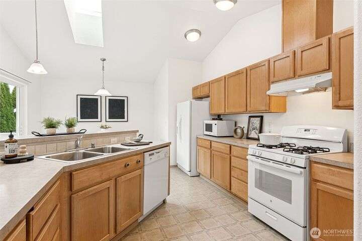 A Rare Gem in a Prime Location! Nestled at the end of a peaceful cul-de-sac, spacious home boasts soaring 9-foot ceilings, hardwood entry, brand-new carpet & pad, a skylight that fills the space w/ natural light. The open-concept layout is bright & airy. Enjoy a generously sized kitchen featuring a pantry, all appliances included, a cozy eating nook, breakfast bar, & a formal dining area. The expansive great room centers around a gas fireplace, creating a warm and inviting atmosphere. Retreat to the luxurious primary suite with dual walk-in closets and a 5-piece bathroom. Downstairs, you'll find two additional bedrooms, a full bath & an oversized laundry room complete with washer/dryer. Low-maintenance yard. Move-in ready!