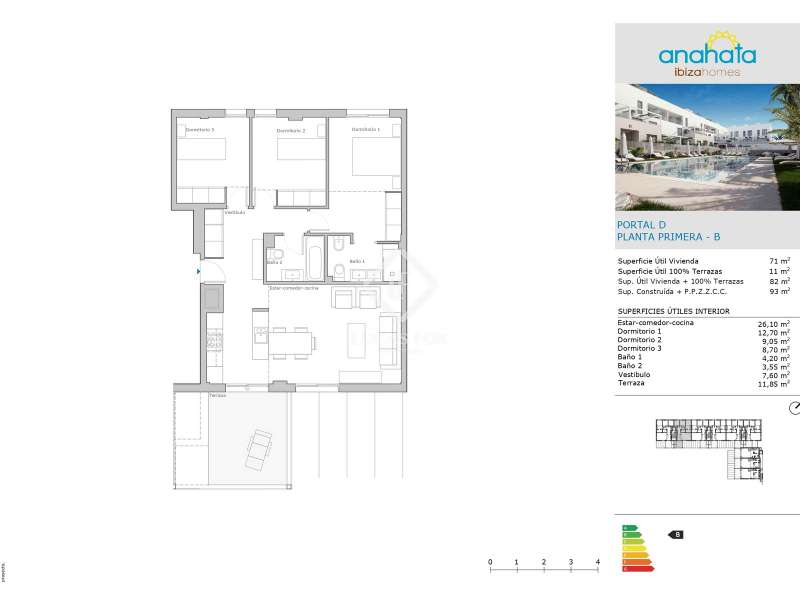WORK IN PROGRESS The privacy of Anahata Ibiza Homes is one of its key features, with only 23 residences in the development, creating an intimate and secluded environment on the island of Ibiza. The homes are situated within a private gated community, which includes a swimming pool, solarium, and a private gym. The properties offer 2- and 3-bedroom layouts, all with terraces of up to 79 m² in size. The homes are designed with dual aspects, maximizing natural light and ventilation. Each property includes an outdoor terrace, and some feature additional private terraces. The kitchens are seamlessly integrated into the living areas, creating an open-concept space ideal for day-to-day living. The development has earned an energy efficiency rating of 'B,' ensuring optimal energy performance. Ses Figueretes beach is just 550 metres away, Es Vivé beach is 950 metres, and Bossa beach is 1.5 km. The nearest hospital is 350 metres, and the closest health centre is just 250 metres away. Supermarkets are located 250 metres from the development, and the sports centre is 500 metres away. The airport is just an 8-minute drive. Anahata Ibiza Homes is nestled in a well-established area, offering easy access to all essential services for daily living. For more information, please contact us.