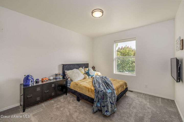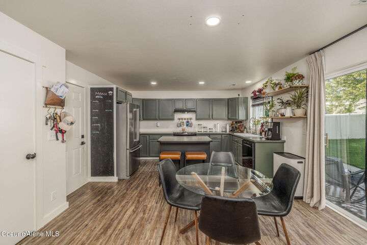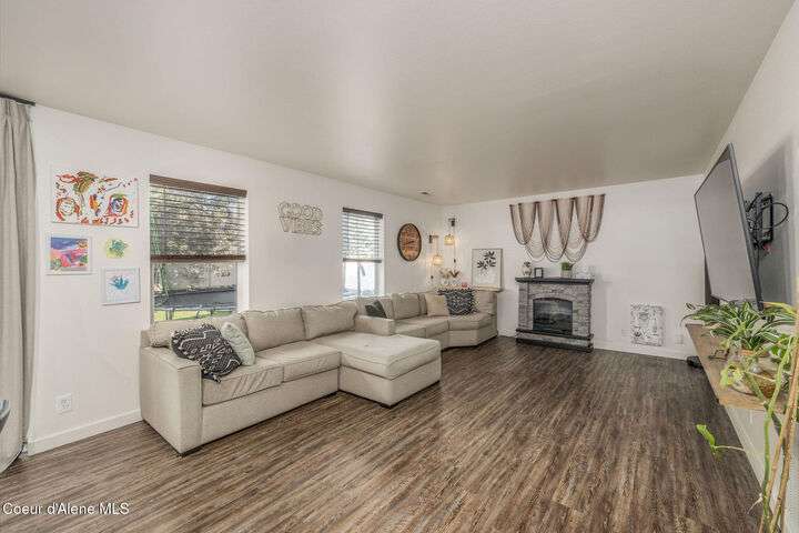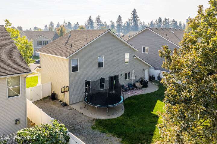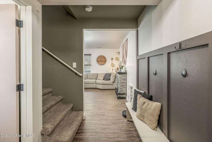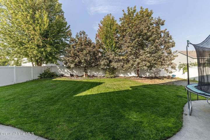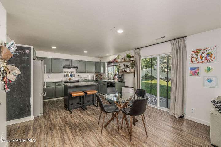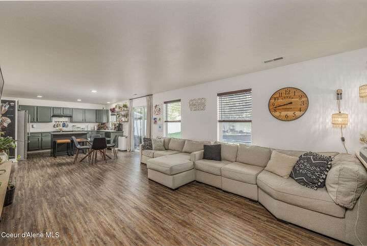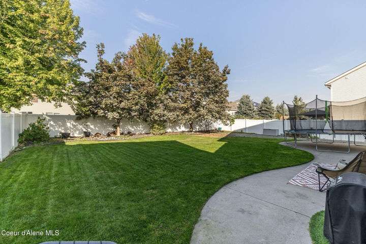 Bright, move-in ready home in Coeur d'Alene! This 4 bed, 2.5 bath has been refreshed with new interior paint and LVP flooring. The main floor offers an open, easy-flow layout with living, dining, and kitchen all connected for everyday living and entertaining. Big windows bring in great natural light and overlook the backyard. Upstairs you'll find a spacious primary suite with a large walk-in closet and dual-sink bath, along with three additional bedrooms and full bathroom. Outside, enjoy a fully fenced and landscaped yard with sprinklers, mature trees for privacy, and a large concrete patio perfect for BBQs, play, and pets. The extended 3rd car garage bay has been converted into a small workshop/utility garage with an additional large storage room or office space, ideal for hobbies, tools, or working from home. Located close to schools, grocery stores, parks, and Hwy 95, makes commuting quick and easy. This is the clean, functional North Idaho home buyers are looking for.
