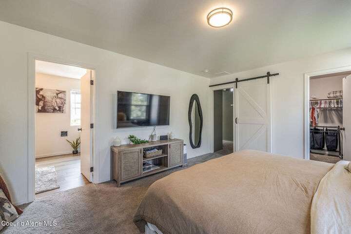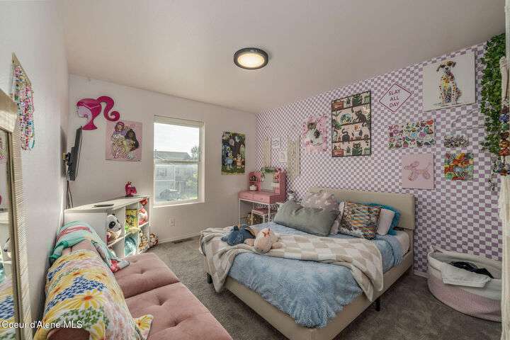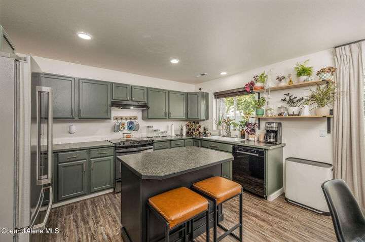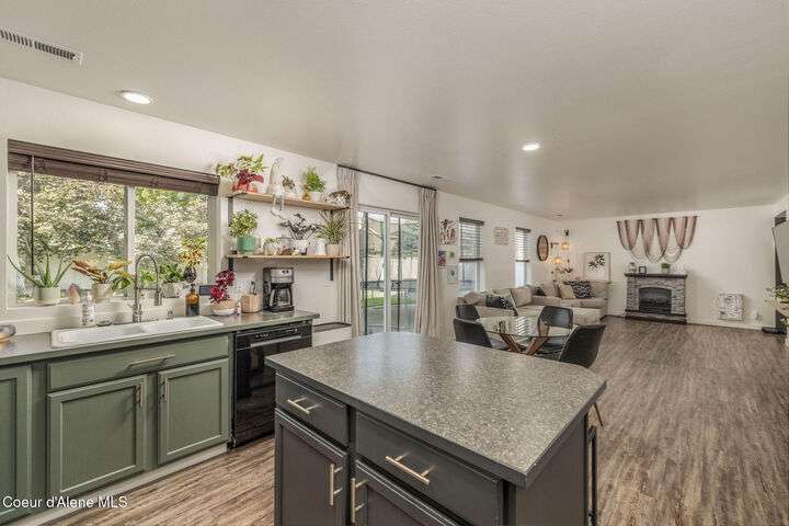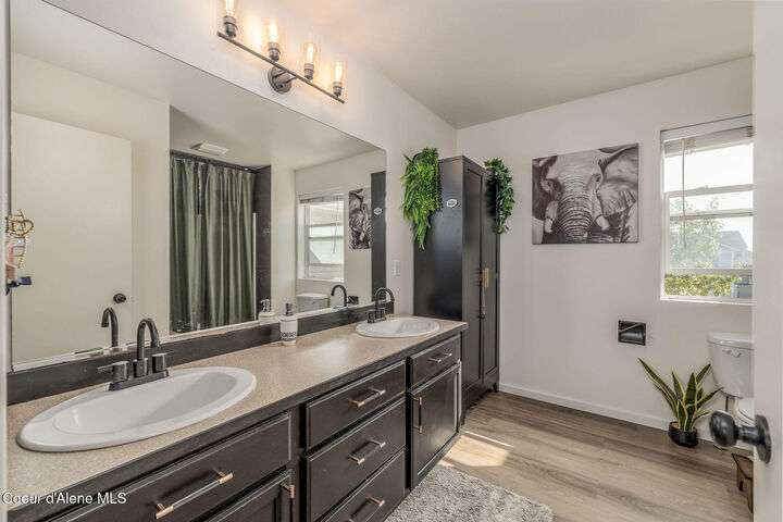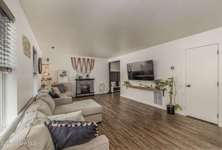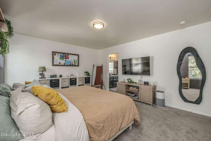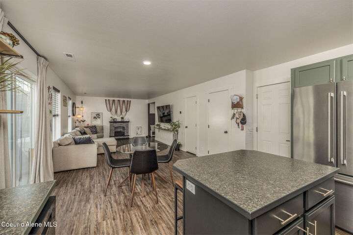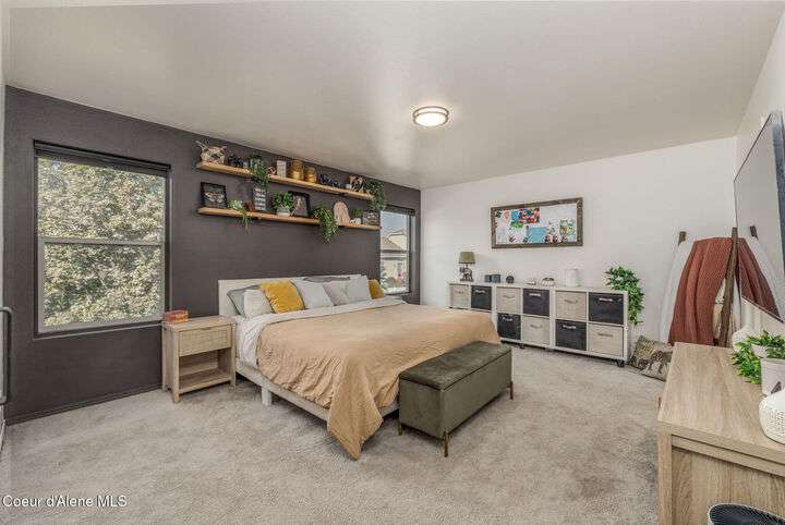 Bright, move-in ready home in Coeur d'Alene! This 4 bed, 2.5 bath has been refreshed with new interior paint and LVP flooring. The main floor offers an open, easy-flow layout with living, dining, and kitchen all connected for everyday living and entertaining. Big windows bring in great natural light and overlook the backyard. Upstairs you'll find a spacious primary suite with a large walk-in closet and dual-sink bath, along with three additional bedrooms and full bathroom. Outside, enjoy a fully fenced and landscaped yard with sprinklers, mature trees for privacy, and a large concrete patio perfect for BBQs, play, and pets. The extended 3rd car garage bay has been converted into a small workshop/utility garage with an additional large storage room or office space, ideal for hobbies, tools, or working from home. Located close to schools, grocery stores, parks, and Hwy 95, makes commuting quick and easy. This is the clean, functional North Idaho home buyers are looking for.