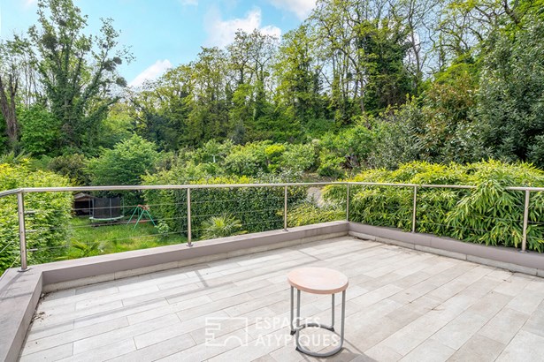The interior staircase leads to the bright and crossing living room of 38m2. It consists of an equipped kitchen open to the second living room area. The view is extended thanks to the 17m2 terrace which is draped in a green envelope.