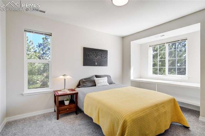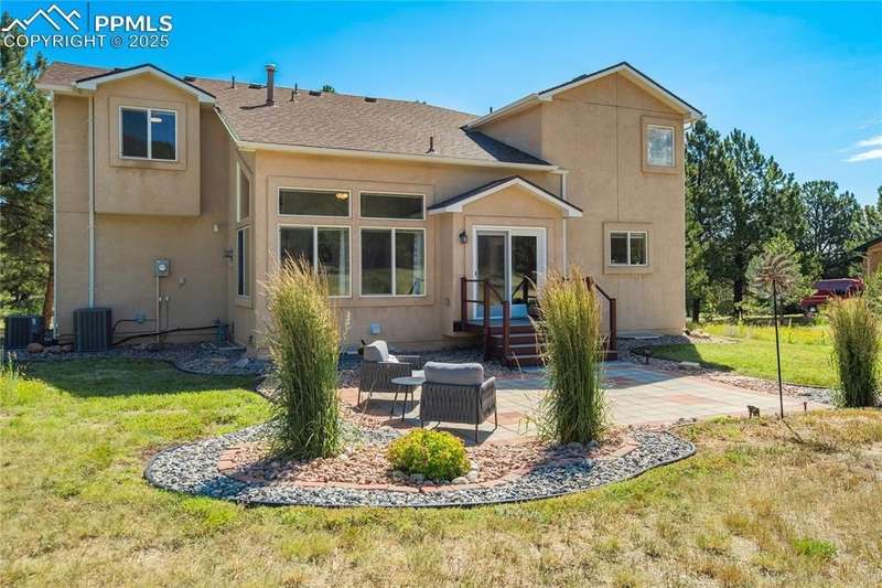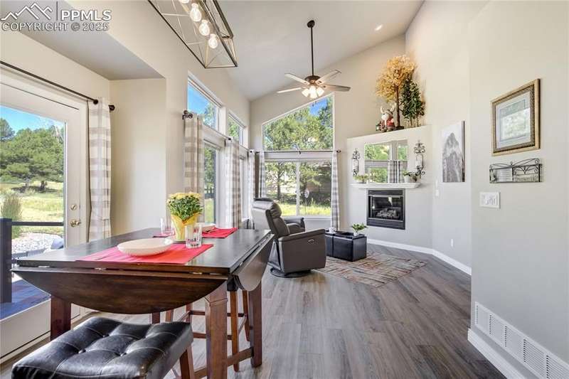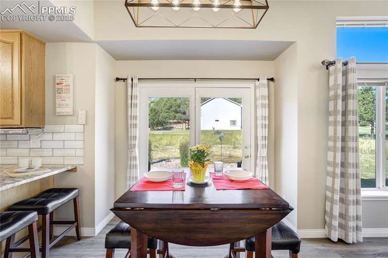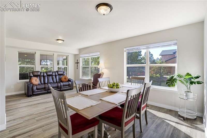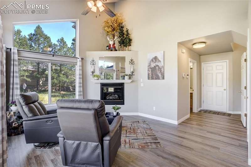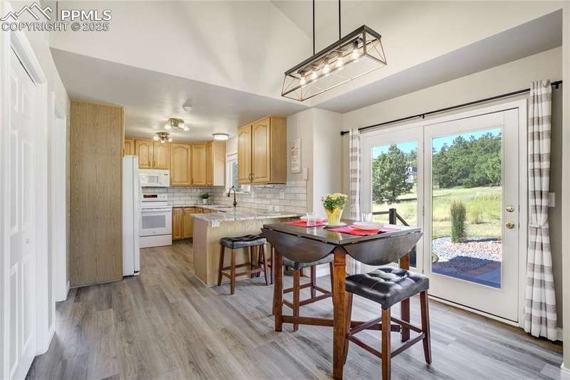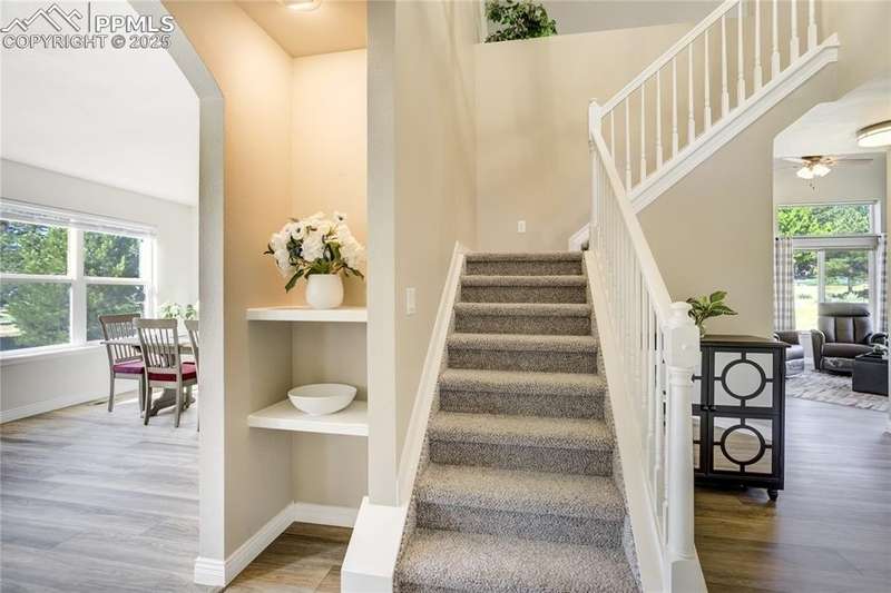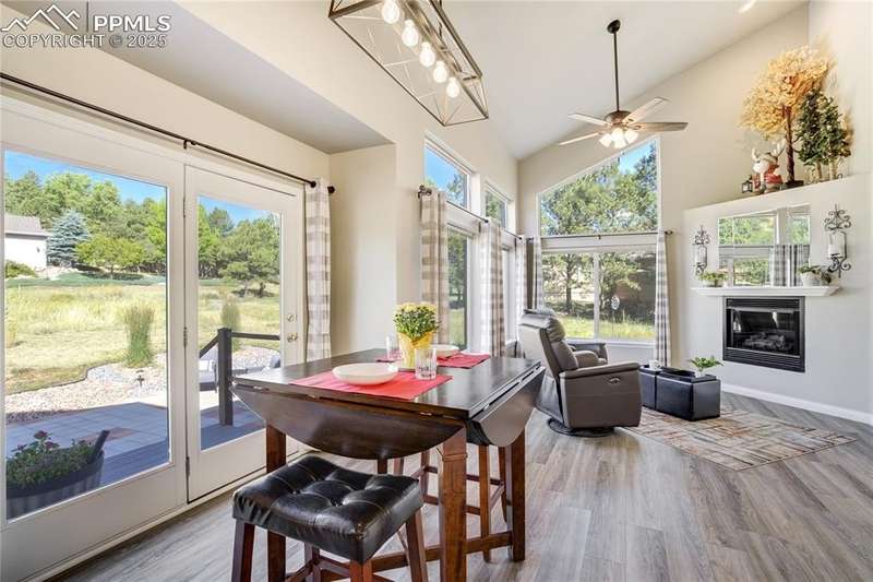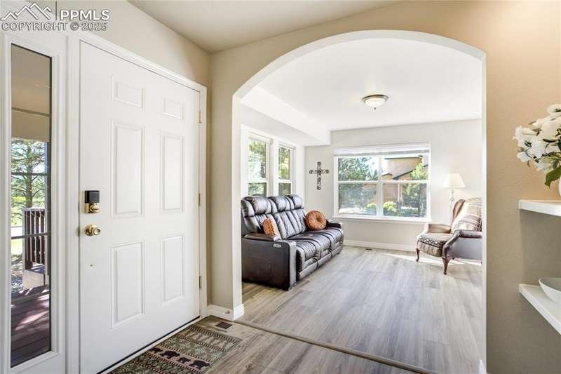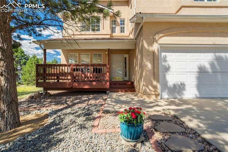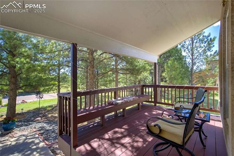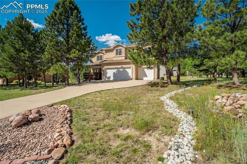 Incredible combination of location, lot size, neighborhood setting, functional layout, & recent updates. We anticipate strong interest - see it today. Set on a secluded street in the desirable Woodmen Oaks neighborhood. .69-Acre lot surrounded by mature trees, wildflowers, & natural beauty—minutes from shopping, D-20 schls, parks, USAFA & major roads. Nearby hiking/biking trails this home offers both connection & seclusion. The covered front porch greets you & offers a space to relax enjoying the landscape. Inside, the layout opens w/a sun-filled formal living rm & new modern lux vinyl plank flring that flows throughout the entire main lvl. The dining rm flexes for everyday meals or special gatherings. The adj gourmet kitchen upgraded w/stylish granite counters, solid oak cabinetry, peninsula w/breakfast bar, undermount sink, pantry, upgraded lighting & dining nook. Walk-out from here to a custom-designed paver patio that expands into the natural outdr setting, ideal for backyard entertaining or quiet evenings. Back inside, the vaulted great rm brings it all together w/ an open flow, gas FP, & a wall of windows capturing the beautiful views. Also on the main lvl: 1/2 bath w/ new vanity & subway tile backsplash, plus an oversized laundry rm w/ folding counter & shelving. Upstairs, new paint & carpet continue throughout all 4 upper bedrms. The primary suite feat vaulted ceilings, ceiling fan, built-in shelving, walk-in closet, & a 5pc ba complete w/ soaking tub, dble vanities, & newer LVP flring. Each of the 3 addl bedrms have walk-in closets, built-in window seat w/storage, & easy access to the full hall bath. The finished light & bright bsmnt has new carpet & paint, LED lighting, a wide-open rec rm perfect for a game table & lounge setup, plus a 5th bedroom & full bath for guests. Practical perks incl garage w/ 240V EV charging, overhead storage & cabinets, & an extended 3rd bay w/ workshop, 2 zone HVAC w A/C, newer HE furnace & whole house fan.