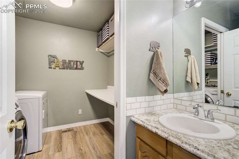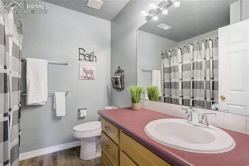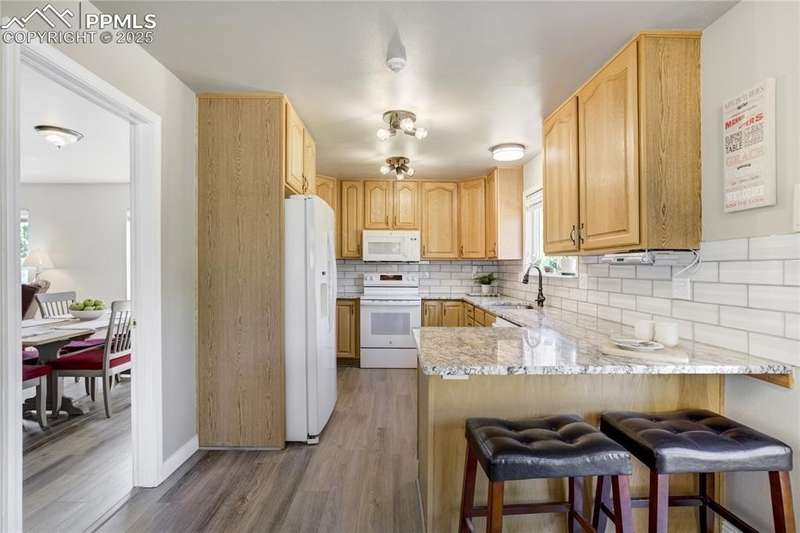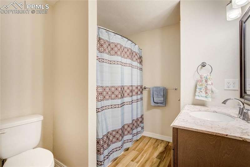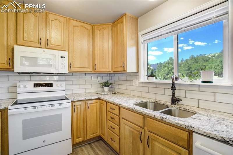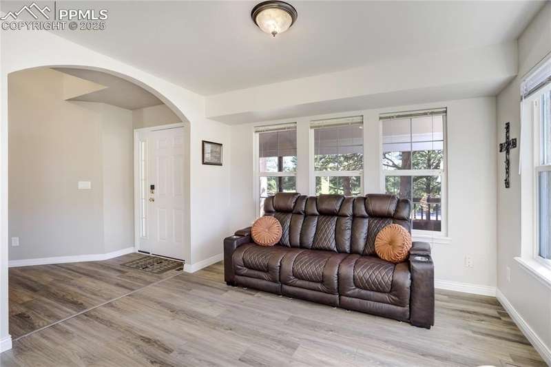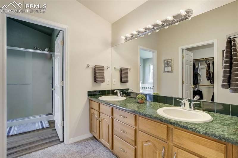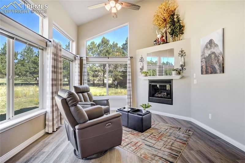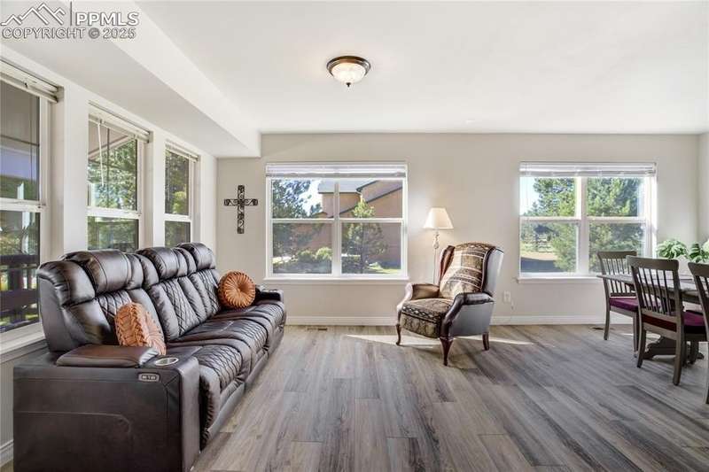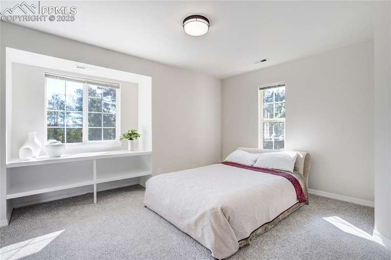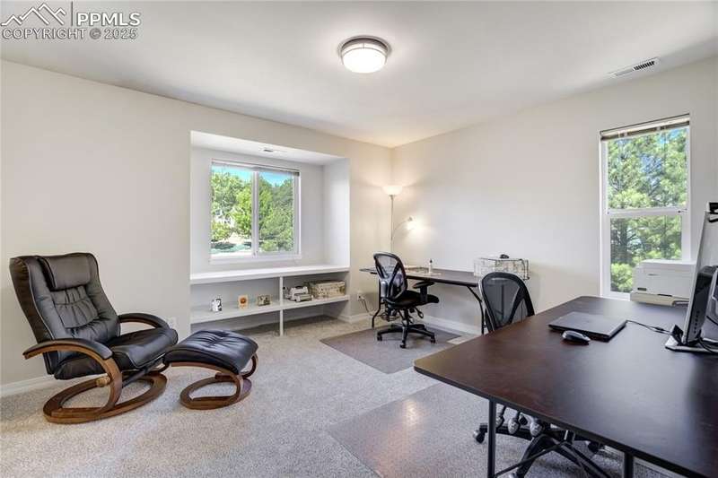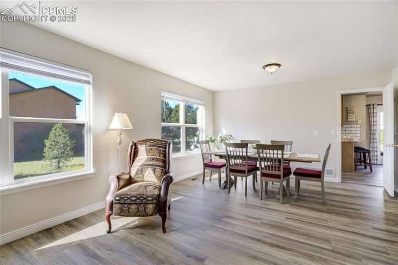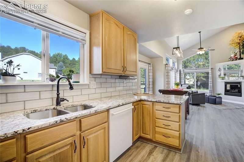 Incredible combination of location, lot size, neighborhood setting, functional layout, & recent updates. We anticipate strong interest - see it today. Set on a secluded street in the desirable Woodmen Oaks neighborhood. .69-Acre lot surrounded by mature trees, wildflowers, & natural beauty—minutes from shopping, D-20 schls, parks, USAFA & major roads. Nearby hiking/biking trails this home offers both connection & seclusion. The covered front porch greets you & offers a space to relax enjoying the landscape. Inside, the layout opens w/a sun-filled formal living rm & new modern lux vinyl plank flring that flows throughout the entire main lvl. The dining rm flexes for everyday meals or special gatherings. The adj gourmet kitchen upgraded w/stylish granite counters, solid oak cabinetry, peninsula w/breakfast bar, undermount sink, pantry, upgraded lighting & dining nook. Walk-out from here to a custom-designed paver patio that expands into the natural outdr setting, ideal for backyard entertaining or quiet evenings. Back inside, the vaulted great rm brings it all together w/ an open flow, gas FP, & a wall of windows capturing the beautiful views. Also on the main lvl: 1/2 bath w/ new vanity & subway tile backsplash, plus an oversized laundry rm w/ folding counter & shelving. Upstairs, new paint & carpet continue throughout all 4 upper bedrms. The primary suite feat vaulted ceilings, ceiling fan, built-in shelving, walk-in closet, & a 5pc ba complete w/ soaking tub, dble vanities, & newer LVP flring. Each of the 3 addl bedrms have walk-in closets, built-in window seat w/storage, & easy access to the full hall bath. The finished light & bright bsmnt has new carpet & paint, LED lighting, a wide-open rec rm perfect for a game table & lounge setup, plus a 5th bedroom & full bath for guests. Practical perks incl garage w/ 240V EV charging, overhead storage & cabinets, & an extended 3rd bay w/ workshop, 2 zone HVAC w A/C, newer HE furnace & whole house fan.