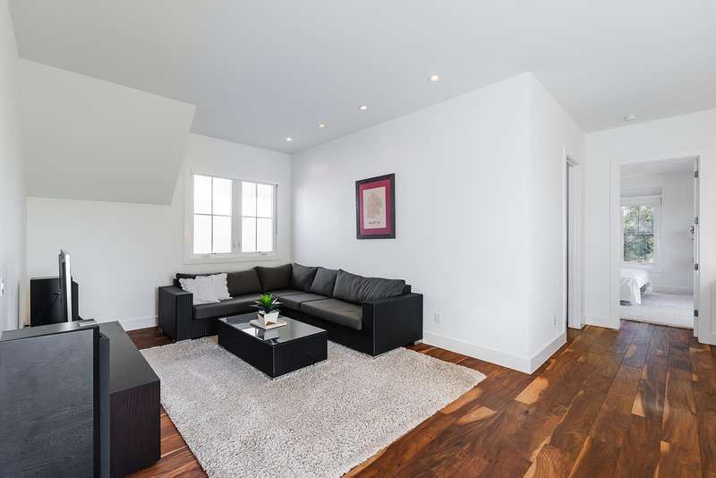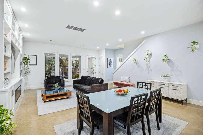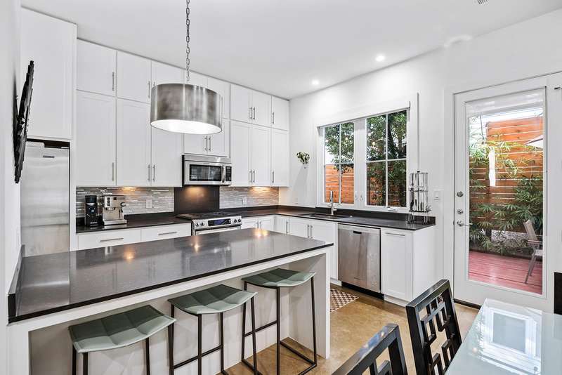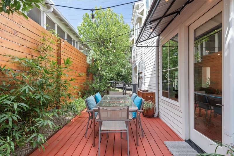 Storage abounds around this singular floorplan, and nary a corner is wasted. A dedicated living room graces the upstairs, and another living nook begs for your lifestyle interpretation. The covered porch out front doubles as a loungey respite from which to wave at neighbors and a perch to ponder what plants might compliment your mature fig tree. Low maintenance native landscaping spans the front fenced garden.