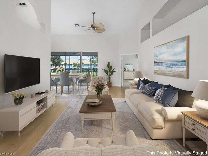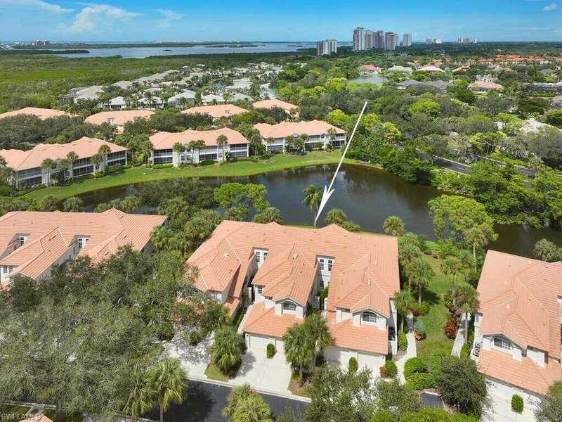 Mesmerizing views & modern luxurious updates await in this 3-bedroom plus den, 2-bath residence in Harbor Landing in Bonita Bay! This 2nd-floor retreat boasts volume ceilings & a captivating view overlooking a wide expanse of the serene lake. Sliding doors seamlessly connect the interior to a large tiled lanai with the added convenience of electric hurricane shutters, providing peace of mind. Updates include the owner's ultra-luxurious spa-like ensuite bath with a frameless glass door entry, Jet Rainfall Shower Tower Panel System, & a modern double vanity. Updates extend to the guest bath with a Jet Rainfall Shower Tower Panel System & newer vanity. Plantation shutters adorn the windows, allowing you to control natural light & privacy with ease. The main living areas feature engineered wood floors, adding a touch of elegance. All bedrooms are generously sized, including the den, which is versatile as a 4th guest room. BRAND new A/C installed- 3/24. This condo is strategically located just steps from the community pool, offering a perfect place to relax & unwind. A short walk will also lead you to the Marina & Backwater Jack's Restaurant. Don't miss the opportunity to call this exquisite residence your own! Home has been Virtually Staged and Virtually Painted interior.