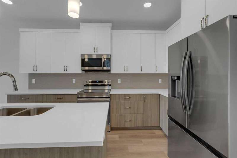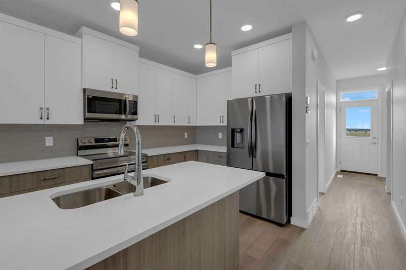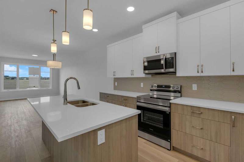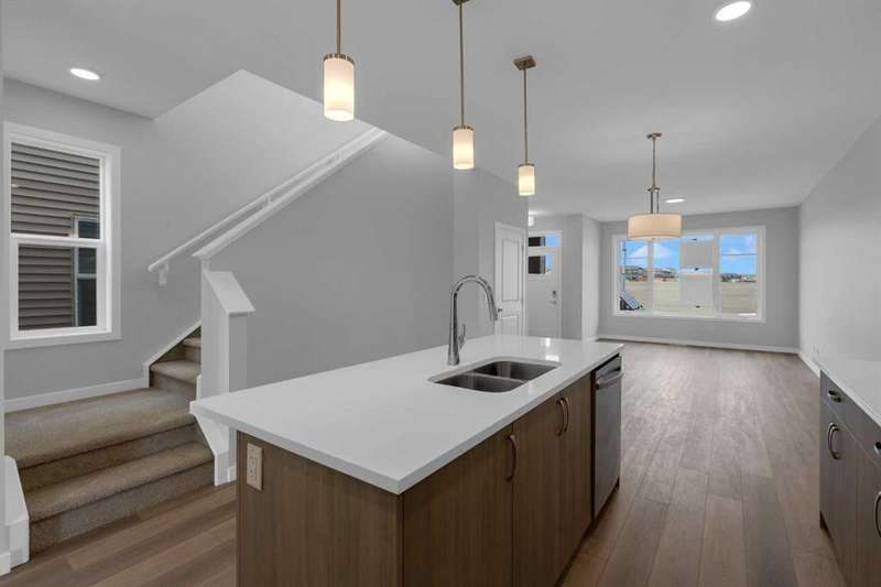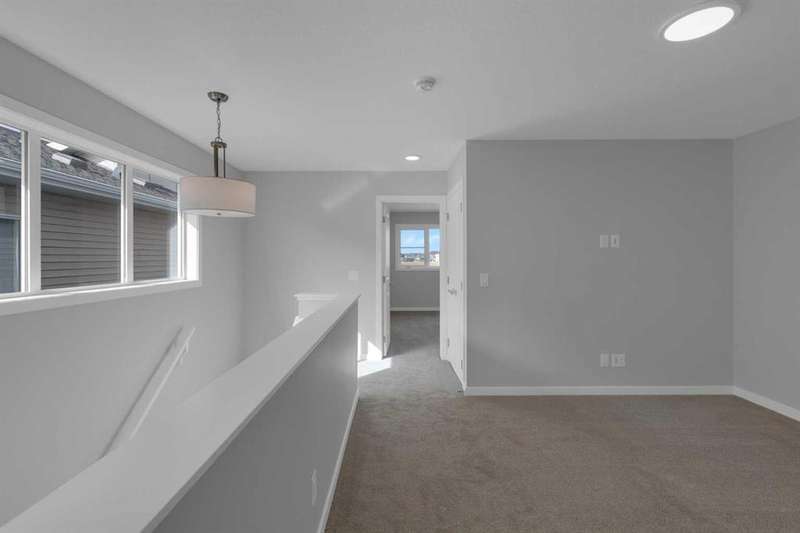 4 BEDROOMS ABOVE GRADE, WALK OUT BASEMENT that is roughed in for LEGAL 2 BEDROOM SUITE ( w/city permits and approvals). Introducing the COHEN: an amazing, BRAND NEW attached home by EXCEL HOMES offering 1735 SF above grade of upgraded luxury! Nestled in the vibrant Northwest community of Carrington. Step into a life of luxury and convenience with this stunning residence, where every detail has been meticulously crafted for comfort and style. Enjoy the benefits of living in an established neighborhood that brings a plethora of amenities right to your doorstep, along with swift access to major highways. Enjoy the local pathways, environmental reserve - central pergola & seating areas and mixed level playground w/basketball court, skate park & more.! The COHEN offers a sprawling 1735 square feet of thoughtfully designed living space, perfect for both families and entertaining. The open floor plan, complemented by neutral designer tones, creates a welcoming atmosphere that is both elegant and comfortable. The chef-quality kitchen stands as the heart of the home, equipped with an abundance of cabinets, pot/pan drawers, and upgraded stainless steel appliances. The expansive engineered stone countertops, a large island with seating, and a convenient pantry make it a dream kitchen for those who love to cook and entertain. The main floor also features versatile luxury vinyl plank flooring. Uniquely ON THE MAIN FLOOR, you'll find a BEDROOM & FULL 4 PCE BATHROOM. Ascend to the second level where leisure meets luxury in the large central bonus room with vaulted ceilings — ideal for movie nights and family gatherings. The primary bedroom is a true retreat, boasting a walk-in closet and a spa-like ensuite with stone vanity tops. Additionally, two more generously sized bedrooms provide ample space and easy access to the main bathroom. The convenience continues with a laundry room (w/folding counter), strategically located on the same floor. The possibilities extend into the undeveloped WALKOUT basement that has separate ENTRY & ROUGH IN'S FOR 2 BEDROOM LEGAL SUITE (with city permits & approvals)... the utilities are tucked away for easy development. You'll find a pressure treated deck w/aluminum railings accessible from your kitchen! This home includes a 20 x 20 gravel parking pad and sod to the front & backyard. Don't miss the chance to own this never-lived-in gem with quick possession available. Experience the blend of luxury, comfort, and convenience in Livingston—welcome to your new dream home at the COHEN.
