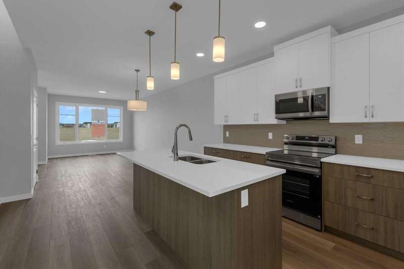 4 BEDROOMS ABOVE GRADE, WALK OUT BASEMENT that is roughed in for LEGAL 2 BEDROOM SUITE ( w/city permits and approvals). Introducing the COHEN: an amazing, BRAND NEW attached home by EXCEL HOMES offering 1735 SF above grade of upgraded luxury! Nestled in the vibrant Northwest community of Carrington. Step into a life of luxury and convenience with this stunning residence, where every detail has been meticulously crafted for comfort and style. Enjoy the benefits of living in an established neighborhood that brings a plethora of amenities right to your doorstep, along with swift access to major highways. Enjoy the local pathways, environmental reserve - central pergola & seating areas and mixed level playground w/basketball court, skate park & more.! The COHEN offers a sprawling 1735 square feet of thoughtfully designed living space, perfect for both families and entertaining. The open floor plan, complemented by neutral designer tones, creates a welcoming atmosphere that is both elegant and comfortable. The chef-quality kitchen stands as the heart of the home, equipped with an abundance of cabinets, pot/pan drawers, and upgraded stainless steel appliances. The expansive engineered stone countertops, a large island with seating, and a convenient pantry make it a dream kitchen for those who love to cook and entertain. The main floor also features versatile luxury vinyl plank flooring. Uniquely ON THE MAIN FLOOR, you'll find a BEDROOM & FULL 4 PCE BATHROOM. Ascend to the second level where leisure meets luxury in the large central bonus room with vaulted ceilings — ideal for movie nights and family gatherings. The primary bedroom is a true retreat, boasting a walk-in closet and a spa-like ensuite with stone vanity tops. Additionally, two more generously sized bedrooms provide ample space and easy access to the main bathroom. The convenience continues with a laundry room (w/folding counter), strategically located on the same floor. The possibilities extend into the undeveloped WALKOUT basement that has separate ENTRY & ROUGH IN'S FOR 2 BEDROOM LEGAL SUITE (with city permits & approvals)... the utilities are tucked away for easy development. You'll find a pressure treated deck w/aluminum railings accessible from your kitchen! This home includes a 20 x 20 gravel parking pad and sod to the front & backyard. Don't miss the chance to own this never-lived-in gem with quick possession available. Experience the blend of luxury, comfort, and convenience in Livingston—welcome to your new dream home at the COHEN.