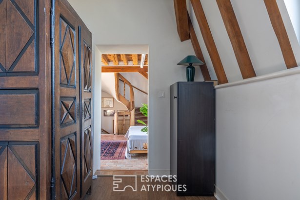 Finally, the second floor offers a spacious bedroom with a private shower room under an impressive exposed roof frame.
