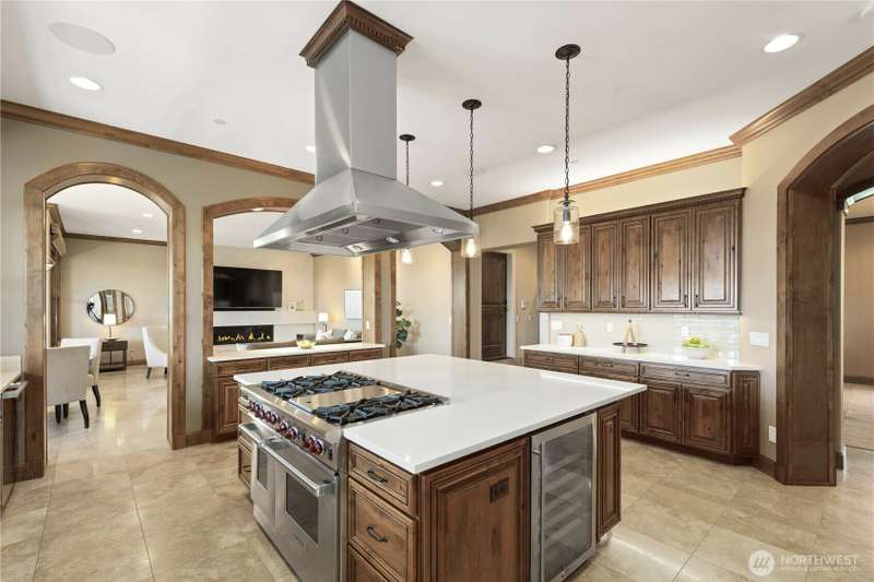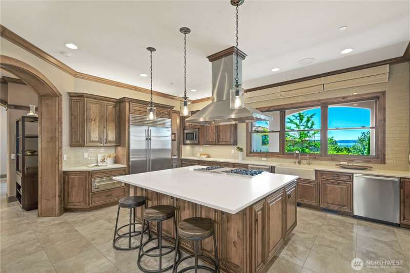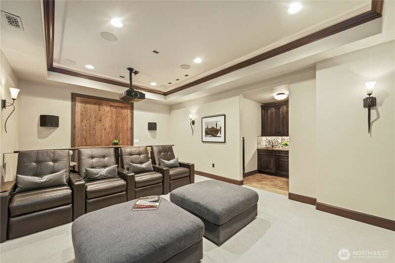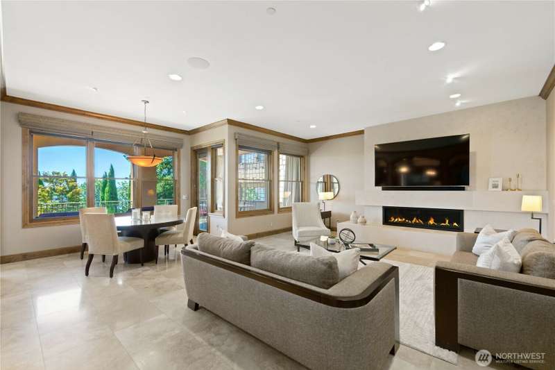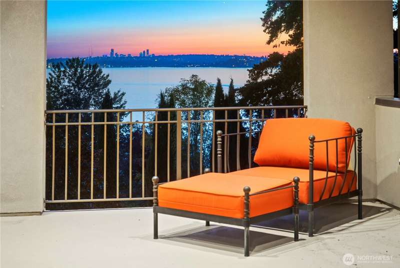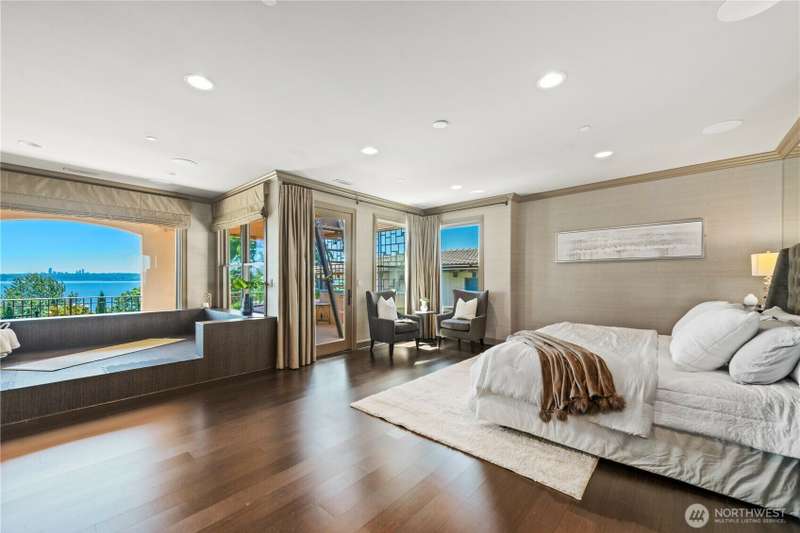 This exquisite view estate embodies luxury living with exceptional design, premium materials, and thoughtful craftsmanship. Glorious views of Lake Washington, city and mountains. The main level welcomes you to formal living and dining, stunning kitchen with large family room, handsome office and en suite bedroom. The upper level hosts 2 flex space rooms plus 4 en suite bedrooms all with individual access to decks including the significant primary suite. The lower level is incredible entertaining space with theatre room, rec room, family room, wine room, bar and en suite bedroom. Elevator services all 3 floors. Parking for 6 cars between 2 garages. Beautifully designed landscape with water feature and lighting creating lovely ambiance.