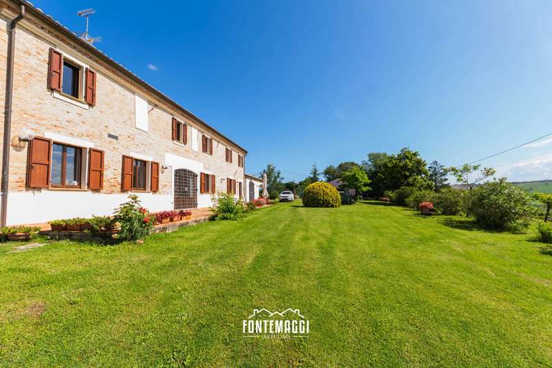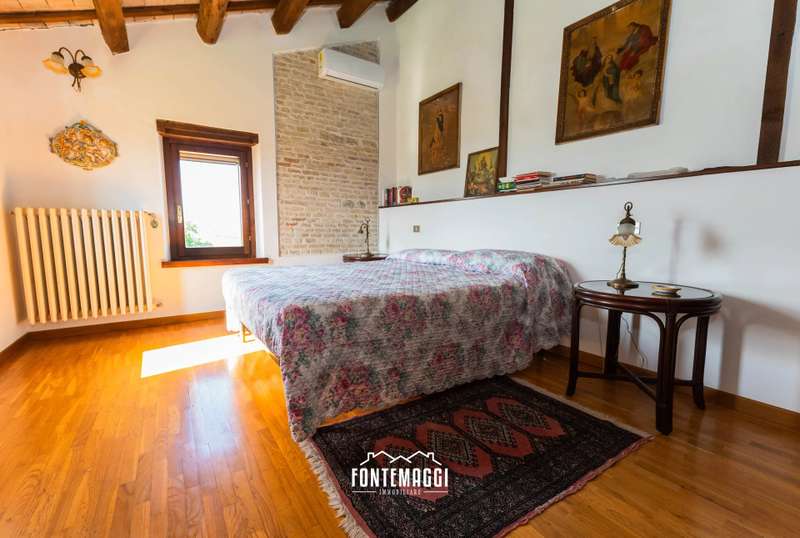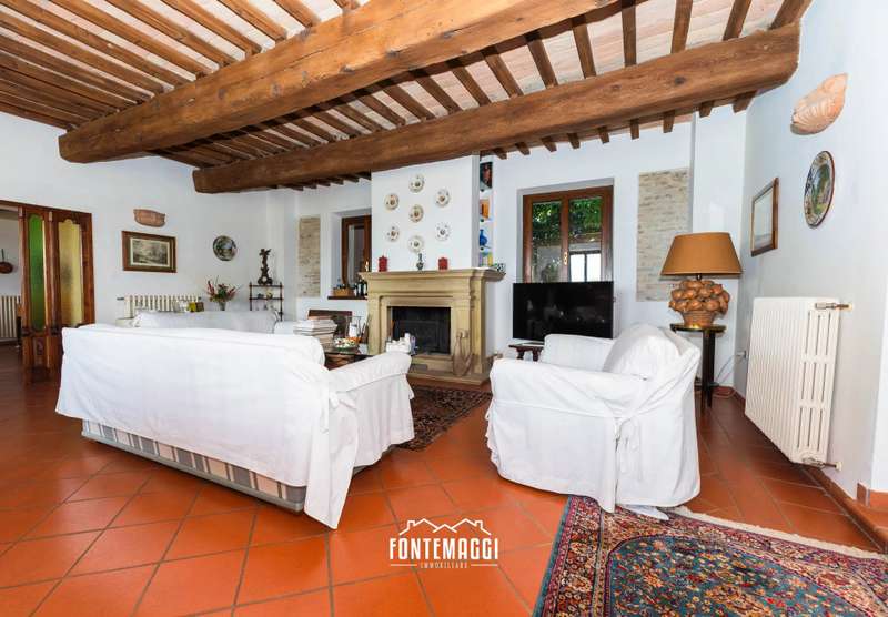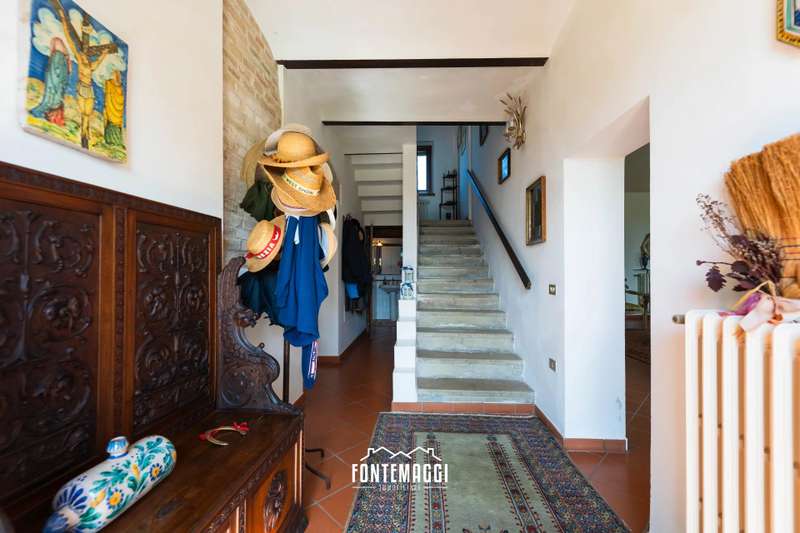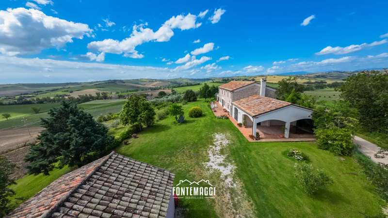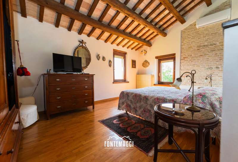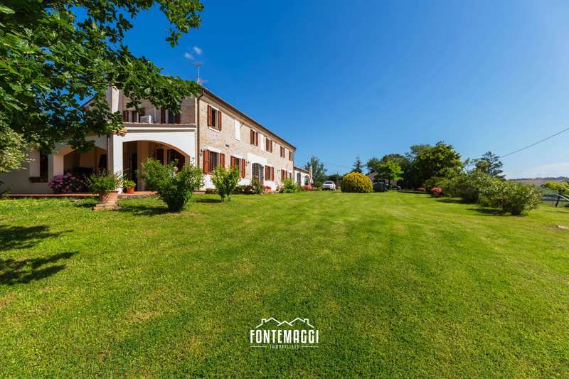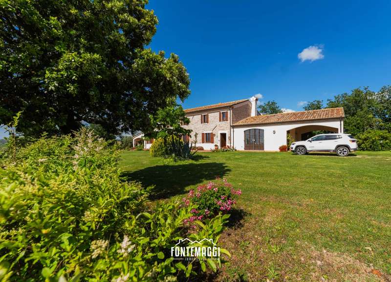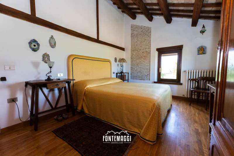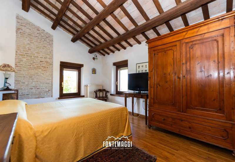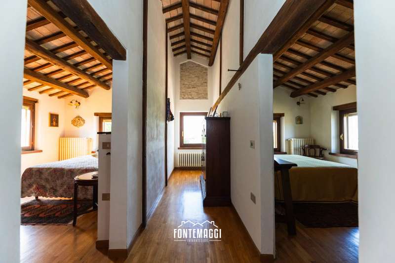 San Costanzo (PU). Nestled in the hills of the Marche region, in a panoramic and easily accessible position, well connected to the main roads. We offer for sale elegant 430sqm farmhouse completely renovated in 1994 with 120sqm accessory and fenced park of 5,000sqm. The property is developed on two floors: On the ground floor, the living area is characterized by large and bright rooms, the eat-in kitchen overlooks the porch with wood stove, the main living room with fireplace is illuminated by the large windows overlooking the garden, completes the floor a second living room with fireplace and exit to the porch, a service bathroom and the pantry. On the second floor, the sleeping area with original exposed beams consists of six comfortable bedrooms, the representative bathroom and a second bathroom with shower. All surrounded by a fenced park of 5,000sqm with a well and an accessory of 120sqm used as a garage. The property has been completely renovated preserving the original materials, is in excellent overall condition, elegant and beautifully finished. Always used as a second country house, it needs some routine maintenance work. The property is ideal as an accommodation facility / B&B activity, but also as a main residence or second home. Request: € 970.000 "APE G" IPE: 123 kwh/sqm/year