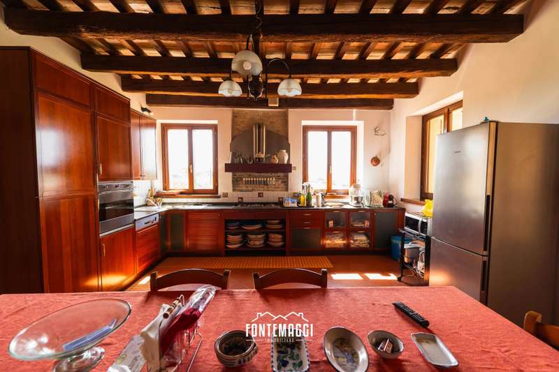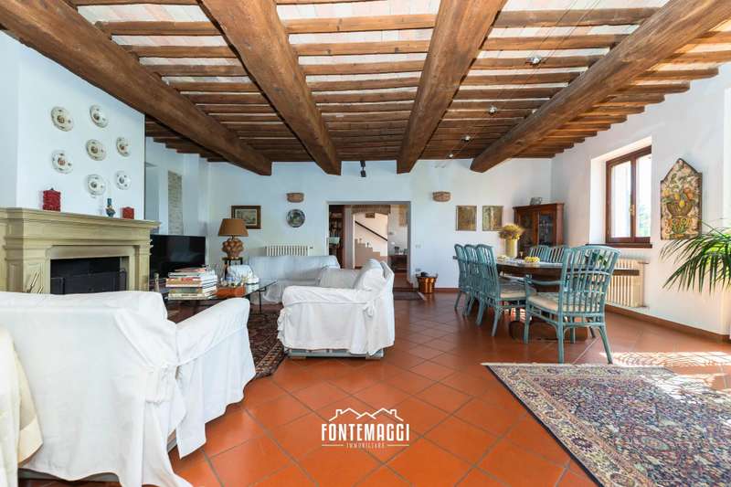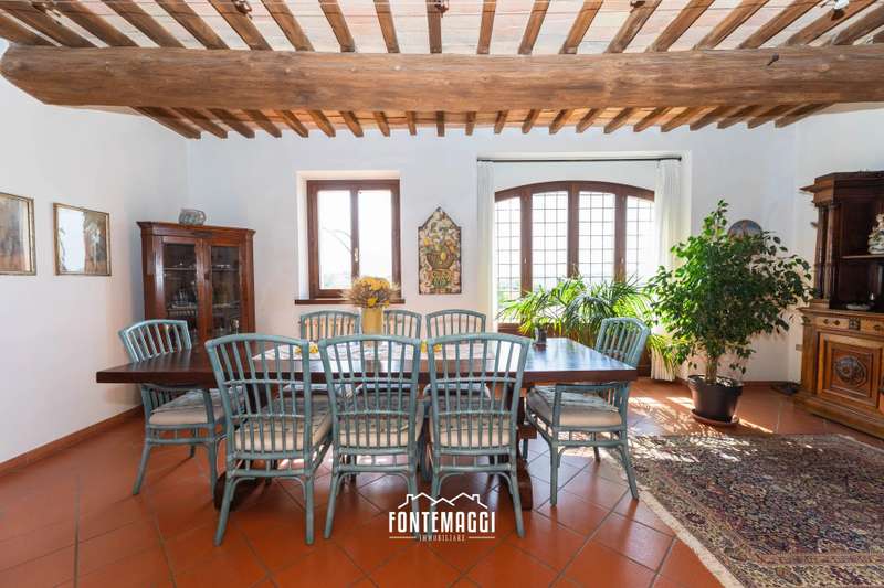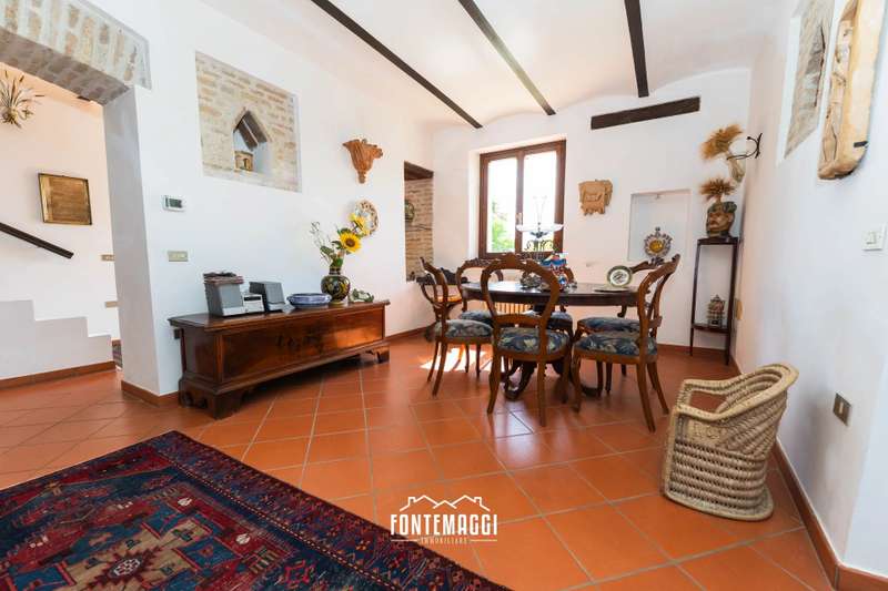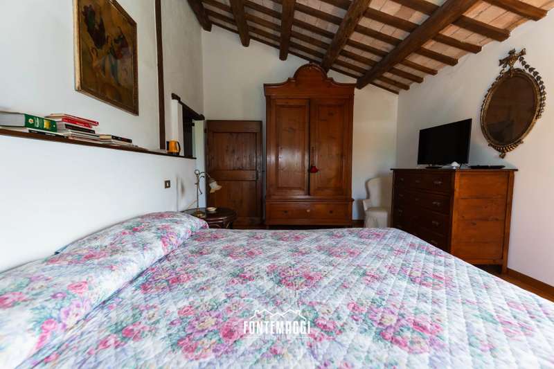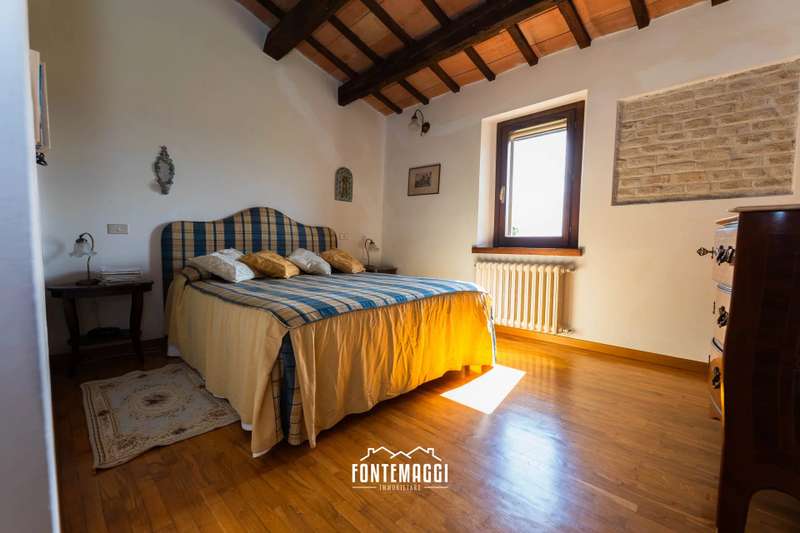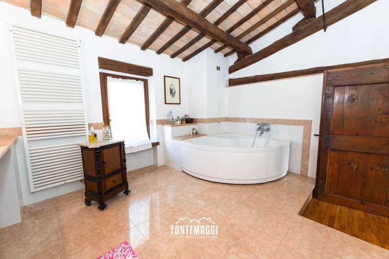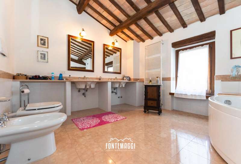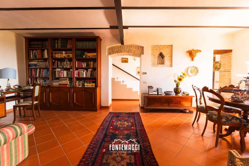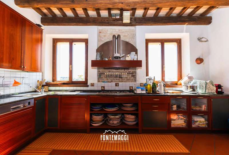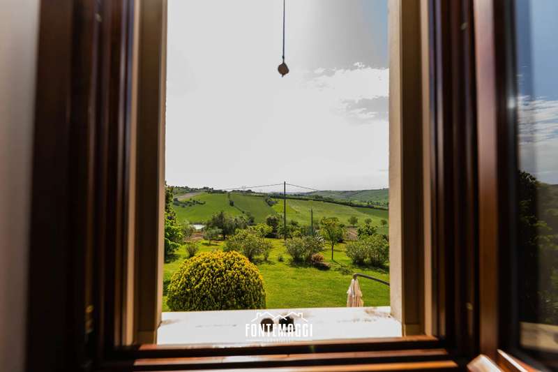 San Costanzo (PU). Nestled in the hills of the Marche region, in a panoramic and easily accessible position, well connected to the main roads. We offer for sale elegant 430sqm farmhouse completely renovated in 1994 with 120sqm accessory and fenced park of 5,000sqm. The property is developed on two floors: On the ground floor, the living area is characterized by large and bright rooms, the eat-in kitchen overlooks the porch with wood stove, the main living room with fireplace is illuminated by the large windows overlooking the garden, completes the floor a second living room with fireplace and exit to the porch, a service bathroom and the pantry. On the second floor, the sleeping area with original exposed beams consists of six comfortable bedrooms, the representative bathroom and a second bathroom with shower. All surrounded by a fenced park of 5,000sqm with a well and an accessory of 120sqm used as a garage. The property has been completely renovated preserving the original materials, is in excellent overall condition, elegant and beautifully finished. Always used as a second country house, it needs some routine maintenance work. The property is ideal as an accommodation facility / B&B activity, but also as a main residence or second home. Request: € 970.000 "APE G" IPE: 123 kwh/sqm/year
