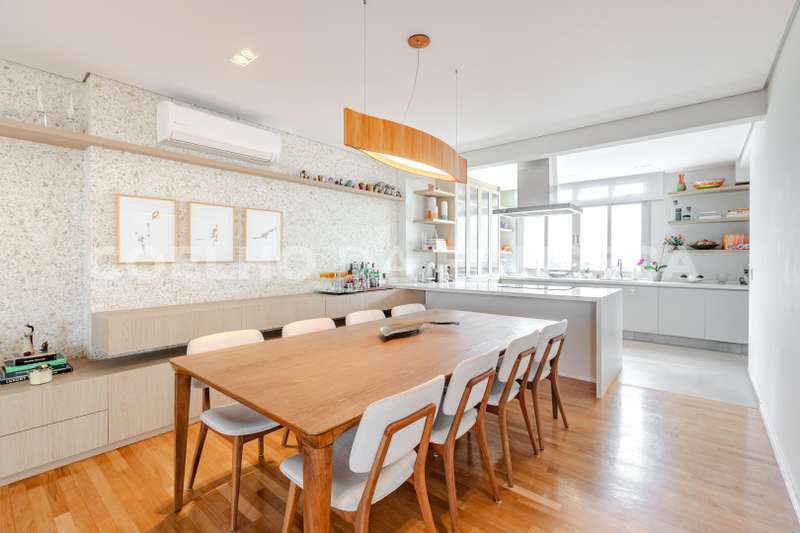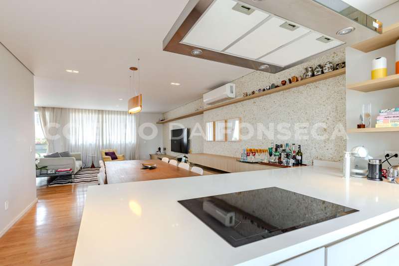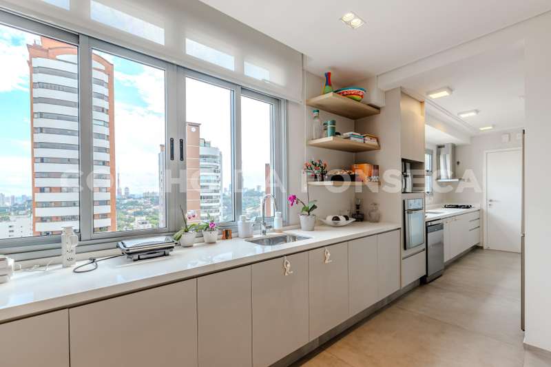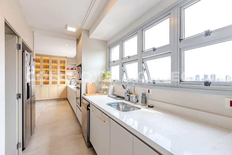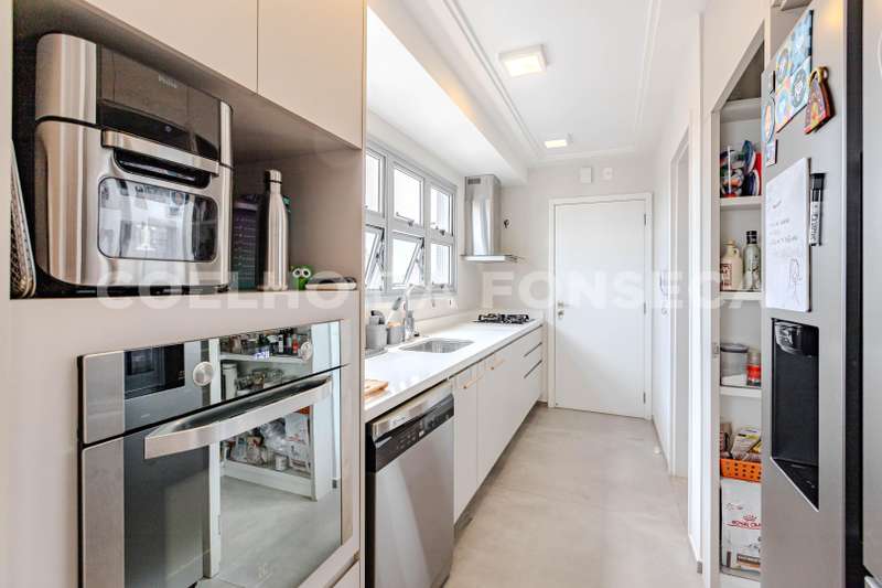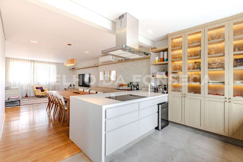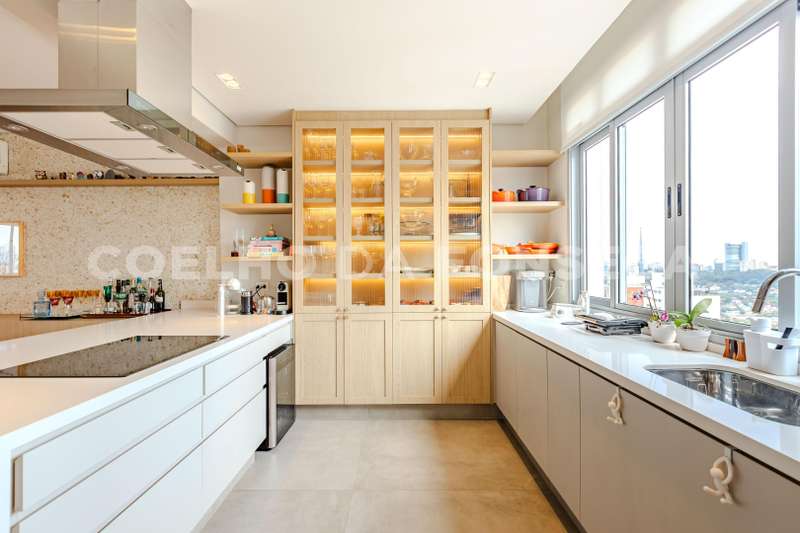 - Cozinha espaçosa e totalmente equipada, rica em armários, com dois fogões e duas pias, integrando-se harmonicamente com a sala para uma experiência moderna e funcional