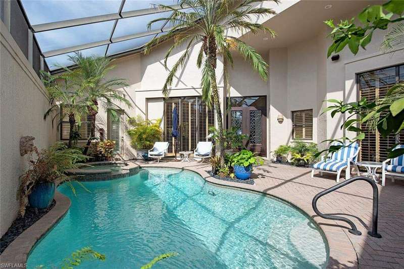 This beautiful custom-built home features recent updates, including a new tile roof and marble-faced fireplace. IN ADDITION, THE SELLER HAS A FULLY TRANSFERABLE GOLF MEMBERSHIP! The spacious chef's kitchen has custom cabinetry, a large walk-in pantry, and newer appliances. Custom 8ft. solid core doors and premium hardware throughout. Plantation shutters and 10ft. sliding glass doors open to the pool courtyard and guest cabana, Custom lighting, skylights, a home office, a central vacuum system, and a heated pool/spa with a waterfall, are just some additional amenities to make your living here a joy. Other notable features include an AqualLink control system, storm shutters, a 2-car garage, brick pavers, and a tropical courtyard. The golf course, lake, and mangrove views from your screened lanai are stunning. Windstar has a Tom Fazio-designed golf course, and clubhouse with spectacular views of Naples Bay and 72 slip deep water marina, affording direct gulf access in less than 10 minutes. The club has clay tennis courts, a fitness center, and the Keewaydin Island Beach Club with a boat shuttle and private membership.