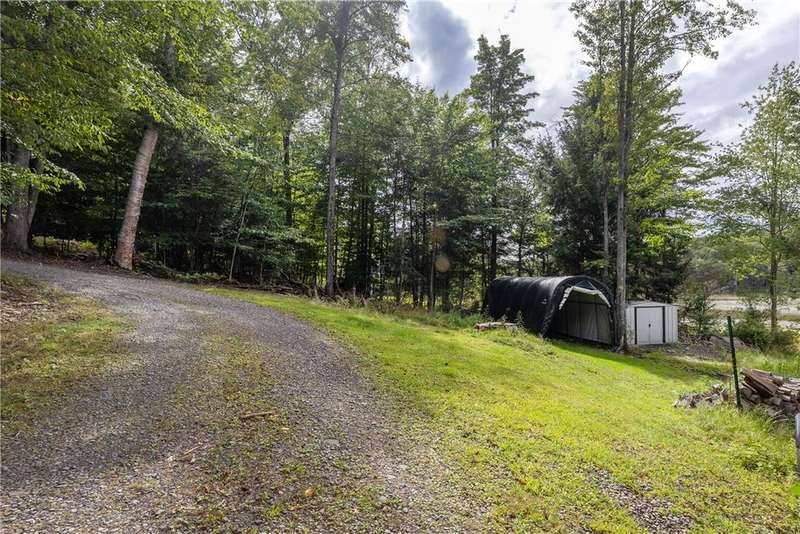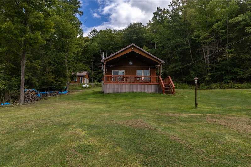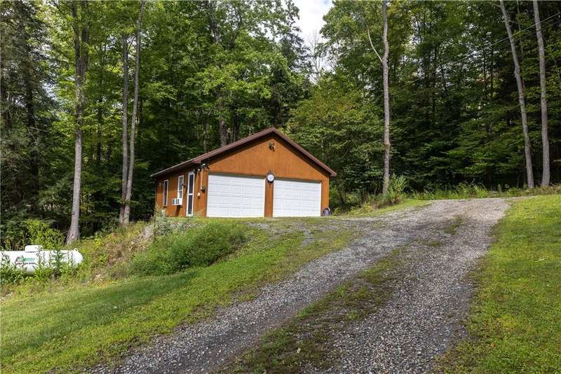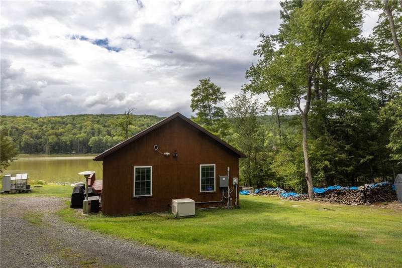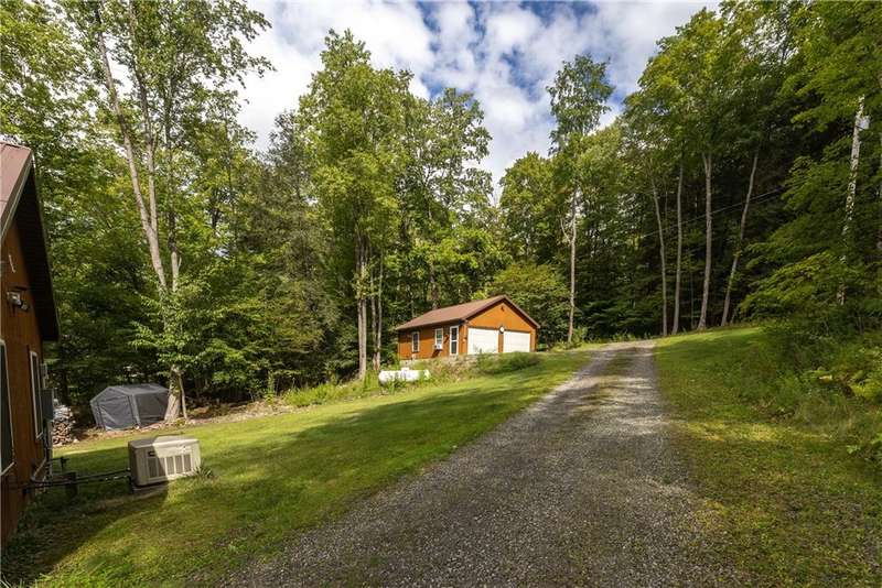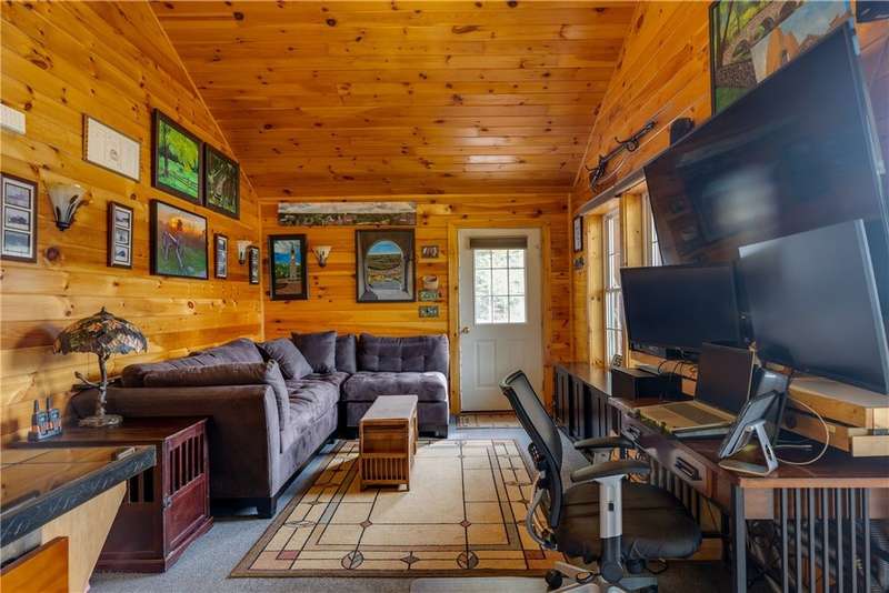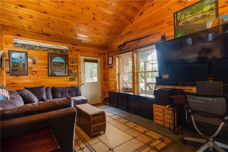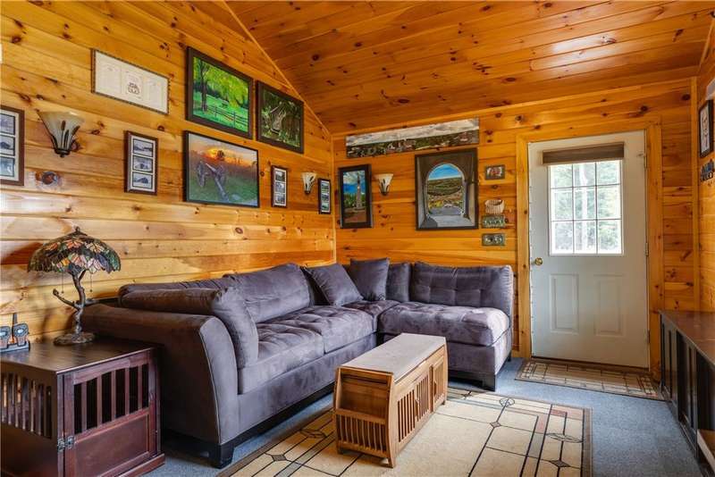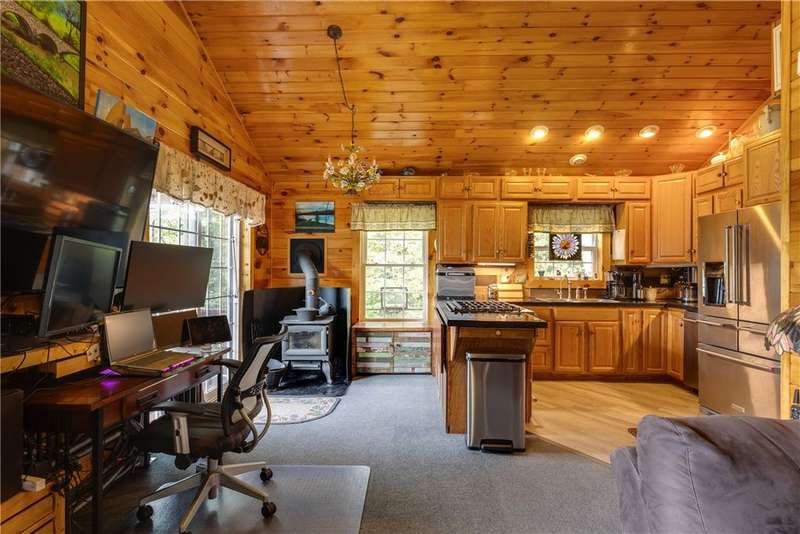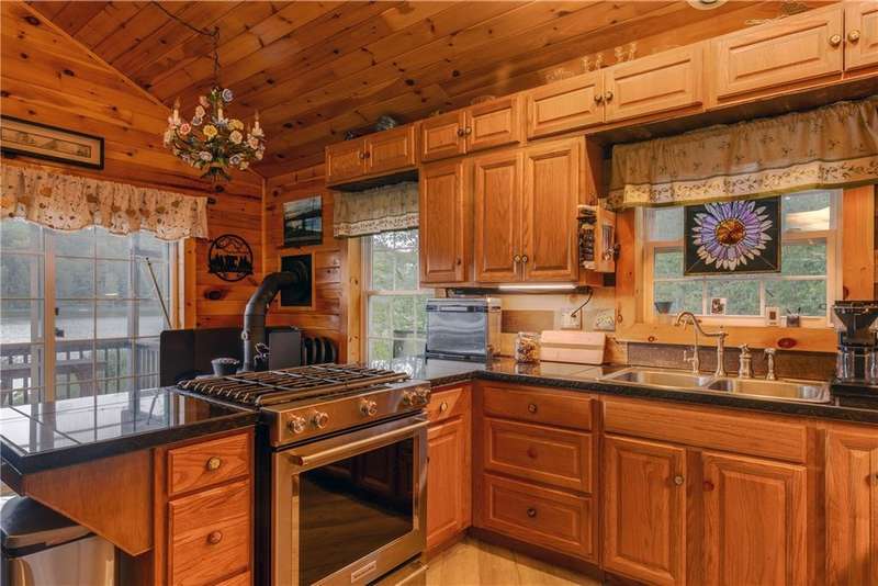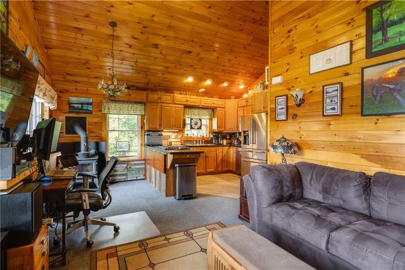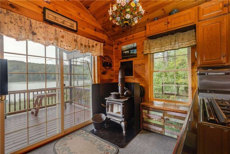 Year-round cabin retreat on a private lake in the desirable Tanglewood community! The main living area features an open-concept design with a newly updated kitchen, newer stainless steel appliances (3 years), and cabinetry with convenient roll-out shelving. A custom-built collapsible table/island adds function and charm.The home is equipped with a propane gas furnace (3 years old) with a humidifier and fan filtration system, a wood-burning stove, and even a makeshift central vac system. A whole-house automatic generator provides peace of mind, while the porch is enhanced with a retractable awning and shade for relaxing lake views. Water systems include a rented Culligan softener and an owned reverse osmosis system.Outside, you'll find a detached 2-bay garage?one side transformed into a heated and cooled "band" or hangout room with a refrigerator. Additional storage abounds with 3 collapsible ShelterLogic units, a shed, and a greenhouse. All of this on 5 acres.