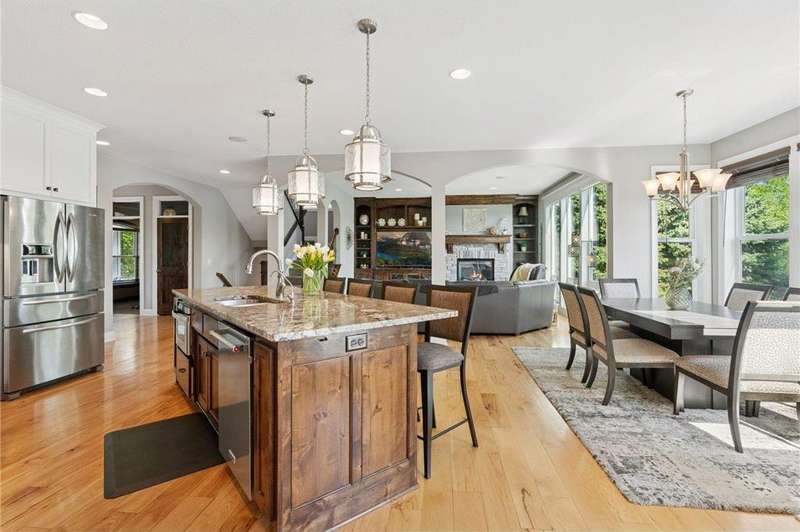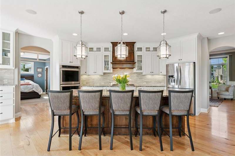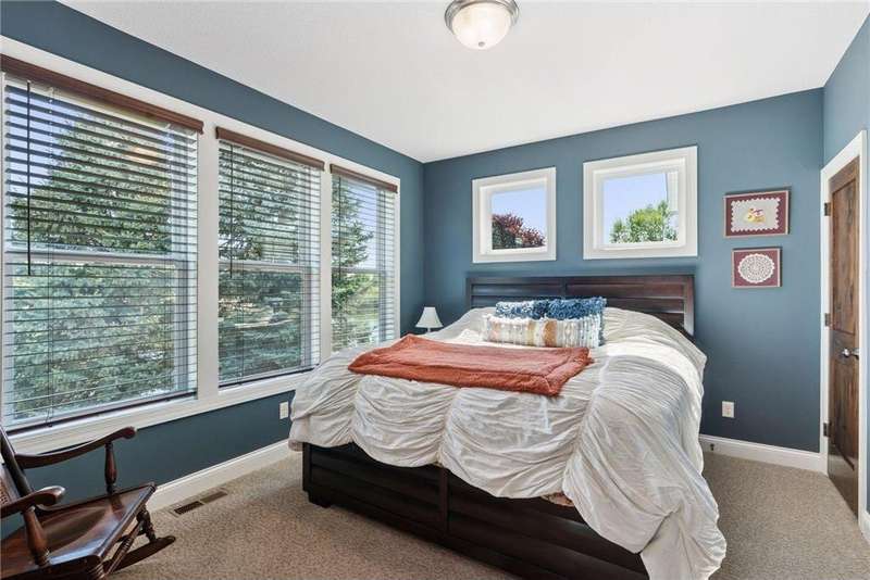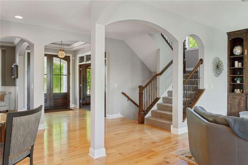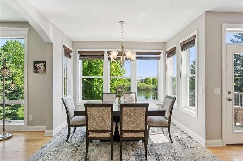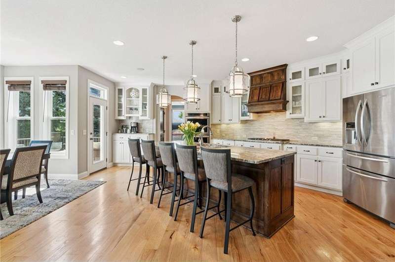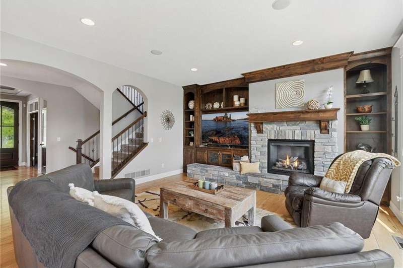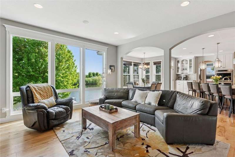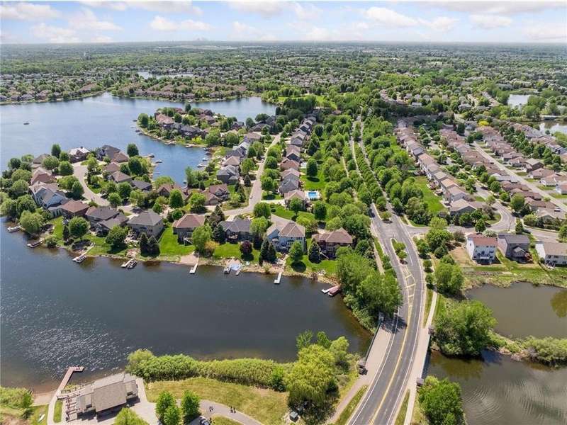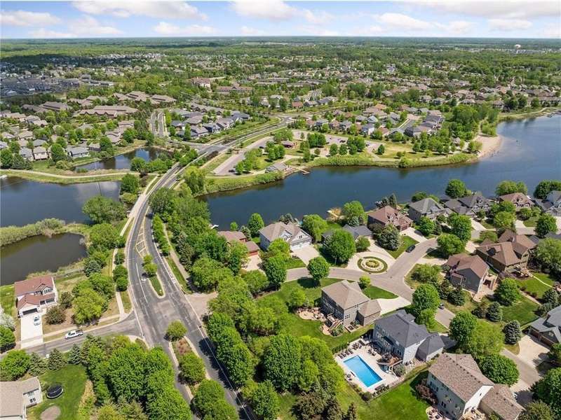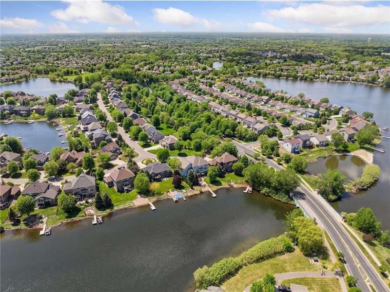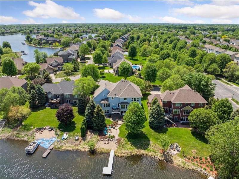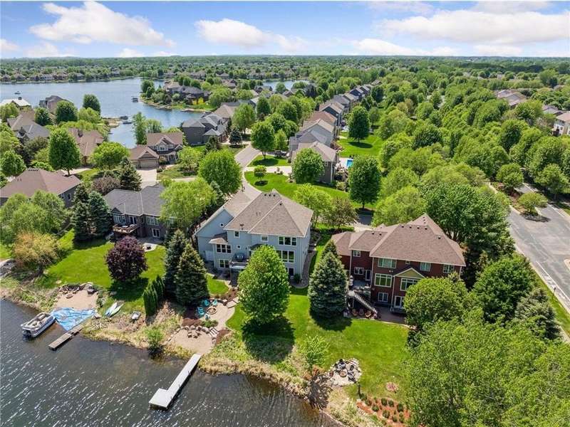 Welcome to this exquisite one-owner lakefront home, custom-built by award-winning Hanson Builders, showcasing unparalleled craftsmanship and timeless elegance. Nestled in the heart of The Lakes community on Sunrise Lake, this stunning 5-bedroom, 5-bathroom residence spans almost 5,400 square feet of meticulously designed living space, offering a perfect blend of luxury and comfort. Step inside to discover an open-concept main level featuring soaring ceilings, gleaming real site-finished hickory hardwood floors and abundant natural light. The gourmet kitchen is a chef’s dream, featuring top-of-the-line stainless steel KitchenAid appliances, granite countertops, a spacious center island, coffee bar, and custom cabinetry. The adjacent living room, with its cozy gas fireplace and built-in knotty alder shelving creates an inviting space for gatherings. Entertain your guests in the formal dining room or use it as a flex-space for reading and relaxing. Work from home? We have you covered with the private main floor office with French doors and custom-built cabinetry to store all your work items. A main floor “flex room” can also double as a bedroom or be used as a sunroom to look out at the lake. Upstairs, the primary suite is a true retreat, complete with a tray ceiling, walk-in closet, and a spa-inspired ensuite with dual vanities, a soaking tub, and a walk-in shower. Three additional bedrooms, one with a private ¾ bath and the other two share a jack and jill bath with separate tub and shower, are also conveniently located on the upper level. Unwind, watch a movie, have family game night, or get some homework done in the amazing bonus room! The lower level offers a versatile family room with warm fireplace and custom wet bar with full size refrigerator, ideal for entertaining your guests. An additional bedroom and exercise room complete the lower level. There’s also additional storage space under the stairs and in the mechanical room. Outside, the professionally landscaped yard features a maintenance-free deck and a serene custom paved patio and fire pit, perfect for enjoying Minnesota’s seasons. The oversized 4-car garage with floor drain provides plenty of storage and is completely insulated and ready for a garage heater. Additional storage is located in the garage and also in a backyard attached “shed” to store all your beach and lake toys. Located just minutes from top-rated schools, parks, shopping, and easy access to I-35W, this home combines suburban tranquility with urban connectivity. Impeccably maintained and thoughtfully designed, this masterpiece is ready for its next chapter. Schedule your private tour today to experience luxury living at its finest!