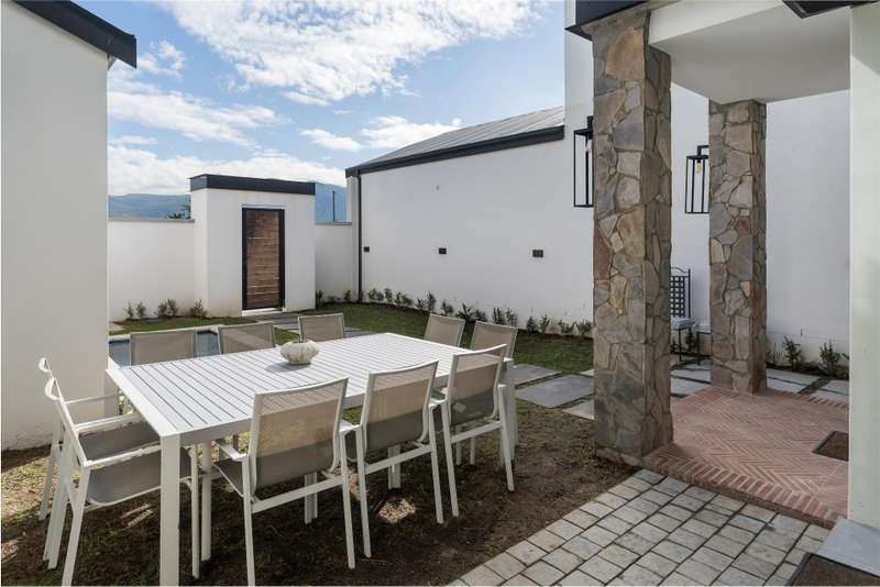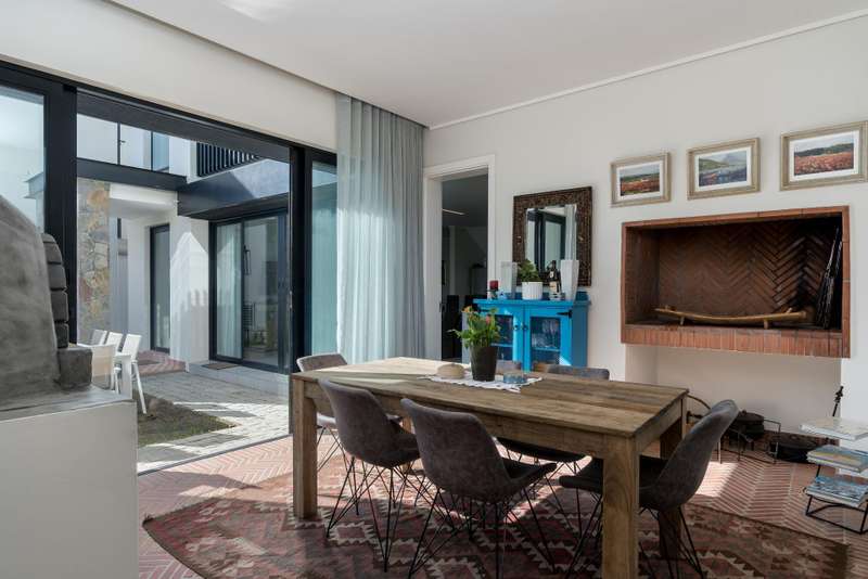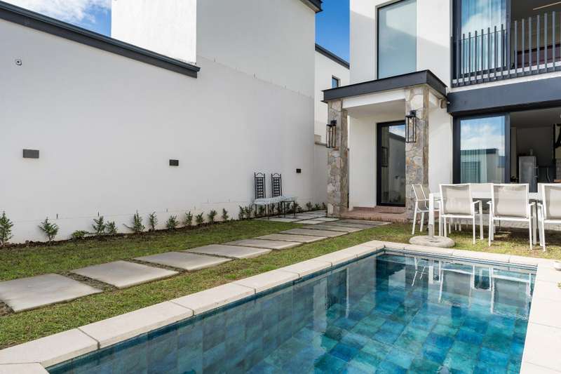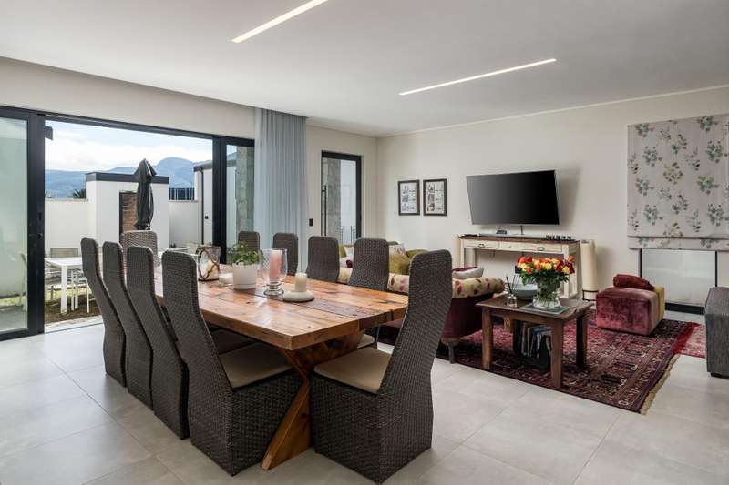 This brand new 3-bedroom home is perfectly located in the exclusive Drakenzicht Estate. Paarl?ÇÖs newest luxury residential development. This home presents a contemporary and spacious 280sqm offering with modern aesthetics, expansive interiors, and seamless blending of indoor and outdoor spaces. The lower level's open plan design encompasses the kitchen, living, and dining areas. A cosy entertainment room complete with built in braai and pizza oven lead onto the private garden with sparkling splash pool. Upstairs, 3 elegantly appointed en suite bedrooms are flooded with natural light and offer breathtaking mountain views. Additionally, a separate study adjacent to the main en suite provides a private sanctuary away from the main living spaces. Luxurious features of this new home include Oggie hardwood flooring, Stephen Pikus feature lighting above the kitchen island, an 8 kVA inverter with Sunsynk Lithium batteries, solar panels, Smeg appliances (integrated dishwasher, fridge, freezer, tumble dryer, washing machine), a wood burning fireplace, a swimming pool, and energy efficient integrated air conditioning in the living area and main bedroom. This exceptional property provides convenient access to top rated schools, world class restaurants, vineyards, and premium shopping venues, making it an ideal choice for families wanting a superior lifestyle in one of the Winelands most stunning locations. Don't overlook this chance to embrace sustainable luxury living at Drakenzicht Estate, Paarl!