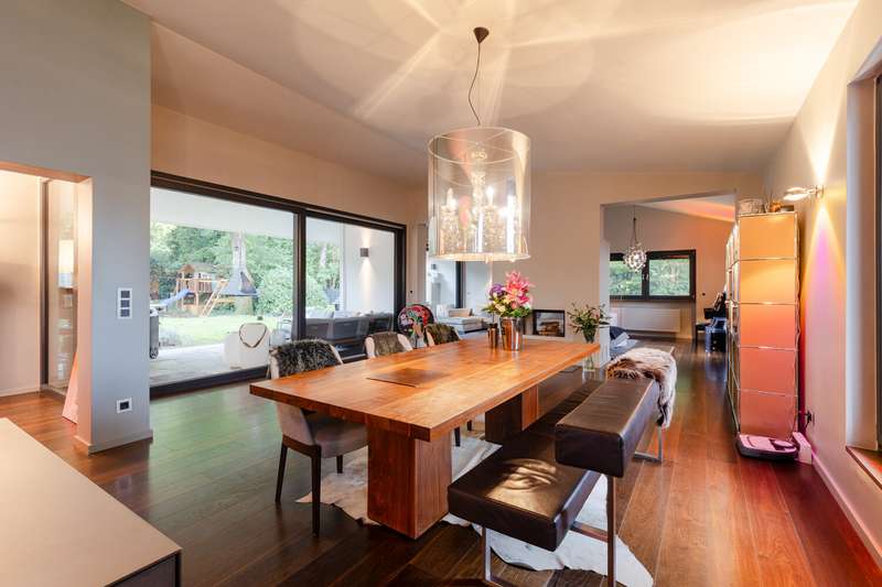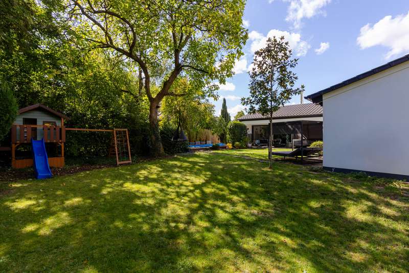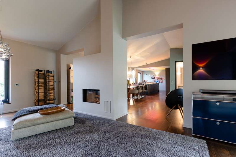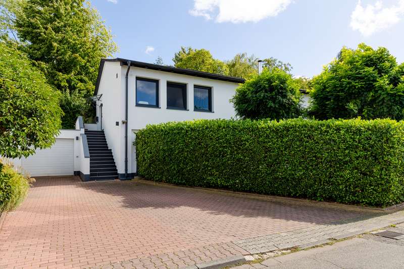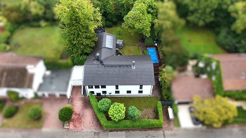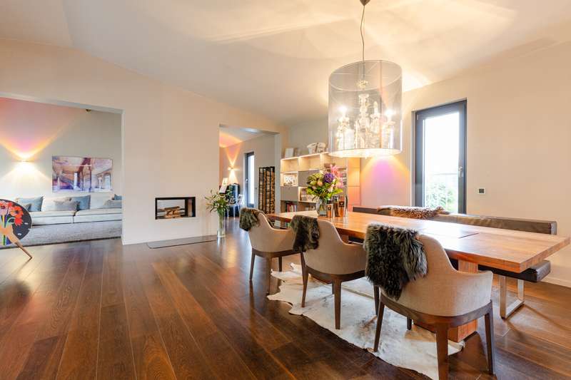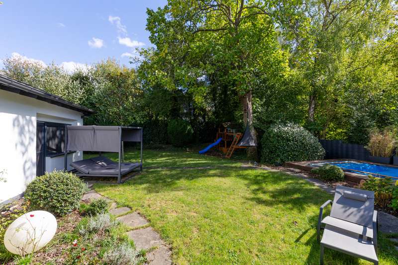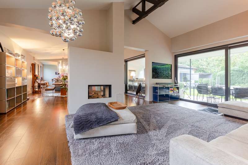 This villa combines timeless elegance with modern living comfort. On approx. 298 m² of living space and a generous plot of approx. 1,102 m², a home is being created that combines style, quality and comfort at the highest level. The modern six-bedroom villa impresses with its clearly structured floor plan. The loft-like living/dining area with open-plan kitchen and direct access to the spacious garden is a particular highlight. Five flexibly usable bedrooms and four modern bathrooms offer plenty of space for the whole family. The high-quality fittings are impressive down to the last detail: elegant, oiled floorboards, a custom-made "Leicht" fitted kitchen with Miele and Bora appliances, a stylish exposed fireplace in the living and dining area and large windows with triple glazing and electric shutters create a harmonious living ambience. The villa was extensively renovated in 2007, 2016 and 2018. The windows, roof and alarm system are state of the art. The efficient oil condensing heating system is also supplemented by solar collectors. The outdoor area is also impressive: the well-tended garden with mature trees, automatic irrigation system and several terraces invites you to linger. An outdoor pool provides refreshment in summer, while the garage and additional parking space offer practical convenience. The garden level opens up numerous possibilities for individual use and development. It currently comprises three spacious rooms, two bathrooms and several smaller ancillary rooms. The direct access to the private garden via a spacious terrace and to the pool and main garden area of the villa is particularly attractive. This floor can also be flexibly designed - for example as an independent garden apartment, a modern home office or an exclusive area for sport and wellness (see floor plan variant 2). Another advantage is the separate entrance with its own house number, which is ideal for guests or house staff. All in all, this is a stylish home for discerning people who value spaciousness, quality and an exclusive living environment - ready to move into.