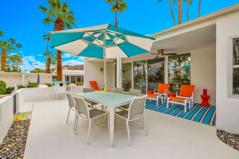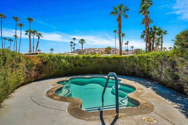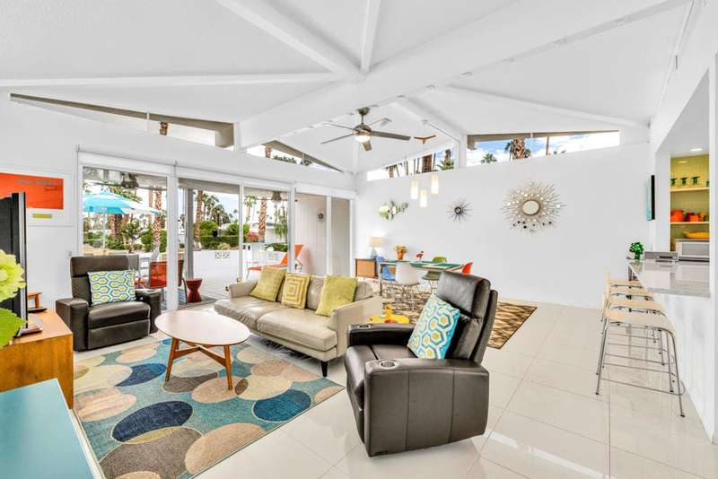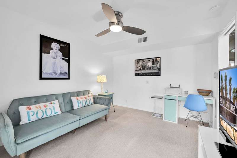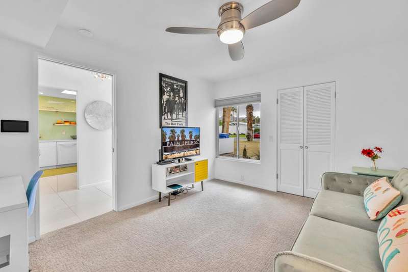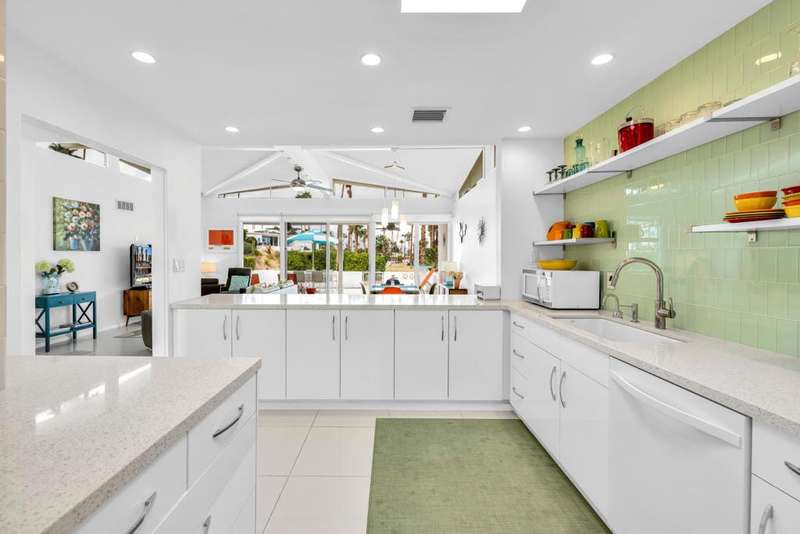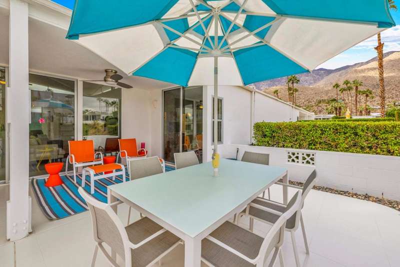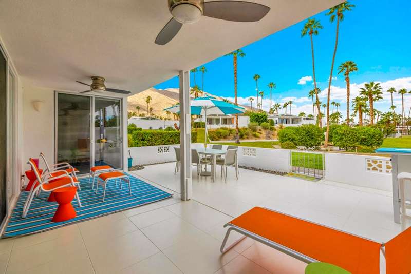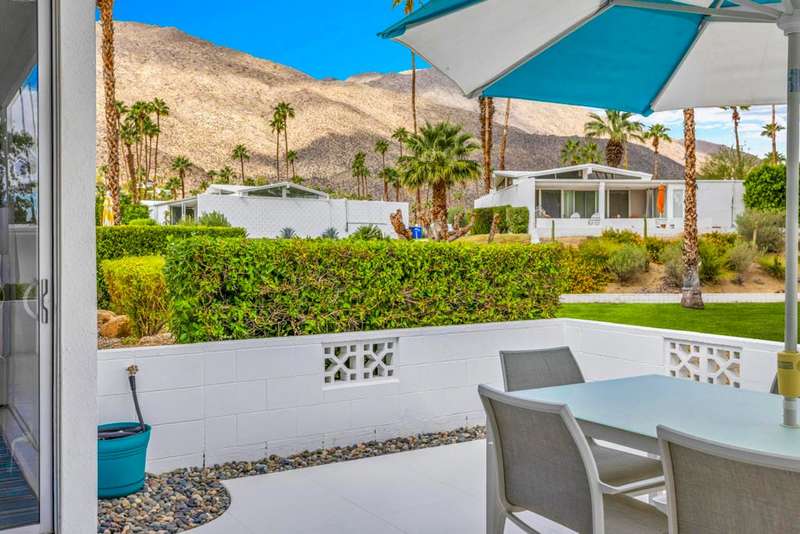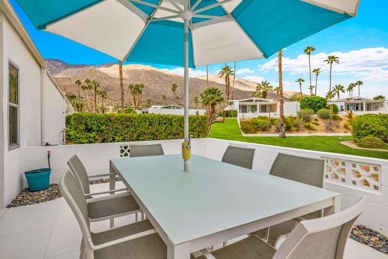 Canyon View Estates Cul-de-Sac End Unit offers 3 bedroom 2 Bath (2 plus Den) in 1636 square feet. Beautiful, move-in-condition, highly upgraded unit. Architect's Palmer & Krisel's mid-century architecture shines with the significant double-gable roofline supported with four clerestory windows. Fine finishes and good taste are evident throughout with polished white tile floors, terrazzo style counter-tops, a cook's kitchen with stylish open shelving, white complimentary appliances and a skylite flooding the room with natural light. The great room provides for living and dining with the oversized terrace extending the indoor-outdoor livability. The Den/3rd bedroom, guest bedroom and primary bedroom are carpeted with both upgraded baths featuring tile floors. Bathrooms have skylites, beautiful tile work and custom vanities. Expansive views from all rooms offer low-density, green belt and mountain surrounds. Many upgrades make this home a good value for this very desirable neighborhood. Plentiful storage, washer / dryer in unit and owned Solar too! Gas tankless hot water heater and central vacuum. Roof, windows, HVAC and sewer line are upgraded.