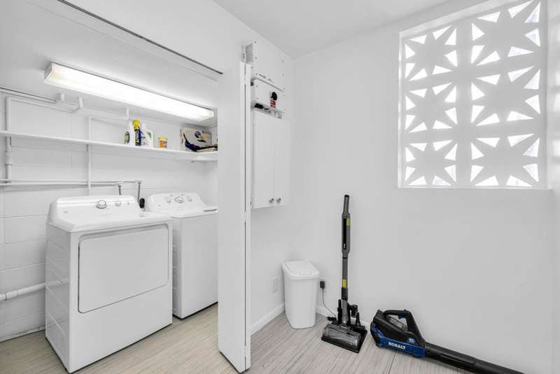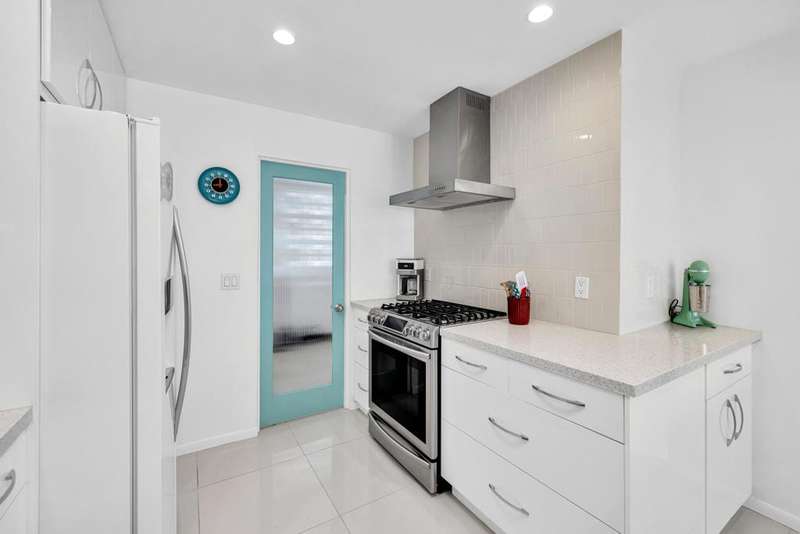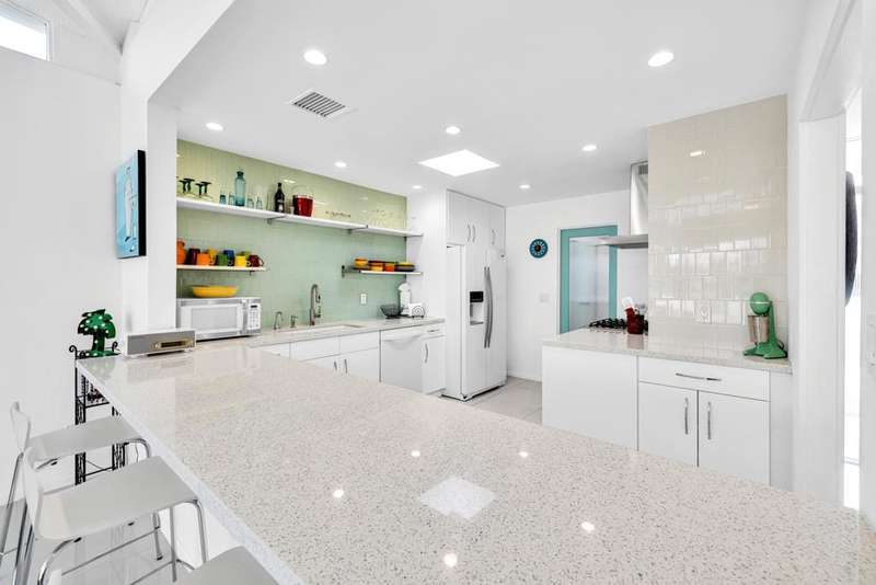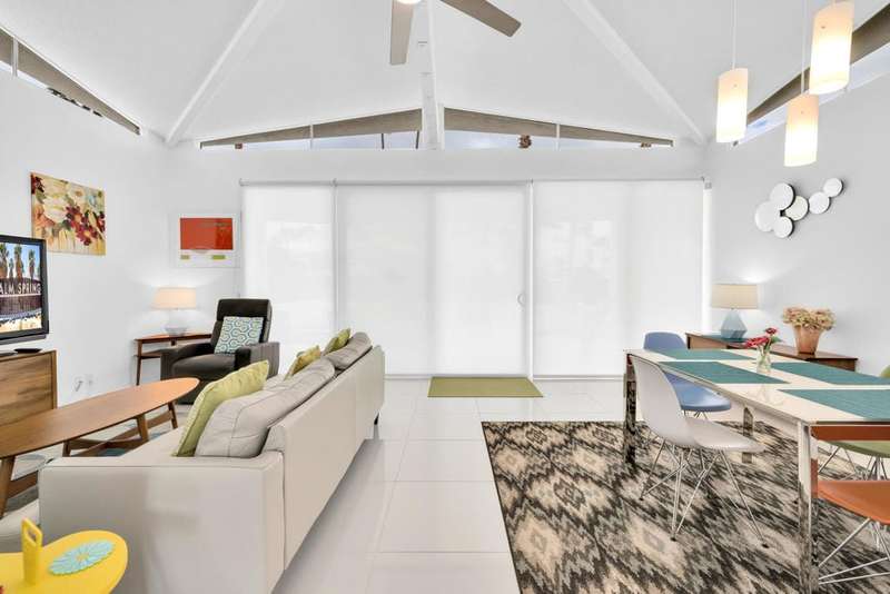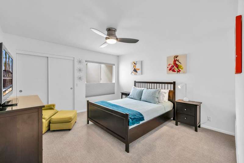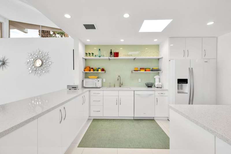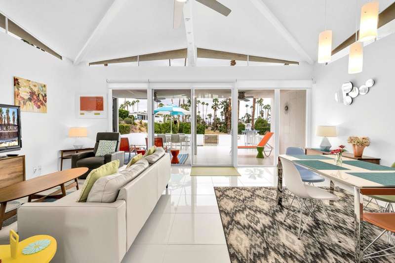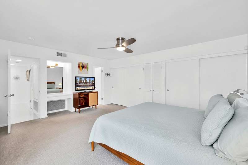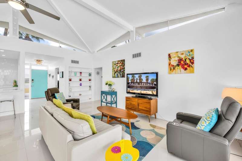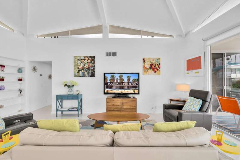 Canyon View Estates Cul-de-Sac End Unit offers 3 bedroom 2 Bath (2 plus Den) in 1636 square feet. Beautiful, move-in-condition, highly upgraded unit. Architect's Palmer & Krisel's mid-century architecture shines with the significant double-gable roofline supported with four clerestory windows. Fine finishes and good taste are evident throughout with polished white tile floors, terrazzo style counter-tops, a cook's kitchen with stylish open shelving, white complimentary appliances and a skylite flooding the room with natural light. The great room provides for living and dining with the oversized terrace extending the indoor-outdoor livability. The Den/3rd bedroom, guest bedroom and primary bedroom are carpeted with both upgraded baths featuring tile floors. Bathrooms have skylites, beautiful tile work and custom vanities. Expansive views from all rooms offer low-density, green belt and mountain surrounds. Many upgrades make this home a good value for this very desirable neighborhood. Plentiful storage, washer / dryer in unit and owned Solar too! Gas tankless hot water heater and central vacuum. Roof, windows, HVAC and sewer line are upgraded.