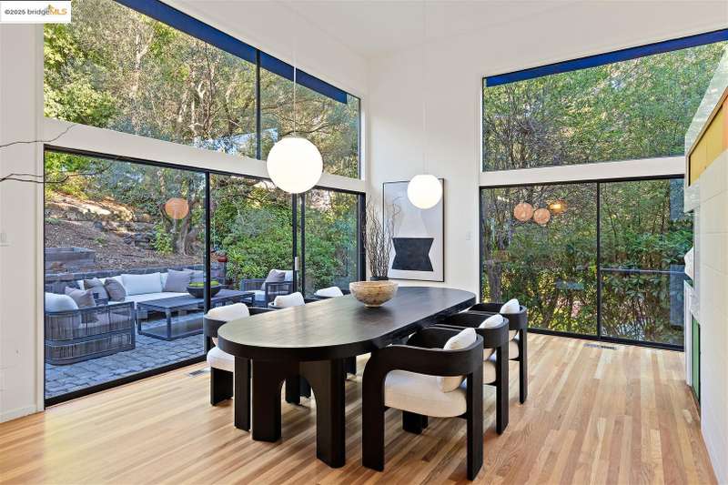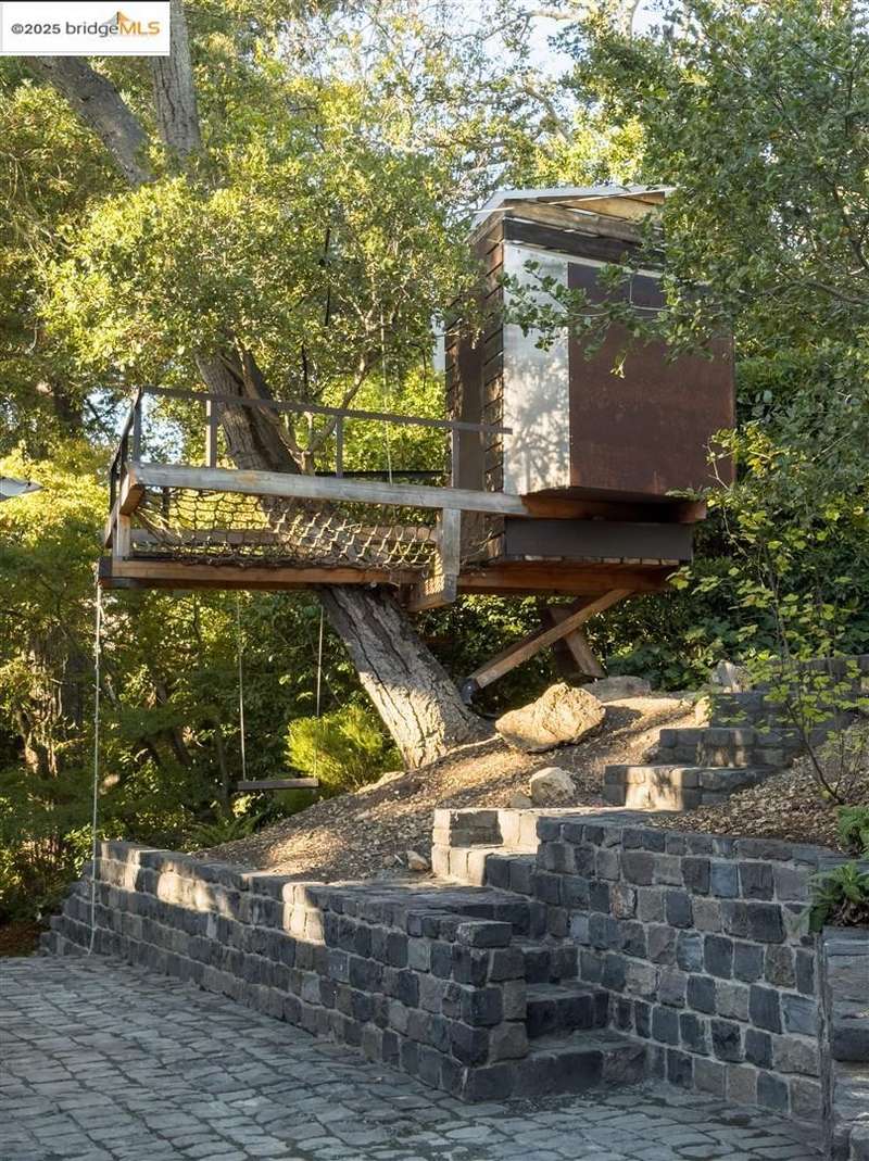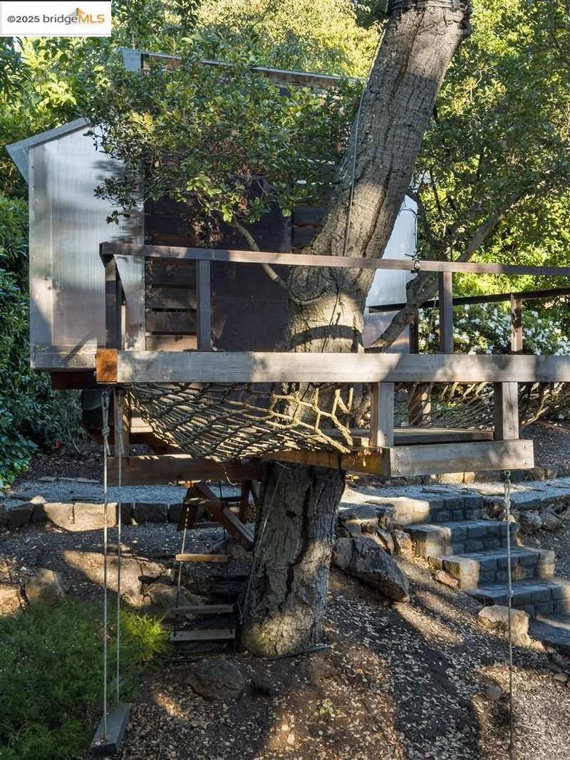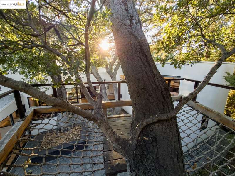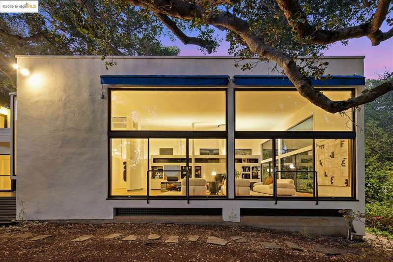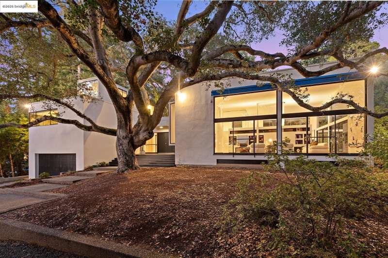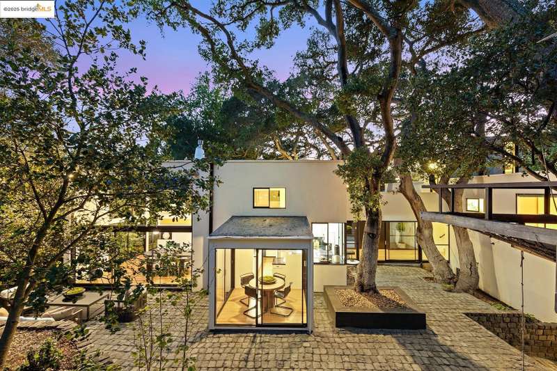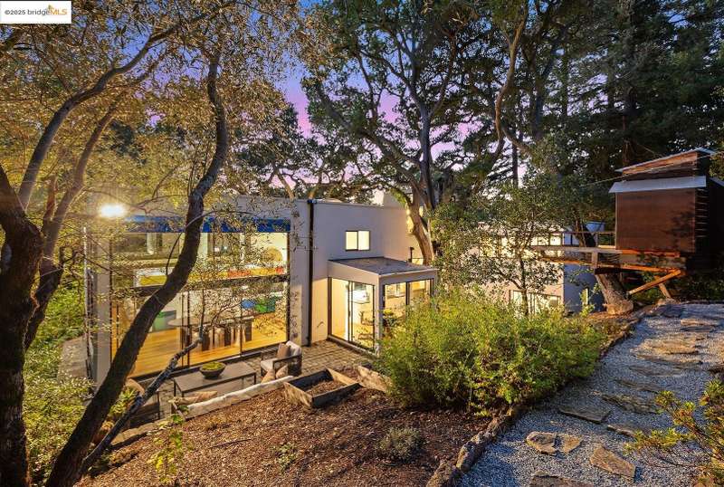 Architectural legacy meets California tranquility in this AIA-recognized residence by acclaimed architect Donald Olsen. Built in 1967 for his close friend David Ruth, this mid-century modern architecture includes a friendly floorplan with 4 bedrooms and 3 full baths, showcasing Olsen's signature integration of geometry, light, and nature. Built on a secluded knoll-lot of approximately 0.38 acres around a magnificent heritage coastal live oak and perched above a serene creek, the home captures the essence of Berkeley's architectural and natural beauty. Thoughtfully preserved and meticulously improved, the property features walls of glass, original hardwood floors, seismic upgrades, landscape renovations by RDG Landscape Architects including a full native-plant and creek restoration, illuminated walkways, and the exterior patio is embossed with San Francisco cobblestones. A custom O2 Treehouse floats among the oaks, adding playfulness to the refined design. Set in the prestigious Claremont neighborhood, this property offers ADU or multi-generational potential and effortless access to the Claremont Club & Spa, Rockridge BART, and freeway access.