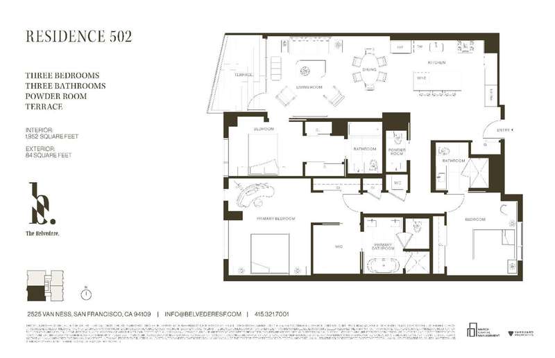 The Belvedere, designed by world-renowned Handel Architects, is a culmination of elevated architectural design, tailor-made shared spaces, and 28 brand-new refined homes gracing San Francisco's prestigious Cow Hollow neighborhood. A concrete and steel structure built in 2024, The Belvedere features an exquisite, attended lobby, and incredible views captured from the two and three-bedroom homes. Crowning The Belvedere is an expansive, 6,200 sqft resort-style roof terrace with picture perfect views of the Golden Gate Bridge and San Francisco's most notable hills. The elegant kitchens include Miele appliances and gorgeous Gabana Quartzite stone, while the spa-like bathrooms are equipped with Waterworks fixtures and adorned in imported Calacatta stone. Additional features include: air conditioning, add'l storage, and bicycle parking. Residence 502 is a Golden Gate Bridge VIEW home boasting 3 beds/3.5 baths and 1,951 sqft with a spacious great room that leads to a covered terrace. The Belvedere is in a fantastic walking area, with the bustling shops, restaurants, and cafes of Union St in Cow Hollow right outside your door. Russian Hill, Pacific Heights, and The Marina are all just minutes away.