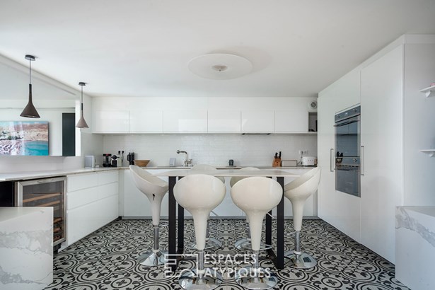 The fully equipped open-plan kitchen, opening onto the main room, seamlessly extends this spectacular living space.
