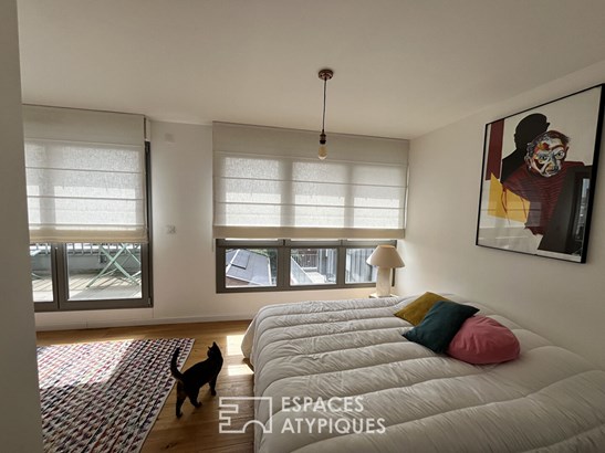 A loft spirit bathed in light. 58m2 of living space. Custom-fitted American kitchen with central island. Large living room, dining room with solid Italian parquet flooring opening directly onto the terrace. 26m2 master suite with dressing room, toilet and large walk-in shower. 2 beautiful children's or teenager's bedrooms on the lower level with wardrobes. 1 balcony for one of the 2. Shared bathroom for independence. Toilet, laundry room and entrance hallway. Garage extra 30,000 Euros
