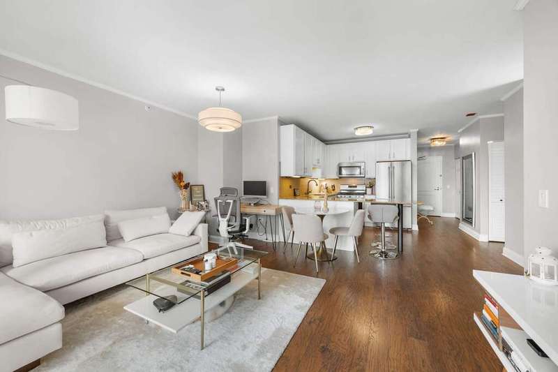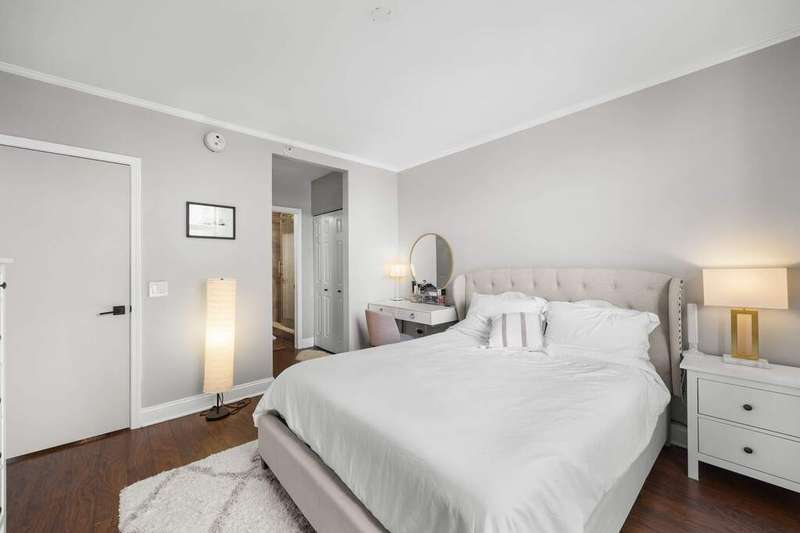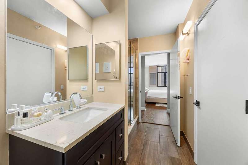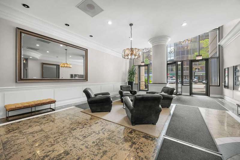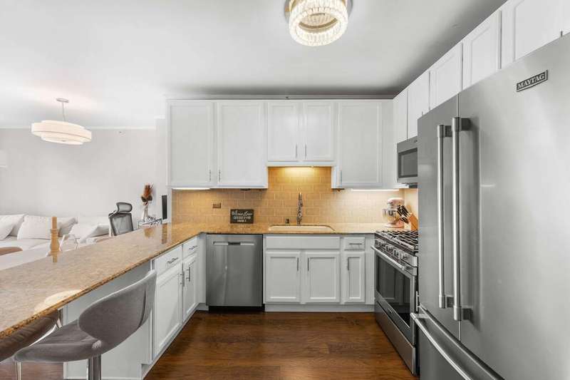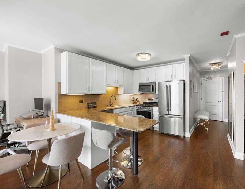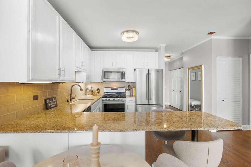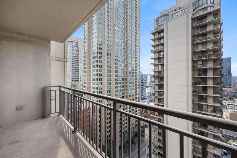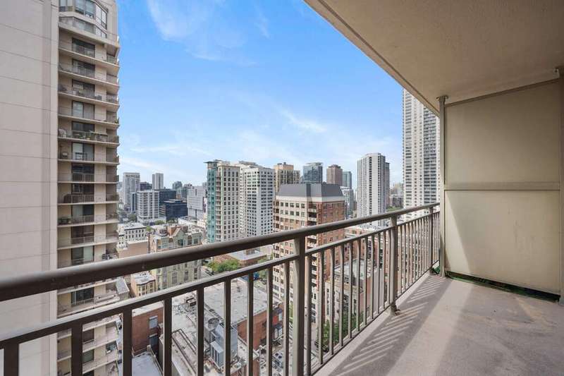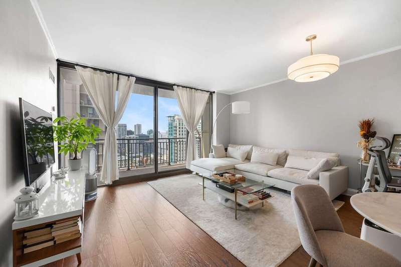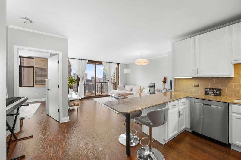Welcome to this bright, high-floor 800+ square foot 1 Bedroom, 1 Bathroom condo located in the epicenter of River North! Upon entering, you are greeted with an expansive open concept floor plan offering a large, west-facing living room featuring laminate wood flooring with ample room for a work from home space along with a cozy dining room table. Floor to ceiling windows let in excellent afternoon sunlight and open to your huge balcony to enjoy your morning coffee or evening cocktail! Graciously sized kitchen offers a breakfast bar, granite countertops, under-mount sink, tile backsplash, and stainless-steel appliances! Spacious bedroom with two large closets, blackout shutter-style shades, and en-suite access to the bathroom! Updated bathroom with beautiful walk-in tile shower with sliding glass door and granite vanity. Additional features include a large foyer closet, Nest thermostat, and in-unit laundry! Garage parking space offered for additional 25K. Building offers 24-hour doorstaff, fitness center, and hospitality room. Assessments include cooking gas & heat, cable/internet, and parking! Excellent location near World-class dining and entertainment, multiple grocery stores, and Red Line CTA access.