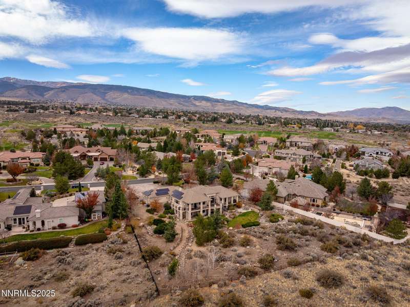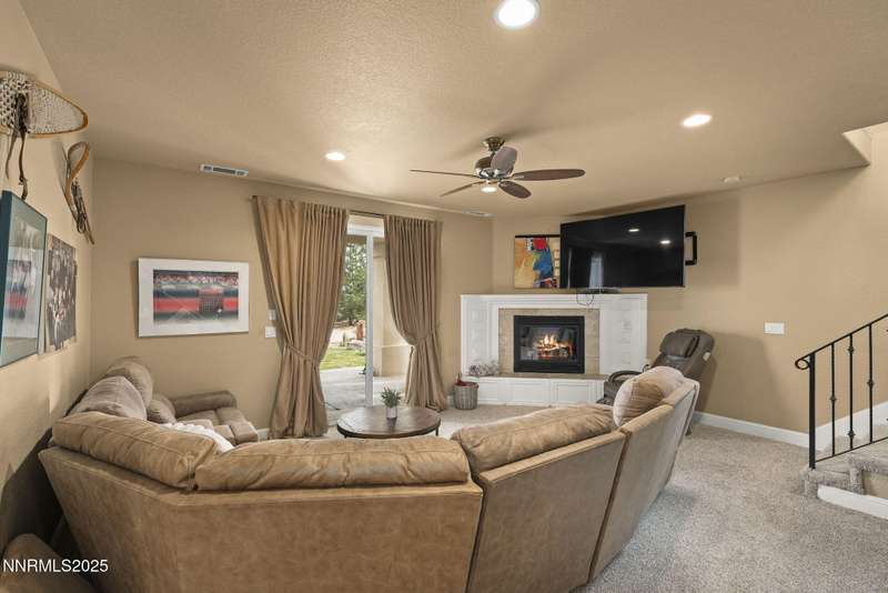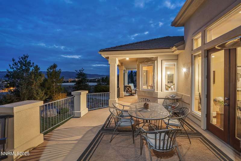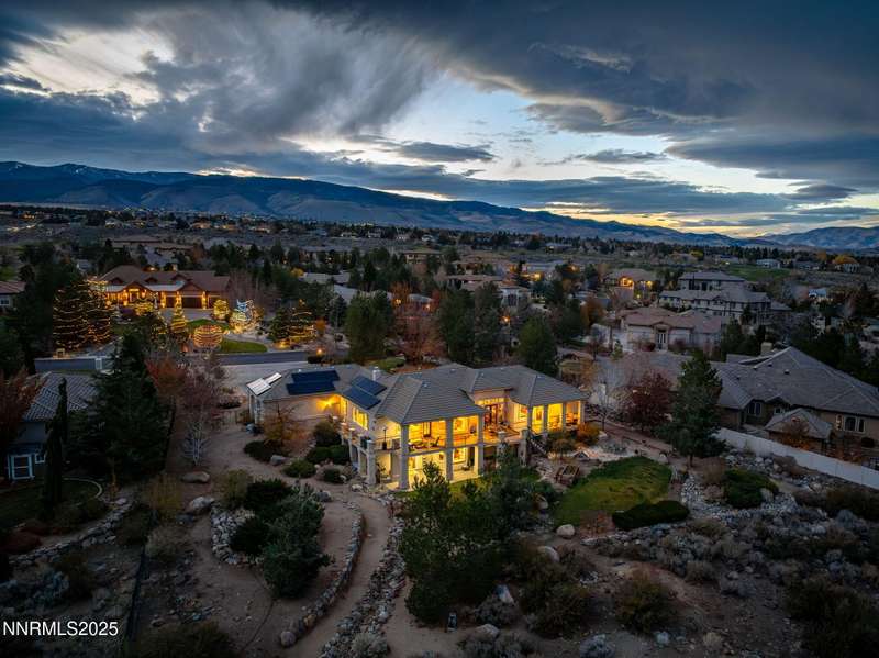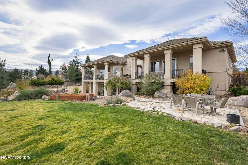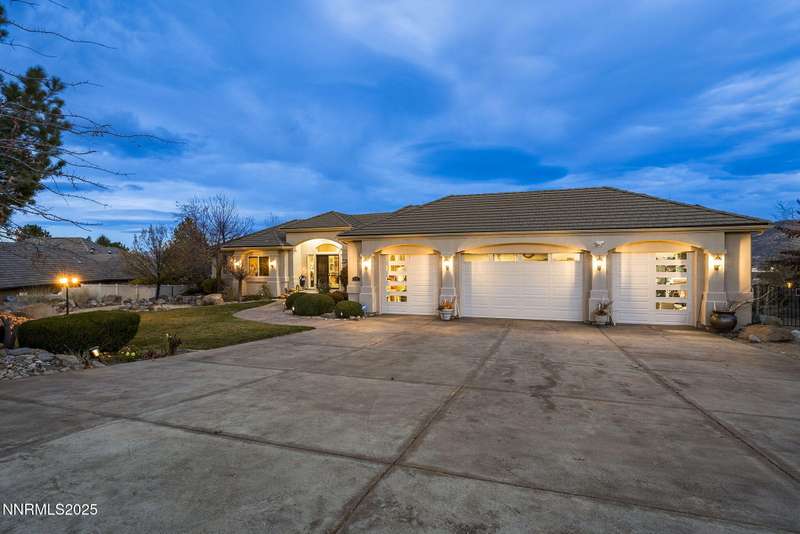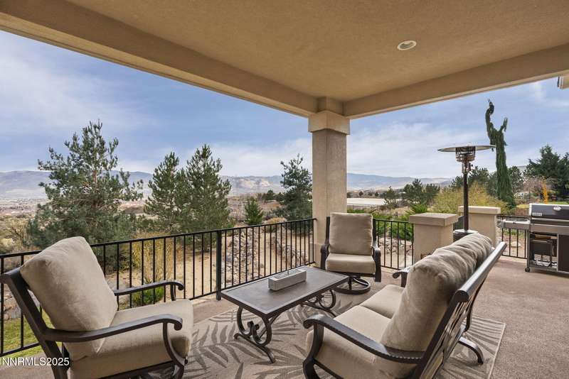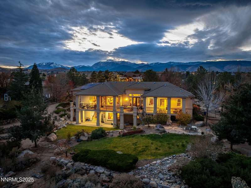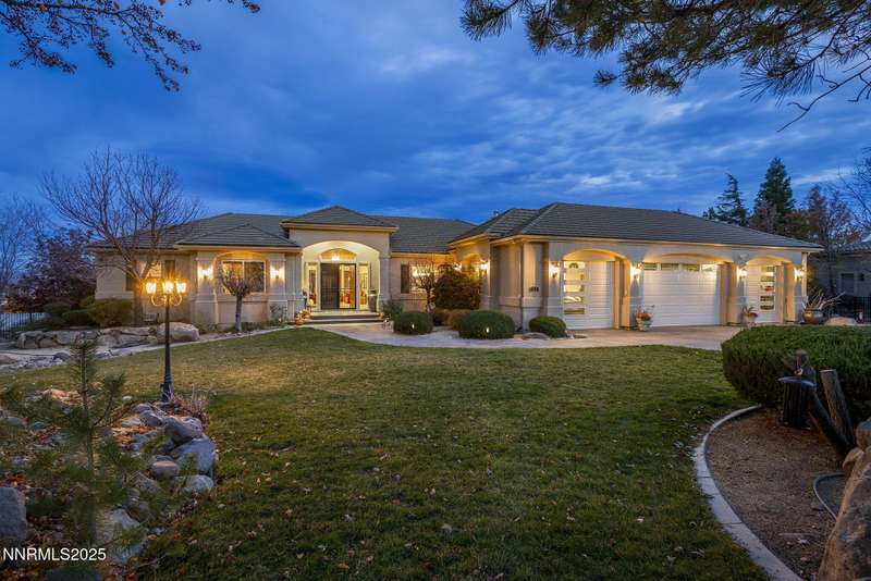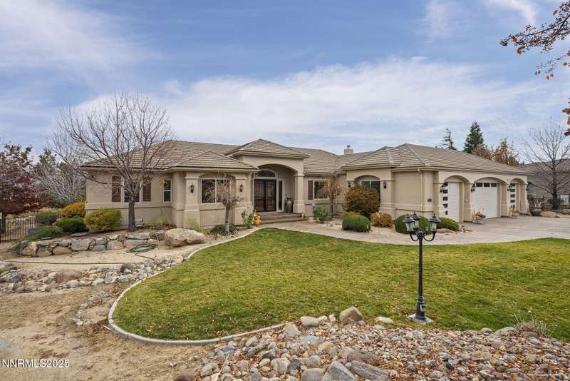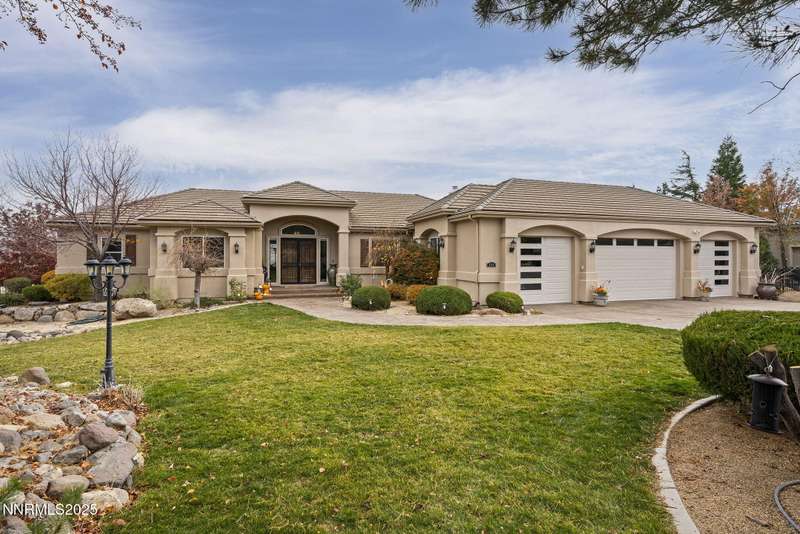 Experience luxury, space, and sophistication at 1255 Springer Court, a beautifully designed 3,373 sq. ft. residence offering 4 bedrooms, 3.5 bathrooms, and a flexible floorplan tailored for both comfort and entertainment. Perfectly situated on a 1.16-acre view lot within the prestigious gated Fairways at Fieldcreek community, this home captures sweeping vistas of the surrounding valley and mountains from nearly every room. A grand foyer welcomes you with dual custom wooden entry doors framed by decorative accent windows, soaring ceilings, and a stunning wrought-metal chandelier. The rich travertine flooring leads seamlessly to the formal dining and living rooms, where elegant design meets natural light. The living room features a high tray ceiling with can lighting, a sleek 8-blade ceiling fan, five picture windows showcasing the views, and French doors that open to the upper covered patio. The adjacent formal dining room offers ample space for large gatherings, a modern four-light chandelier, and a striking stone accent wall that elevates the room's character. The heart of the home lies in the gourmet kitchen, appointed with slab granite countertops, a large breakfast bar, and custom cabinetry with brushed nickel hardware, slide-out shelving, and under-cabinet lighting. KitchenAid appliances include a built-in oven, microwave, dishwasher, and a five-burner electric cooktop that complements the home's solar efficiency. A walk-in pantry provides additional storage, while pendant lighting defines both the breakfast bar and the cozy breakfast nook, framed by view windows that fill the space with morning light. The spacious family room offers a relaxed yet refined ambiance with vaulted ceilings, a travertine-tiled gas fireplace, and a custom niche for the television. Large windows draw in warm natural light and frame sweeping valley views, while French doors open to the covered patio — ideal for indoor-outdoor entertaining. The main-level primary suite provides a tranquil retreat, complete with a tray ceiling, recessed lighting, ceiling fan, and private access to the patio. The spa-like primary bathroom showcases dual travertine-topped vanities, brushed nickel fixtures, a jetted soaking tub, a frameless glass walk-in shower with decorative stone accents, and a generous walk-in closet. A guest bedroom and full bath are conveniently located across the hall, while a stylish half bath near the family room features a custom copper vessel sink and vanity. Downstairs, a large and versatile game room offers endless possibilities for recreation or entertainment, enhanced by a full wet bar with tile counters, bar seating, and a gas fireplace framed by a white paneled mantle and travertine surround. Sliding glass doors open to the lower covered patio and backyard. Two spacious guest bedrooms and a shared full bath complete the lower level, creating an ideal setup for family, guests, or multi-generational living. Exterior highlights are equally impressive. The home features newer elastomeric paint, a tile roof, and stucco exterior. Stone pillars with integrated lighting complement the entrance to the sweeping stamped concrete driveway. A newly installed staircase connects the upper and lower patios, while the grounds feature a slate garden dining area, raised garden beds, and lush landscaping maintained by a multi-zone irrigation system with automatic drip. Energy efficiency takes center stage with a roof mounted solar array connected to NV Energy's net metering program—keeping the average power bill to an incredibly low 55.82 per month—and a brand new 2024 heat pump for efficient heating and cooling. Additional amenities include a finished oversized 4-car garage with new contemporary glass-paneled doors, interior and man-door access, a Ring Video Doorbell, and a security system. Located conveniently in South Reno close to shopping, dining, and schools, this home offers easy access to the area's finest recreation and amenities.