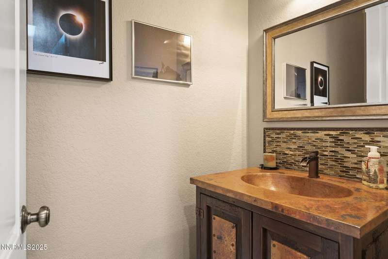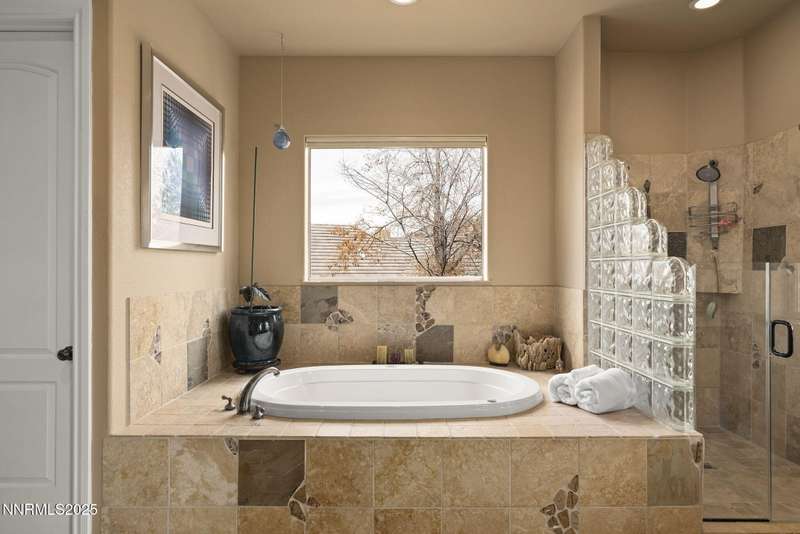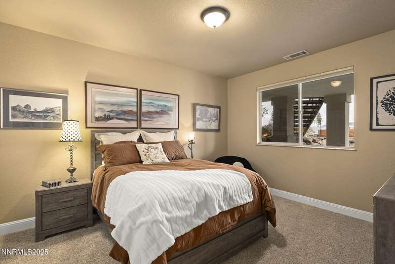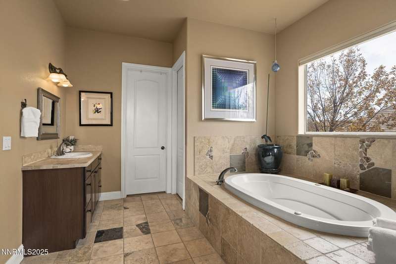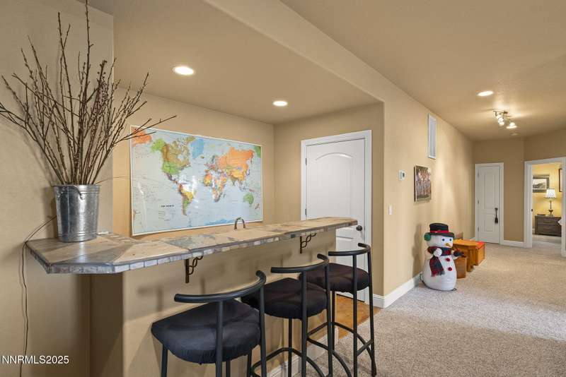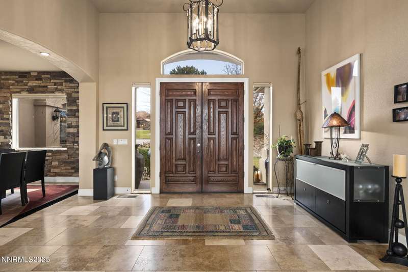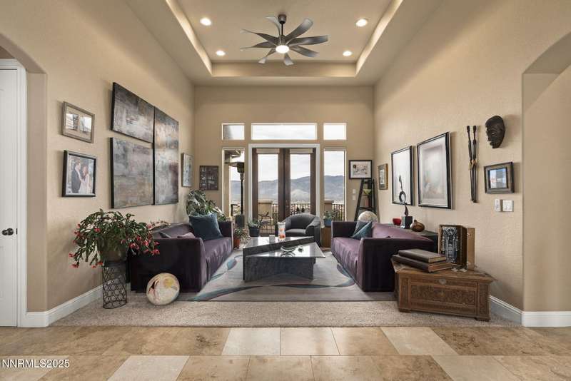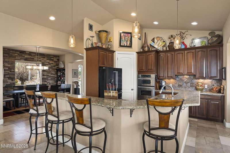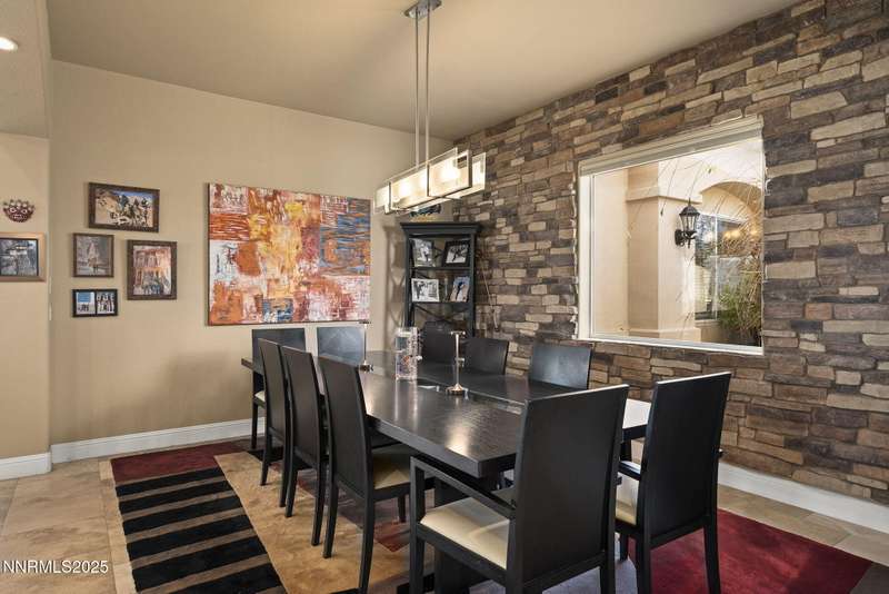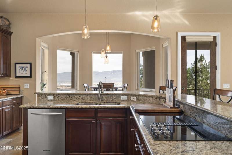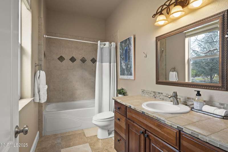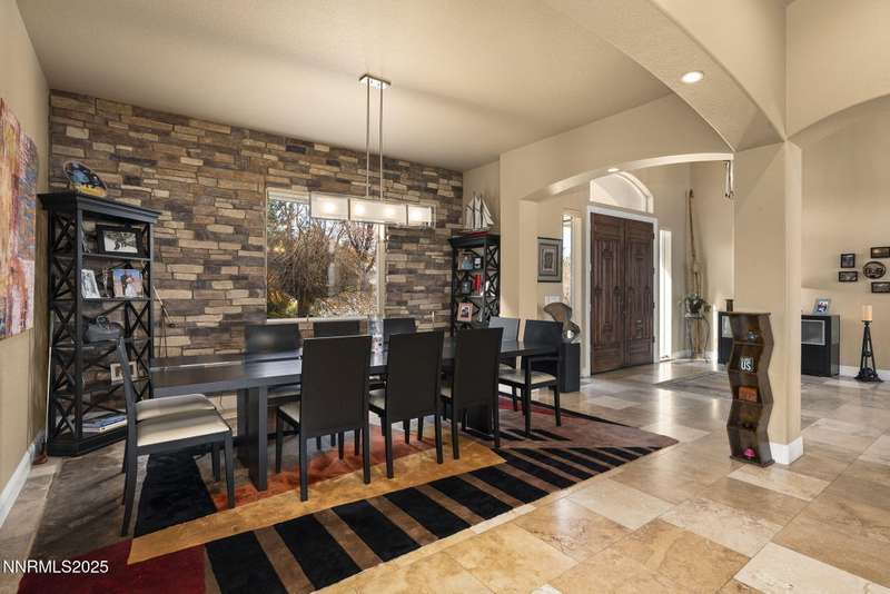 Experience luxury, space, and sophistication at 1255 Springer Court, a beautifully designed 3,373 sq. ft. residence offering 4 bedrooms, 3.5 bathrooms, and a flexible floorplan tailored for both comfort and entertainment. Perfectly situated on a 1.16-acre view lot within the prestigious gated Fairways at Fieldcreek community, this home captures sweeping vistas of the surrounding valley and mountains from nearly every room. A grand foyer welcomes you with dual custom wooden entry doors framed by decorative accent windows, soaring ceilings, and a stunning wrought-metal chandelier. The rich travertine flooring leads seamlessly to the formal dining and living rooms, where elegant design meets natural light. The living room features a high tray ceiling with can lighting, a sleek 8-blade ceiling fan, five picture windows showcasing the views, and French doors that open to the upper covered patio. The adjacent formal dining room offers ample space for large gatherings, a modern four-light chandelier, and a striking stone accent wall that elevates the room's character. The heart of the home lies in the gourmet kitchen, appointed with slab granite countertops, a large breakfast bar, and custom cabinetry with brushed nickel hardware, slide-out shelving, and under-cabinet lighting. KitchenAid appliances include a built-in oven, microwave, dishwasher, and a five-burner electric cooktop that complements the home's solar efficiency. A walk-in pantry provides additional storage, while pendant lighting defines both the breakfast bar and the cozy breakfast nook, framed by view windows that fill the space with morning light. The spacious family room offers a relaxed yet refined ambiance with vaulted ceilings, a travertine-tiled gas fireplace, and a custom niche for the television. Large windows draw in warm natural light and frame sweeping valley views, while French doors open to the covered patio — ideal for indoor-outdoor entertaining. The main-level primary suite provides a tranquil retreat, complete with a tray ceiling, recessed lighting, ceiling fan, and private access to the patio. The spa-like primary bathroom showcases dual travertine-topped vanities, brushed nickel fixtures, a jetted soaking tub, a frameless glass walk-in shower with decorative stone accents, and a generous walk-in closet. A guest bedroom and full bath are conveniently located across the hall, while a stylish half bath near the family room features a custom copper vessel sink and vanity. Downstairs, a large and versatile game room offers endless possibilities for recreation or entertainment, enhanced by a full wet bar with tile counters, bar seating, and a gas fireplace framed by a white paneled mantle and travertine surround. Sliding glass doors open to the lower covered patio and backyard. Two spacious guest bedrooms and a shared full bath complete the lower level, creating an ideal setup for family, guests, or multi-generational living. Exterior highlights are equally impressive. The home features newer elastomeric paint, a tile roof, and stucco exterior. Stone pillars with integrated lighting complement the entrance to the sweeping stamped concrete driveway. A newly installed staircase connects the upper and lower patios, while the grounds feature a slate garden dining area, raised garden beds, and lush landscaping maintained by a multi-zone irrigation system with automatic drip. Energy efficiency takes center stage with a roof mounted solar array connected to NV Energy's net metering program—keeping the average power bill to an incredibly low 55.82 per month—and a brand new 2024 heat pump for efficient heating and cooling. Additional amenities include a finished oversized 4-car garage with new contemporary glass-paneled doors, interior and man-door access, a Ring Video Doorbell, and a security system. Located conveniently in South Reno close to shopping, dining, and schools, this home offers easy access to the area's finest recreation and amenities.
