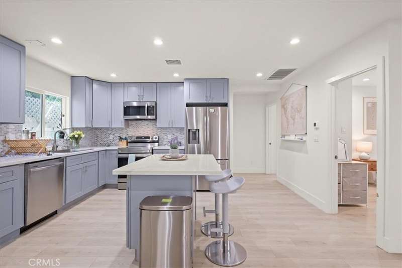 Welcome to this beautifully remodeled and fully fenced single story home, offering 3 bedrooms and 2 bathrooms, plus a private 1 bedroom, 1 bath attic conversion with its own entrance—perfect for guests, extended family, or short term rental income. Step inside to an open, light filled floor plan featuring a spacious living room with a fireplace, an inviting dining area, and an expansive kitchen designed for both style and function. The kitchen boasts a large center island, quartz countertops, abundant cabinetry, and stainless steel appliances including a stove, refrigerator, dishwasher, and microwave. The primary bedroom offers a private ensuite bath, while two additional bedrooms share a full hallway bathroom. Throughout the home, you’ll find durable vinyl plank flooring, recessed lighting, newer windows, central A/C and heat, a tankless water heater, and a convenient laundry closet. The upstairs converted unit provides added versatility with a comfortable living space, bedroom, kitchenette with dishwasher, and a stylish bathroom featuring a barn door. Can easily become part of the main residence. Outdoors, enjoy a private wood deck perfect for relaxing or entertaining, and a gated driveway with parking for up to three cars. Situated in a desirable Mid-Wilshire location, you’ll be minutes from Paramount Studios, Larchmont Village, Hollywood, the Wilshire Country Club, DTLA, Koreatown, and the 101 Freeway. Whether you’re seeking a move-in-ready residence with modern amenities or an investment opportunity with income potential, this home offers exceptional value in a prime location.