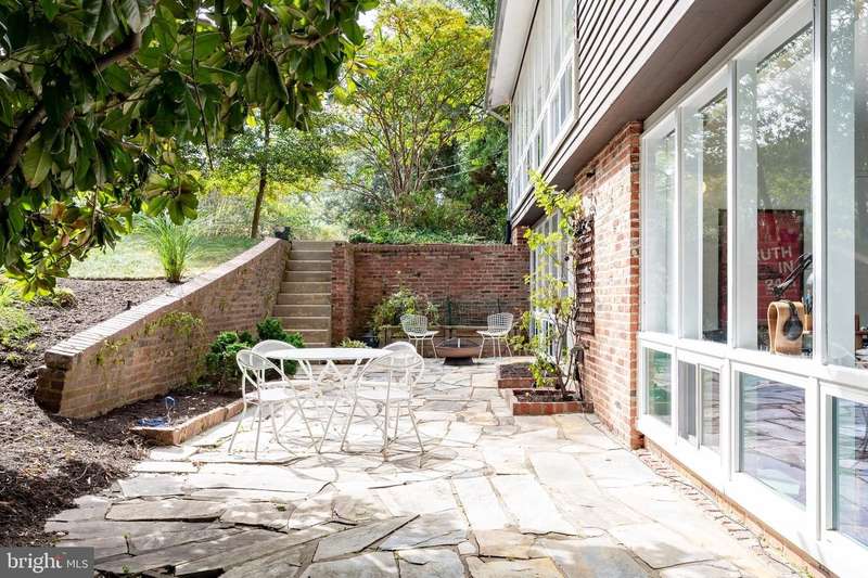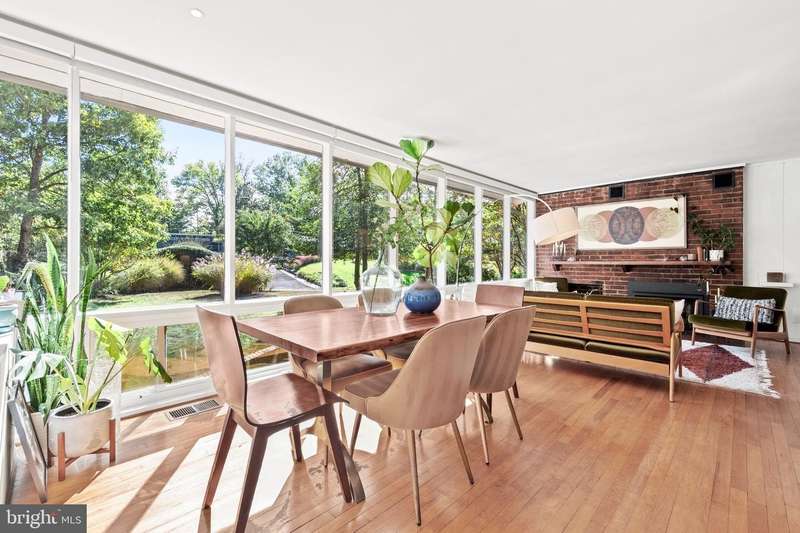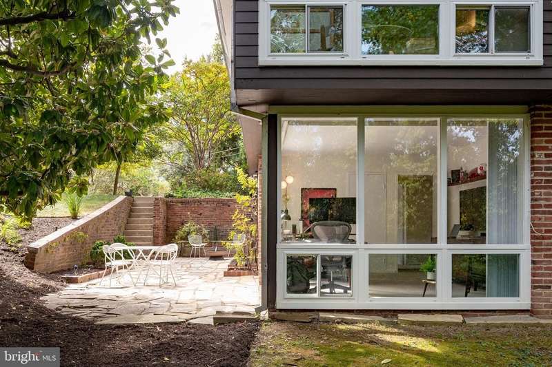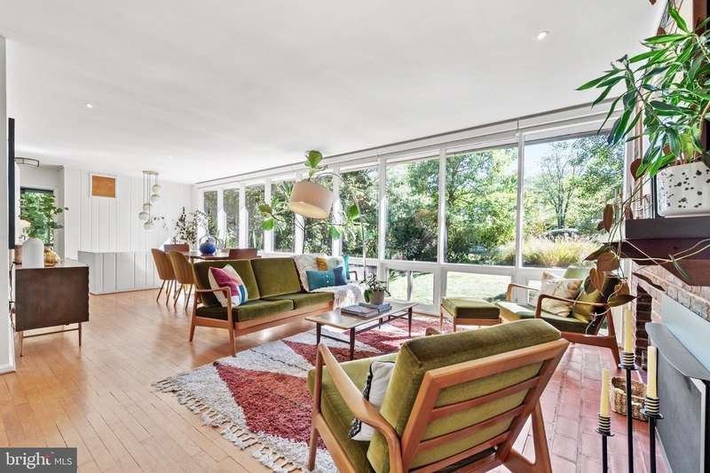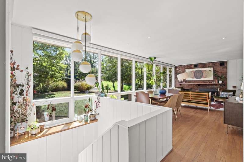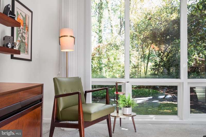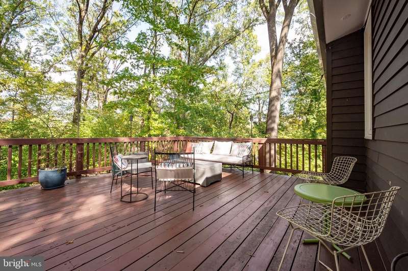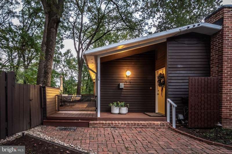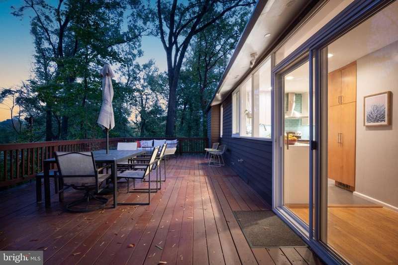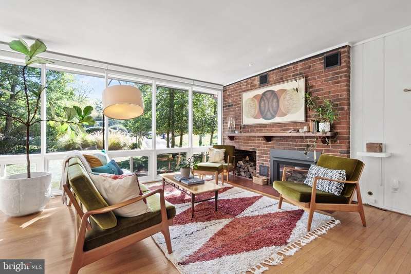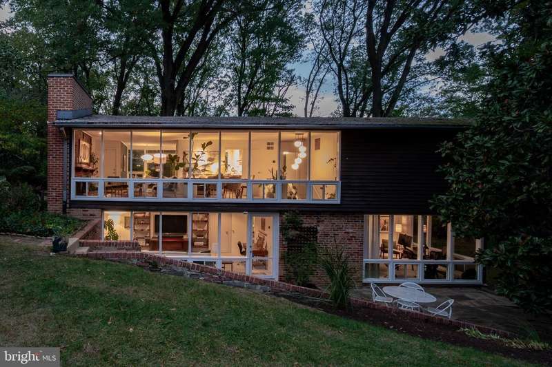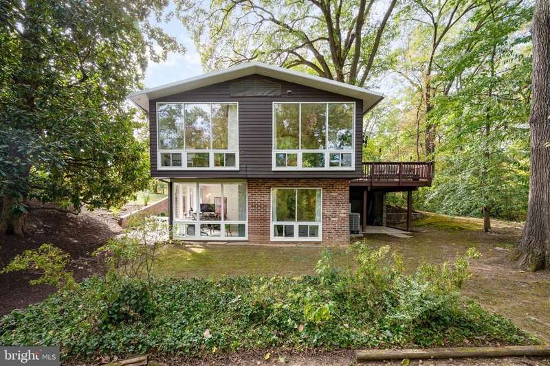 Nestled in the highly sought-after Hollin Hills Mid-Century Modern community, this stunning home on Marthas Road sits on a private, .42-acre lot that backs to serene, wooded views. Designed by renowned architect Charles Goodman, this two-story residence is flooded with natural light through its iconic floor-to-ceiling windows. The open floor plan highlights a gas fireplace set into an exposed brick wall, beautifully refinished original white oak flooring, and expansive living areas perfect for both relaxing and entertaining. A separate dining room features a sliding glass door that opens to an impressive 450-square-foot deck built around a mature tree, offering ample space for dining and lounging while overlooking the tranquil landscape. The kitchen was fully remodeled in 2019 and boasts custom maple cabinetry, stainless steel appliances, waterfall quartz countertops, and a vintage-inspired glass tile backsplash. The main level includes two spacious bedrooms, including a primary with a closet bump-out, and an expanded full bathroom that exceeds the original footprint. An open staircase leads to the lower level, where a large family room with a second fireplace and walls of windows connects to a slate patio area framed by raised planting beds and a privacy-enhancing brick wall. Additional features include a generous laundry room with yard access, a large utility room with built-in shelving, and abundant storage throughout. The professionally landscaped lot is enhanced by mature plantings, towering trees, in-ground sprinkler system as well as a home electric car charging station. Hollin Hills offers membership to 2 community pools as well as membership to a tennis and pickleball club. The scenic neighborhood boasts 7 parks, trails, an active Civic Association with seasonal celebrations, delicious super society and a friendly, close-knit environment. A commuter's dream location minutes from GW Parkway and trails, DC & the Pentagon; and south to Fort Belvoir, or north to Andrews AFB & Tysons Corner via I-495. This exceptional Mid-Century Modern home has been thoughtfully updated without losing the vintage feel throughout.