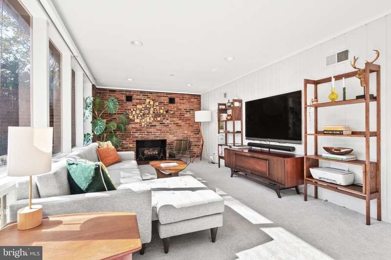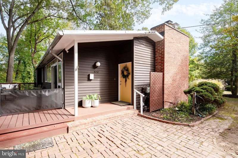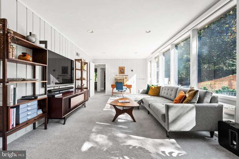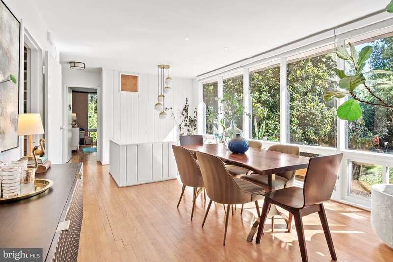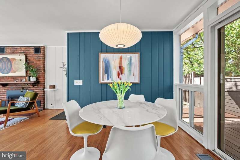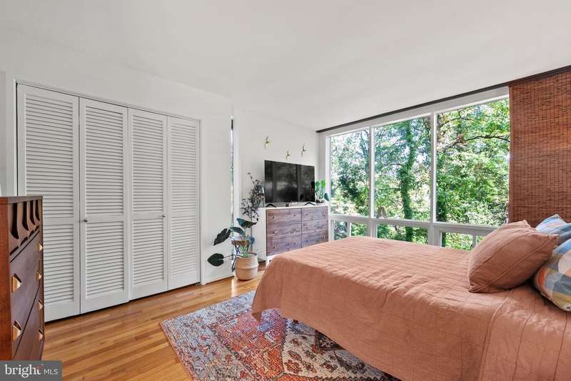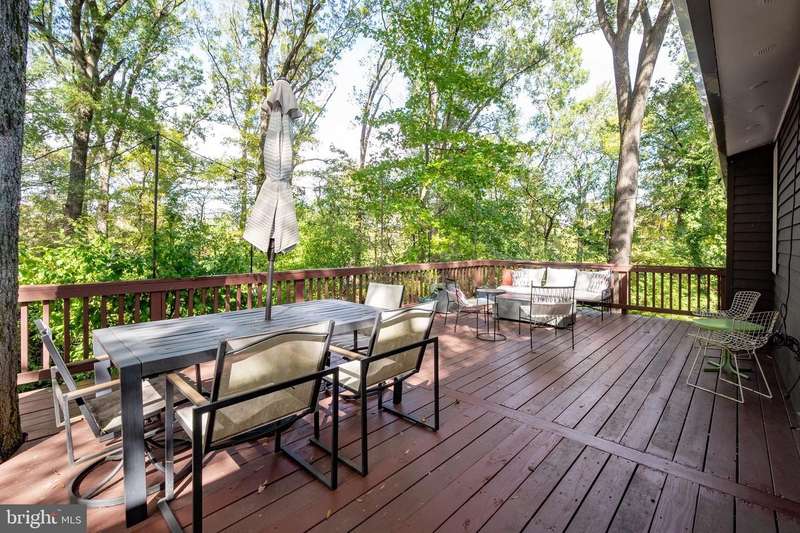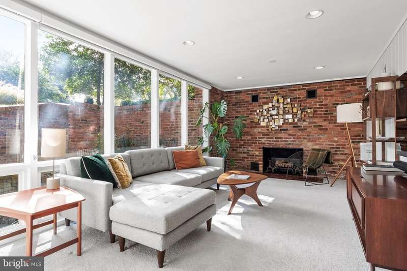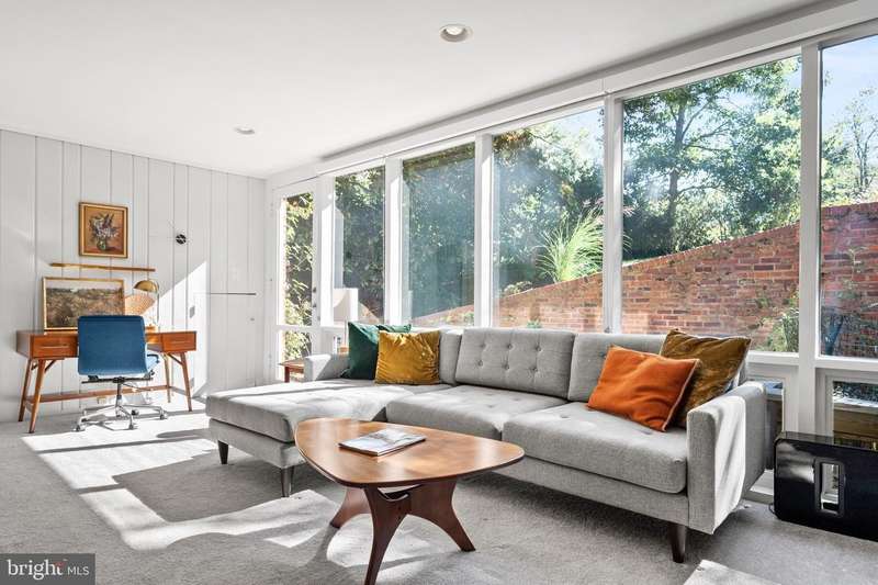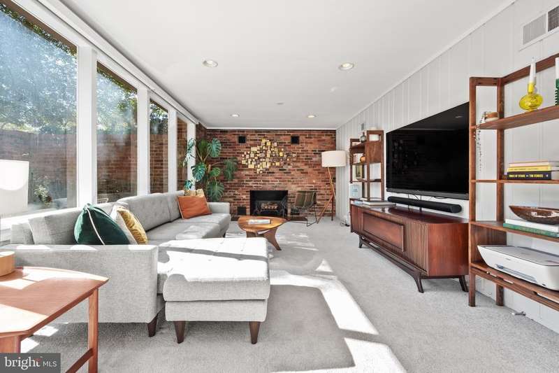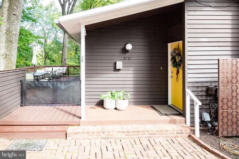 Nestled in the highly sought-after Hollin Hills Mid-Century Modern community, this stunning home on Marthas Road sits on a private, .42-acre lot that backs to serene, wooded views. Designed by renowned architect Charles Goodman, this two-story residence is flooded with natural light through its iconic floor-to-ceiling windows. The open floor plan highlights a gas fireplace set into an exposed brick wall, beautifully refinished original white oak flooring, and expansive living areas perfect for both relaxing and entertaining. A separate dining room features a sliding glass door that opens to an impressive 450-square-foot deck built around a mature tree, offering ample space for dining and lounging while overlooking the tranquil landscape. The kitchen was fully remodeled in 2019 and boasts custom maple cabinetry, stainless steel appliances, waterfall quartz countertops, and a vintage-inspired glass tile backsplash. The main level includes two spacious bedrooms, including a primary with a closet bump-out, and an expanded full bathroom that exceeds the original footprint. An open staircase leads to the lower level, where a large family room with a second fireplace and walls of windows connects to a slate patio area framed by raised planting beds and a privacy-enhancing brick wall. Additional features include a generous laundry room with yard access, a large utility room with built-in shelving, and abundant storage throughout. The professionally landscaped lot is enhanced by mature plantings, towering trees, in-ground sprinkler system as well as a home electric car charging station. Hollin Hills offers membership to 2 community pools as well as membership to a tennis and pickleball club. The scenic neighborhood boasts 7 parks, trails, an active Civic Association with seasonal celebrations, delicious super society and a friendly, close-knit environment. A commuter's dream location minutes from GW Parkway and trails, DC & the Pentagon; and south to Fort Belvoir, or north to Andrews AFB & Tysons Corner via I-495. This exceptional Mid-Century Modern home has been thoughtfully updated without losing the vintage feel throughout.