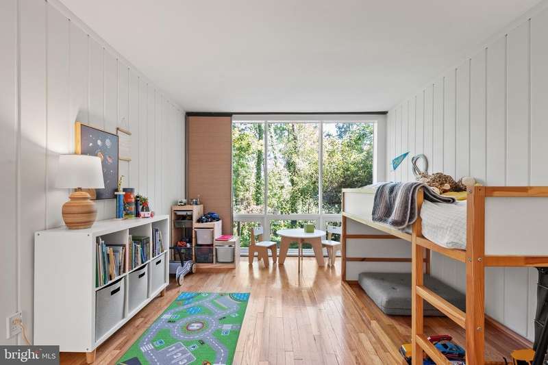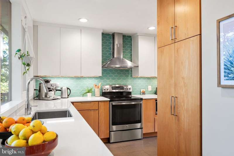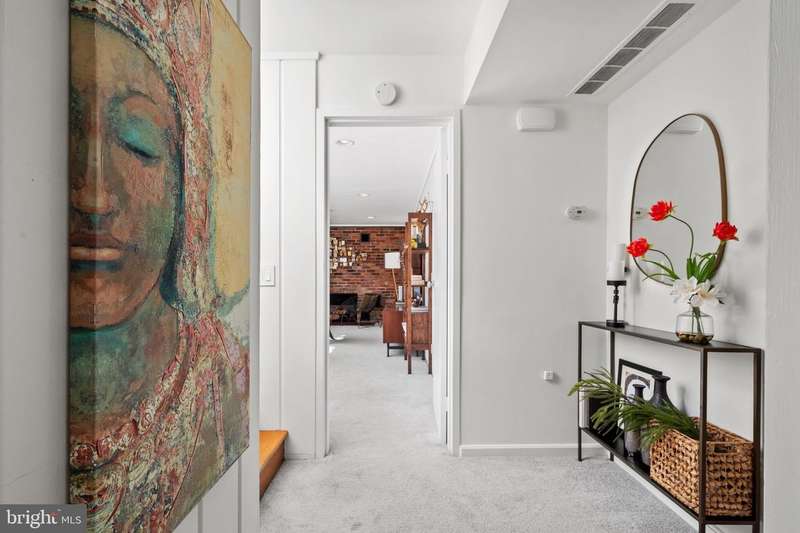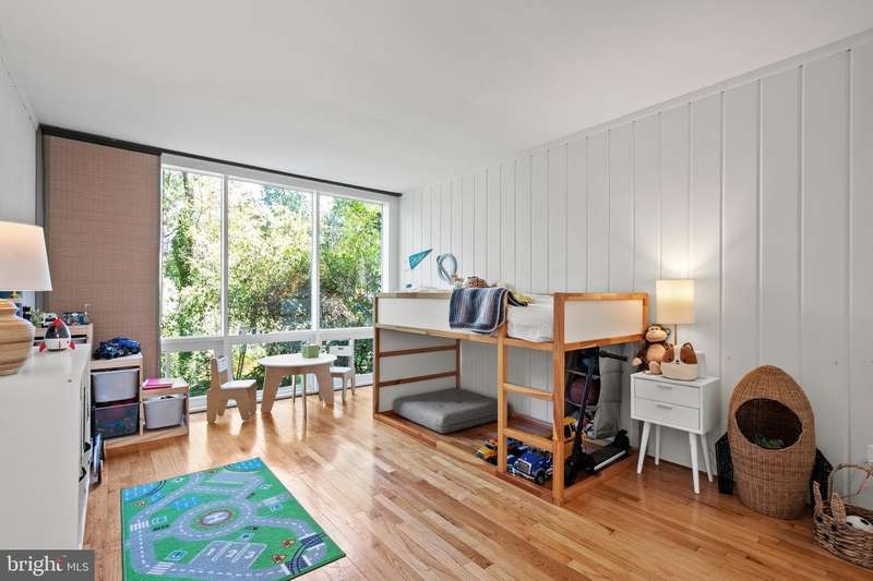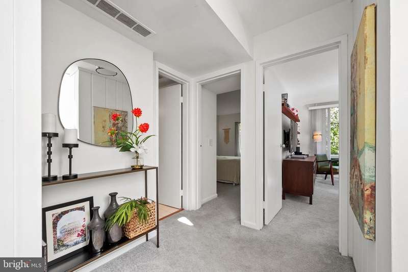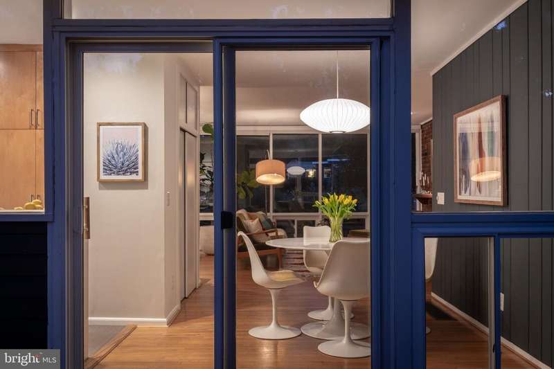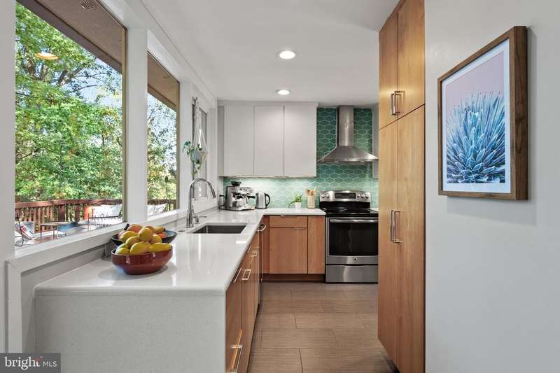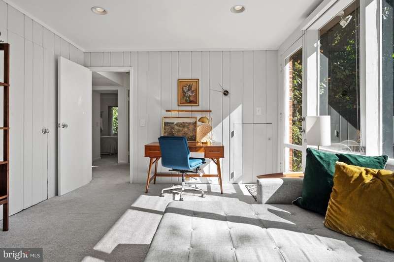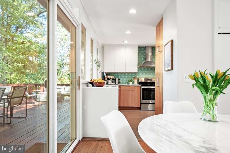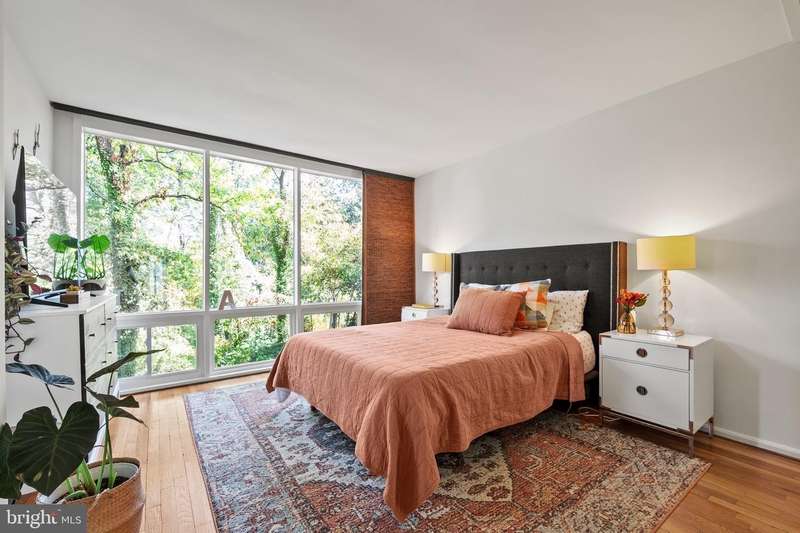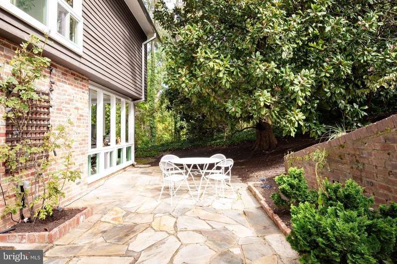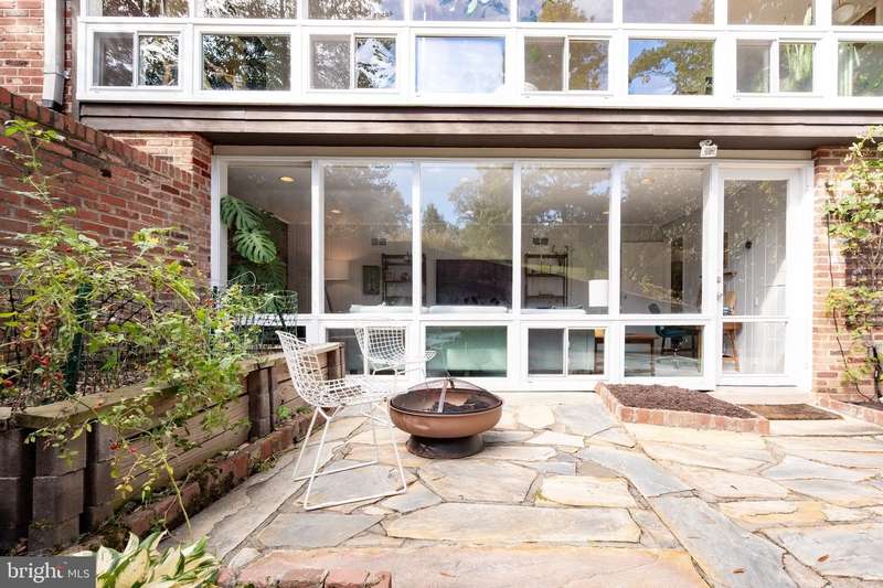 Nestled in the highly sought-after Hollin Hills Mid-Century Modern community, this stunning home on Marthas Road sits on a private, .42-acre lot that backs to serene, wooded views. Designed by renowned architect Charles Goodman, this two-story residence is flooded with natural light through its iconic floor-to-ceiling windows. The open floor plan highlights a gas fireplace set into an exposed brick wall, beautifully refinished original white oak flooring, and expansive living areas perfect for both relaxing and entertaining. A separate dining room features a sliding glass door that opens to an impressive 450-square-foot deck built around a mature tree, offering ample space for dining and lounging while overlooking the tranquil landscape. The kitchen was fully remodeled in 2019 and boasts custom maple cabinetry, stainless steel appliances, waterfall quartz countertops, and a vintage-inspired glass tile backsplash. The main level includes two spacious bedrooms, including a primary with a closet bump-out, and an expanded full bathroom that exceeds the original footprint. An open staircase leads to the lower level, where a large family room with a second fireplace and walls of windows connects to a slate patio area framed by raised planting beds and a privacy-enhancing brick wall. Additional features include a generous laundry room with yard access, a large utility room with built-in shelving, and abundant storage throughout. The professionally landscaped lot is enhanced by mature plantings, towering trees, in-ground sprinkler system as well as a home electric car charging station. Hollin Hills offers membership to 2 community pools as well as membership to a tennis and pickleball club. The scenic neighborhood boasts 7 parks, trails, an active Civic Association with seasonal celebrations, delicious super society and a friendly, close-knit environment. A commuter's dream location minutes from GW Parkway and trails, DC & the Pentagon; and south to Fort Belvoir, or north to Andrews AFB & Tysons Corner via I-495. This exceptional Mid-Century Modern home has been thoughtfully updated without losing the vintage feel throughout.