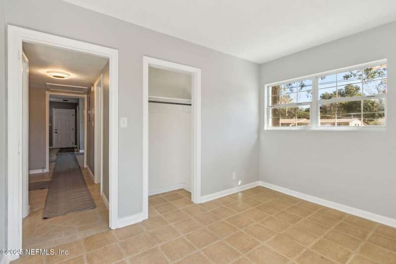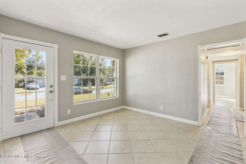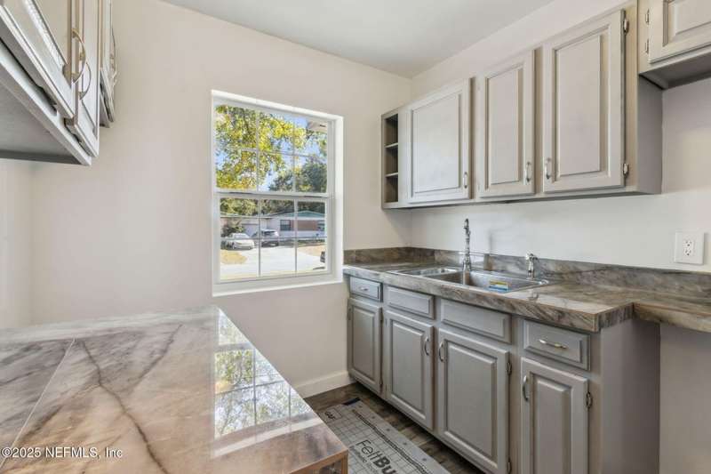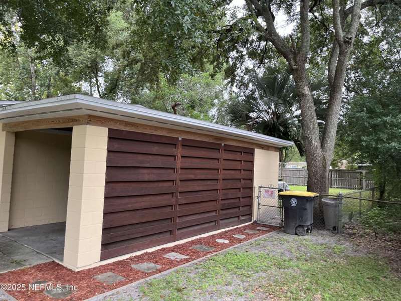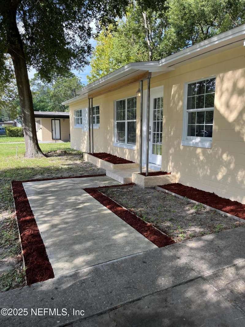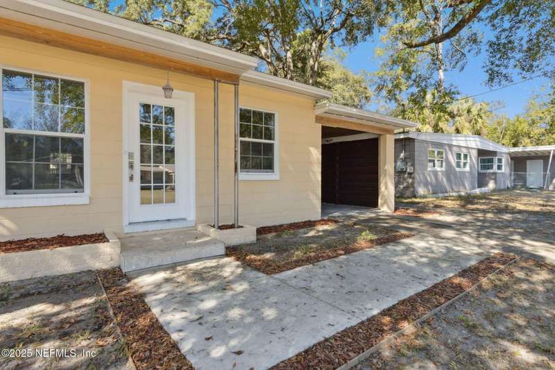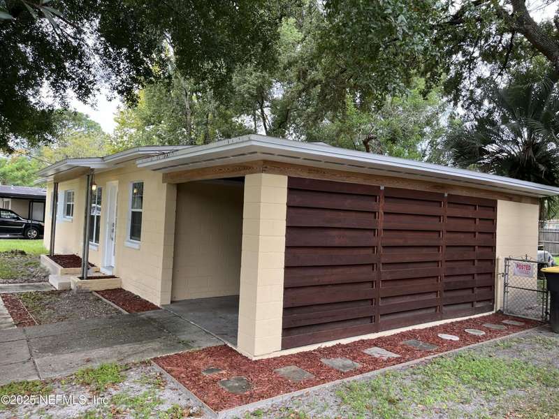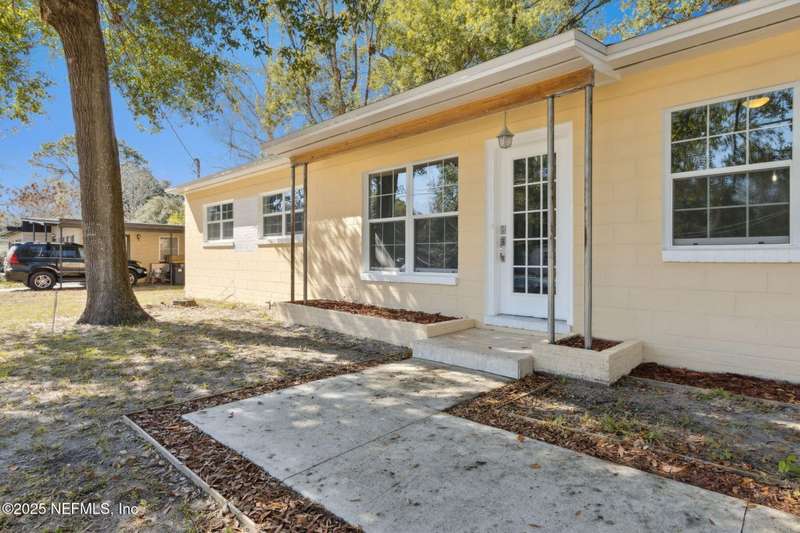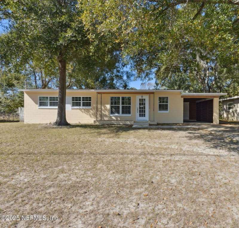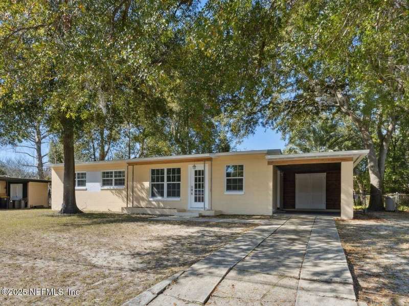 This renovated 4 BR, 2 BA concrete block home is located in a sought-after well-established neighborhood. A fresh coat of interior and exterior paint, along with new attic insulation, the home features new fixtures in bathrooms and kitchen. Other extras includes a new roof in 2022, newer windows and duct work. The bonus room, has its own private entrance and en-suite kitchenette - ideal for a home office or in-law suite. Parking is a spacious covered carport with a large laundry room behind double doors including EZ access to dyer vent cleaning. The fully fenced backyard is perfect for outdoor entertaining. The property is conveniently located near shopping, dining, plus NAS Jax, and Florida State College - Kent Campus. Easy access to I-10, I-295, and I-95 makes commuting a breeze.